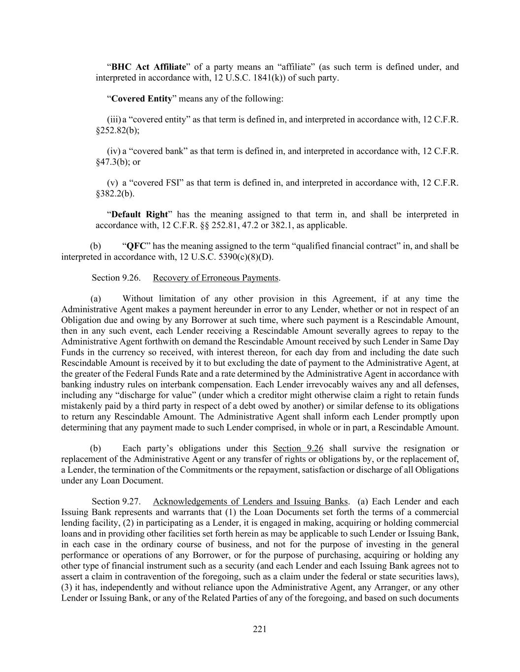 221 “BHC Act Affiliate” of a party means an “affiliate” (as such term is defined under, and interpreted in accordance with, 12 U.S.C. 1841(k)) of such party. “Covered Entity” means any of the following: (iii) a “covered entity” as that term is defined in, and interpreted in accordance with, 12 C.F.R. §252.82(b); (iv) a “covered bank” as that term is defined in, and interpreted in accordance with, 12 C.F.R. §47.3(b); or (v) a “covered FSI” as that term is defined in, and interpreted in accordance with, 12 C.F.R. §382.2(b). “Default Right” has the meaning assigned to that term in, and shall be interpreted in accordance with, 12 C.F.R. §§ 252.81, 47.2 or 382.1, as applicable. (b) “QFC” has the meaning assigned to the term “qualified financial contract” in, and shall be interpreted in accordance with, 12 U.S.C. 5390(c)(8)(D). Section 9.26. Recovery of Erroneous Payments. (a) Without limitation of any other provision in this Agreement, if at any time the Administrative Agent makes a payment hereunder in error to any Lender, whether or not in respect of an Obligation due and owing by any Borrower at such time, where such payment is a Rescindable Amount, then in any such event, each Lender receiving a Rescindable Amount severally agrees to repay to the Administrative Agent forthwith on demand the Rescindable Amount received by such Lender in Same Day Funds in the currency so received, with interest thereon, for each day from and including the date such Rescindable Amount is received by it to but excluding the date of payment to the Administrative Agent, at the greater of the Federal Funds Rate and a rate determined by the Administrative Agent in accordance with banking industry rules on interbank compensation. Each Lender irrevocably waives any and all defenses, including any “discharge for value” (under which a creditor might otherwise claim a right to retain funds mistakenly paid by a third party in respect of a debt owed by another) or similar defense to its obligations to return any Rescindable Amount. The Administrative Agent shall inform each Lender promptly upon determining that any payment made to such Lender comprised, in whole or in part, a Rescindable Amount. (b) Each party’s obligations under this Section 9.26 shall survive the resignation or replacement of the Administrative Agent or any transfer of rights or obligations by, or the replacement of, a Lender, the termination of the Commitments or the repayment, satisfaction or discharge of all Obligations under any Loan Document. Section 9.27. Acknowledgements of Lenders and Issuing Banks. (a) Each Lender and each Issuing Bank represents and warrants that (1) the Loan Documents set forth the terms of a commercial lending facility, (2) in participating as a Lender, it is engaged in making, acquiring or holding commercial loans and in providing other facilities set forth herein as may be applicable to such Lender or Issuing Bank, in each case in the ordinary course of business, and not for the purpose of investing in the general performance or operations of any Borrower, or for the purpose of purchasing, acquiring or holding any other type of financial instrument such as a security (and each Lender and each Issuing Bank agrees not to assert a claim in contravention of the foregoing, such as a claim under the federal or state securities laws), (3) it has, independently and without reliance upon the Administrative Agent, any Arranger, or any other Lender or Issuing Bank, or any of the Related Parties of any of the foregoing, and based on such documents