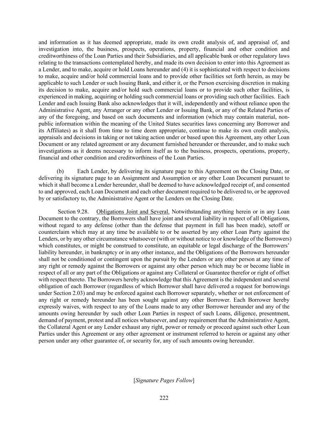 222 and information as it has deemed appropriate, made its own credit analysis of, and appraisal of, and investigation into, the business, prospects, operations, property, financial and other condition and creditworthiness of the Loan Parties and their Subsidiaries, and all applicable bank or other regulatory laws relating to the transactions contemplated hereby, and made its own decision to enter into this Agreement as a Lender, and to make, acquire or hold Loans hereunder and (4) it is sophisticated with respect to decisions to make, acquire and/or hold commercial loans and to provide other facilities set forth herein, as may be applicable to such Lender or such Issuing Bank, and either it, or the Person exercising discretion in making its decision to make, acquire and/or hold such commercial loans or to provide such other facilities, is experienced in making, acquiring or holding such commercial loans or providing such other facilities. Each Lender and each Issuing Bank also acknowledges that it will, independently and without reliance upon the Administrative Agent, any Arranger or any other Lender or Issuing Bank, or any of the Related Parties of any of the foregoing, and based on such documents and information (which may contain material, non- public information within the meaning of the United States securities laws concerning any Borrower and its Affiliates) as it shall from time to time deem appropriate, continue to make its own credit analysis, appraisals and decisions in taking or not taking action under or based upon this Agreement, any other Loan Document or any related agreement or any document furnished hereunder or thereunder, and to make such investigations as it deems necessary to inform itself as to the business, prospects, operations, property, financial and other condition and creditworthiness of the Loan Parties. (b) Each Lender, by delivering its signature page to this Agreement on the Closing Date, or delivering its signature page to an Assignment and Assumption or any other Loan Document pursuant to which it shall become a Lender hereunder, shall be deemed to have acknowledged receipt of, and consented to and approved, each Loan Document and each other document required to be delivered to, or be approved by or satisfactory to, the Administrative Agent or the Lenders on the Closing Date. Section 9.28. Obligations Joint and Several. Notwithstanding anything herein or in any Loan Document to the contrary, the Borrowers shall have joint and several liability in respect of all Obligations, without regard to any defense (other than the defense that payment in full has been made), setoff or counterclaim which may at any time be available to or be asserted by any other Loan Party against the Lenders, or by any other circumstance whatsoever (with or without notice to or knowledge of the Borrowers) which constitutes, or might be construed to constitute, an equitable or legal discharge of the Borrowers’ liability hereunder, in bankruptcy or in any other instance, and the Obligations of the Borrowers hereunder shall not be conditioned or contingent upon the pursuit by the Lenders or any other person at any time of any right or remedy against the Borrowers or against any other person which may be or become liable in respect of all or any part of the Obligations or against any Collateral or Guarantee therefor or right of offset with respect thereto. The Borrowers hereby acknowledge that this Agreement is the independent and several obligation of each Borrower (regardless of which Borrower shall have delivered a request for borrowings under Section 2.03) and may be enforced against each Borrower separately, whether or not enforcement of any right or remedy hereunder has been sought against any other Borrower. Each Borrower hereby expressly waives, with respect to any of the Loans made to any other Borrower hereunder and any of the amounts owing hereunder by such other Loan Parties in respect of such Loans, diligence, presentment, demand of payment, protest and all notices whatsoever, and any requirement that the Administrative Agent, the Collateral Agent or any Lender exhaust any right, power or remedy or proceed against such other Loan Parties under this Agreement or any other agreement or instrument referred to herein or against any other person under any other guarantee of, or security for, any of such amounts owing hereunder. [Signature Pages Follow]