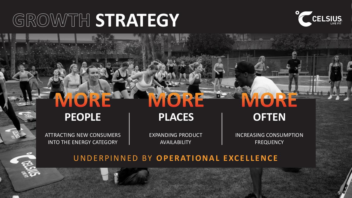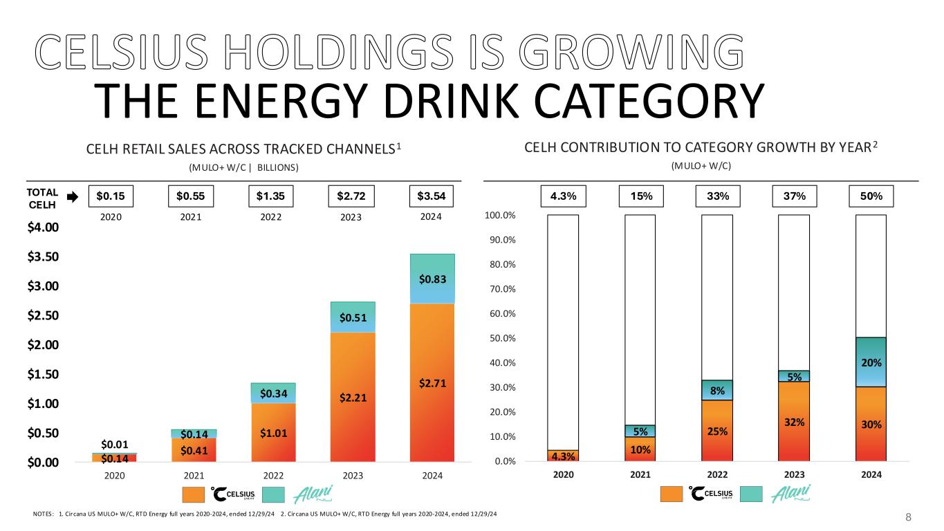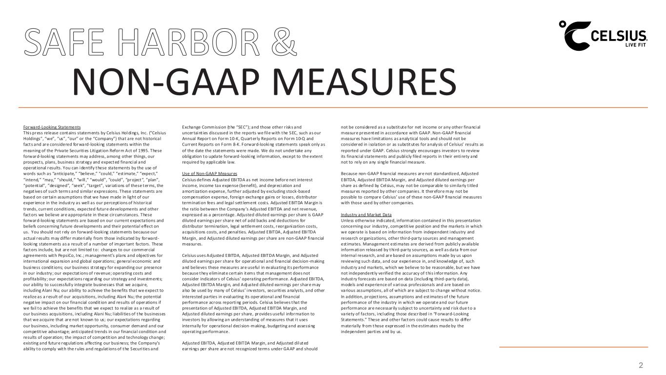 Forward-Looking Statements This press release contains statements by Celsius Holdings, Inc. (“Celsius Holdings”, “we”, “us”, “our” or the “Company”) that are not historical facts and are considered forward-looking statements within the meaning of the Private Securities Litigat ion Reform Act of 1995. These forward-looking statements may address, among other things, our prospects, plans, business st rategy and expected financial and operat ional results. You can identify these statements by the use of words such as “anticipate,” “believe,” “could,” “est imate,” “expect,” “intend,” “may,” “should,” “will ,” “would”, ”could”, ”project”, ”plan”, “potent ial”, ”designed”, “seek”, “target”, var iations of these terms, the negat ives of such terms and similar expressions. These statements are based on certain assumptions that we have made in light of our experience in the industry as well as our percept ions of historical trends, current conditions, expected future developments and other factors we believe are appropriate in these circumstances. These forward-looking statements are based on our current expectations and beliefs concerning future developments and their potential effect on us. You should not rely on forward-looking statements because our actual results may differ materially from those indicated by forward- looking statements as a result of a number of important factors. These factors include, but are not limited to: changes to our commercial agreements with PepsiCo, Inc.; management’s plans and objectives for international expansion and global operations; general economic and business condit ions; our business st rategy for expanding our presence in our industry ; our expectat ions of revenue; operating costs and profitability ; our expectat ions regarding our strategy and investments; our ability to successfully integrate businesses that we acquire, including Alani Nu; our ability to achieve the benefits that we expect to realize as a result of our acquisitions, including Alani Nu; the potential negat ive impact on our financial condit ion and results of operations if we fail to achieve the benefits that we expect to real ize as a result of our business acquisitions, including Alani Nu; l iabili ties of the businesses that we acquire that are not known to us; our expectations regarding our business, including market opportunity, consumer demand and our competit ive advantage; anticipated trends in our financial condition and results of operation; the impact of competit ion and technology change; existing and future regulations affecting our business; the Company’s abi lity to comply with the rules and regulat ions of the Securi ties and Exchange Commission (the “SEC”); and those other r isks and uncertaint ies discussed in the reports we file with the SEC, such as our Annual Report on Form 10-K, Quarter ly Reports on Form 10-Q and Current Reports on Form 8-K. Forward-looking statements speak only as of the date the statements were made. We do not undertake any obligation to update forward-looking information, except to the extent required by applicable law. Use of Non-GAAP Measures Celsius defines Adjusted EBITDA as net income before net interest income, income tax expense (benefit), and depreciation and amort ization expense, further adjusted by excluding stock-based compensation expense, foreign exchange gains or losses, distributor termination fees and legal sett lement costs. Adjusted EBITDA Margin is the ratio between the Company’s Adjusted EBITDA and net revenue, expressed as a percentage. Adjusted diluted earnings per share is GAAP diluted earnings per share net of add backs and deductions for distributor termination, legal settlement costs, reorganization costs, acquisitions costs, and penalties. Adjusted EBITDA, Adjusted EBITDA Margin, and Adjusted diluted earnings per share are non-GAAP financial measures. Celsius uses Adjusted EBITDA, Adjusted EBITDA Margin, and Adjusted diluted earnings per share for operational and financial decision-making and believes these measures are useful in evaluating it s performance because they eliminate certain items that management does not consider indicators of Celsius’ operating performance. Adjusted EBITDA, Adjusted EBITDA Margin, and Adjusted diluted earnings per share may also be used by many of Celsius’ investors, securities analysts, and other interested parties in evaluating its operational and financial performance across reporting periods. Celsius believes that the presentation of Adjusted EBITDA, Adjusted EBITDA Margin, and Adjusted diluted earnings per share, provides useful information to investors by allowing an understanding of measures that i t uses internally for operational decision-making, budgeting and assessing operat ing performance. Adjusted EBITDA, Adjusted EBITDA Margin, and Adjusted diluted earnings per share are not recognized terms under GAAP and should not be considered as a substitute for net income or any other financial measure presented in accordance with GAAP. Non-GAAP financial measures have l imitations as analytical tools and should not be considered in i solation or as substitutes for analysis of Celsius’ results as reported under GAAP. Celsius strongly encourages investors to review its financial statements and publ icly filed reports in their enti rety and not to rely on any single financial measure. Because non-GAAP financial measures are not standardized, Adjusted EBITDA, Adjusted EBITDA Margin, and Adjusted diluted earnings per share as defined by Celsius, may not be comparable to similarly t itled measures reported by other companies. It therefore may not be possible to compare Celsius’ use of these non-GAAP financial measures with those used by other companies. Industry and Market Data Unless otherwise indicated, informat ion contained in this presentation concerning our industry , compet