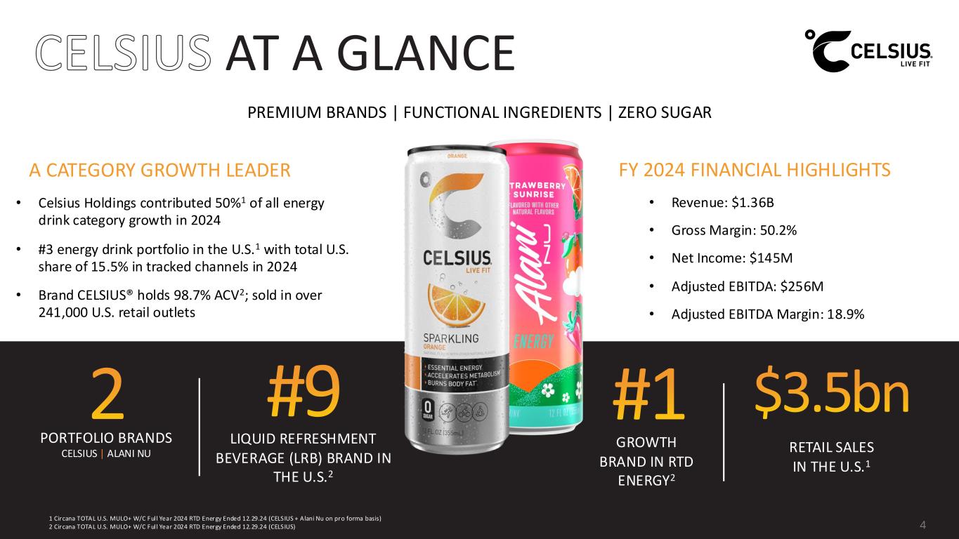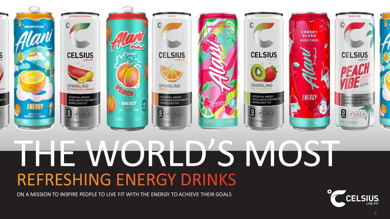 CELSIUS AT A GLANCE 2 PORTFOLIO BRANDS CELSIUS | ALANI NU #1 $3.5bn GROWTH BRAND IN RTD ENERGY2 RETAIL SALES IN THE U.S.1 FY 2024 FINANCIAL HIGHLIGHTSA CATEGORY GROWTH LEADER • Revenue: $1.36B • Gross Margin: 50.2% • Net Income: $145M • Adjusted EBITDA: $256M • Adjusted EBITDA Margin: 18.9% • Celsius Holdings contributed 50%1 of all energy drink category growth in 2024​ • #3 energy drink portfolio in the U.S.1 with total U.S. share of 15.5% in tracked channels in 2024​ • Brand CELSIUS® holds 98.7% ACV2; sold in over 241,000 U.S. retail outlets 1 Circana TOTAL U.S. MULO+ W/C Ful l Year 2024 RTD Energy Ended 12.29.24 (CELSIUS + Alani Nu on pro forma basis) 2 Circana TOTAL U.S. MULO+ W/C Ful l Year 2024 RTD Energy Ended 12.29.24 (CELSIUS) LIQUID REFRESHMENT BEVERAGE (LRB) BRAND IN THE U.S.2 #9 PREMIUM BRANDS | FUNCTIONAL INGREDIENTS | ZERO SUGAR 4