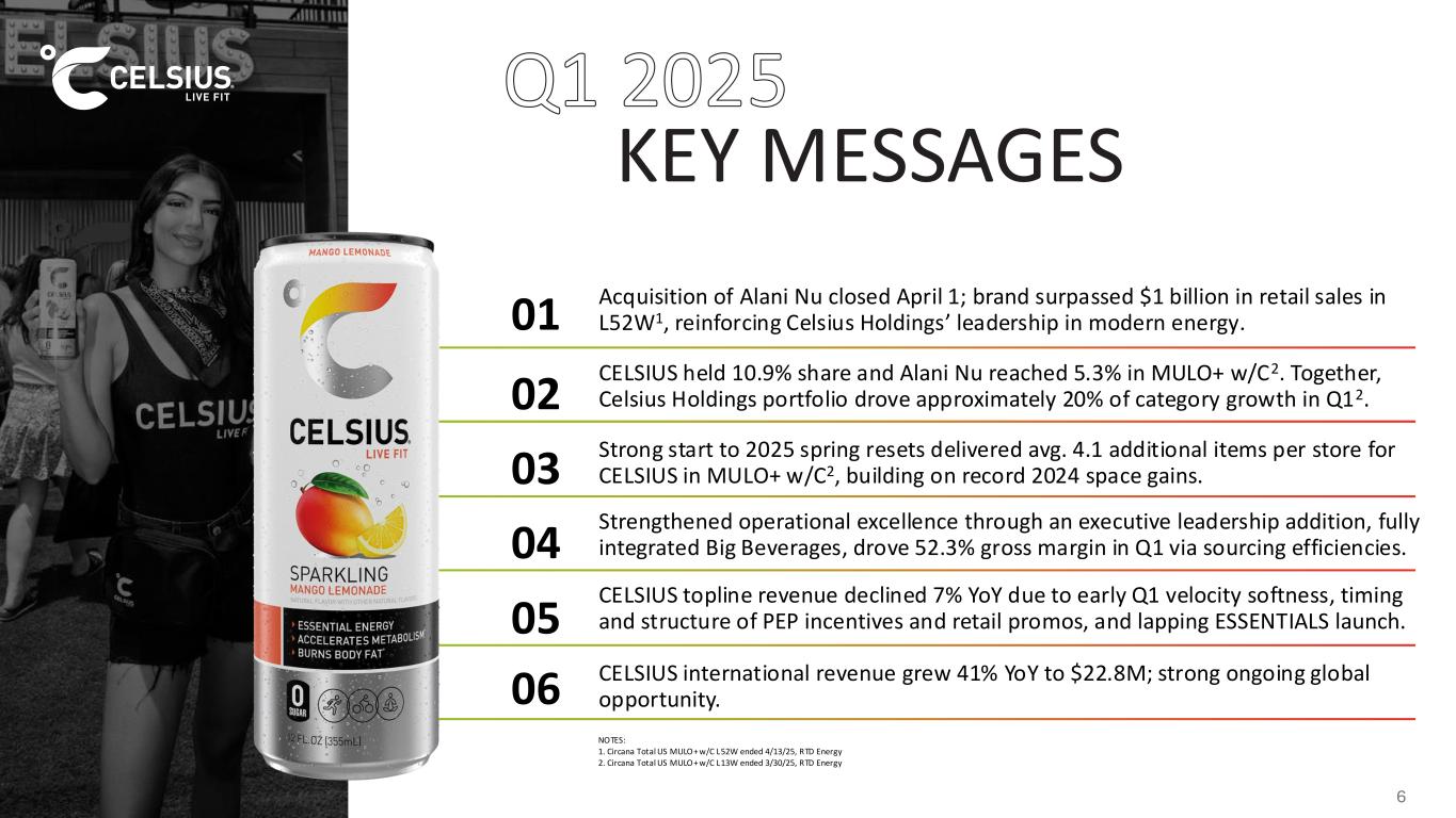 Q1 2025 KEY MESSAGES CELSIUS held 10.9% share and Alani Nu reached 5.3% in MULO+ w/C2. Together, Celsius Holdings portfolio drove approximately 20% of category growth in Q12. Strengthened operational excellence through an executive leadership addition, fully integrated Big Beverages, drove 52.3% gross margin in Q1 via sourcing efficiencies. CELSIUS topline revenue declined 7% YoY due to early Q1 velocity softness, timing and structure of PEP incentives and retail promos, and lapping ESSENTIALS launch. CELSIUS international revenue grew 41% YoY to $22.8M; strong ongoing global opportunity. 01 02 03 04 05 06 NOTES: 1. Circana Total US MULO+ w/C L52W ended 4/13/25, RTD Energy 2. Circana Total US MULO+ w/C L13W ended 3/30/25, RTD Energy Acquisition of Alani Nu closed April 1; brand surpassed $1 billion in retail sales in L52W1, reinforcing Celsius Holdings’ leadership in modern energy​. Strong start to 2025 spring resets delivered avg. 4.1 additional items per store for CELSIUS in MULO+ w/C2, building on record 2024 space gains. 6