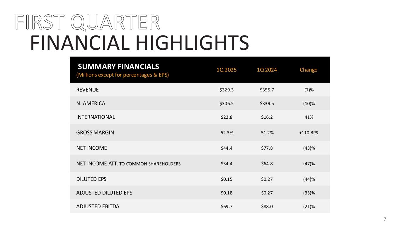 SUMMARY FINANCIALS (Millions except for percentages & EPS) 1Q 2025 1Q 2024 Change REVENUE $329.3 $355.7 (7)% N. AMERICA $306.5 $339.5 (10)% INTERNATIONAL $22.8 $16.2 41% GROSS MARGIN 52.3% 51.2% +110 BPS NET INCOME $44.4 $77.8 (43)% NET INCOME ATT. TO COMMON SHAREHOLDERS $34.4 $64.8 (47)% DILUTED EPS $0.15 $0.27 (44)% ADJUSTED DILUTED EPS $0.18 $0.27 (33)% ADJUSTED EBITDA $69.7 $88.0 (21)% FIRST QUARTER FINANCIAL HIGHLIGHTS 7