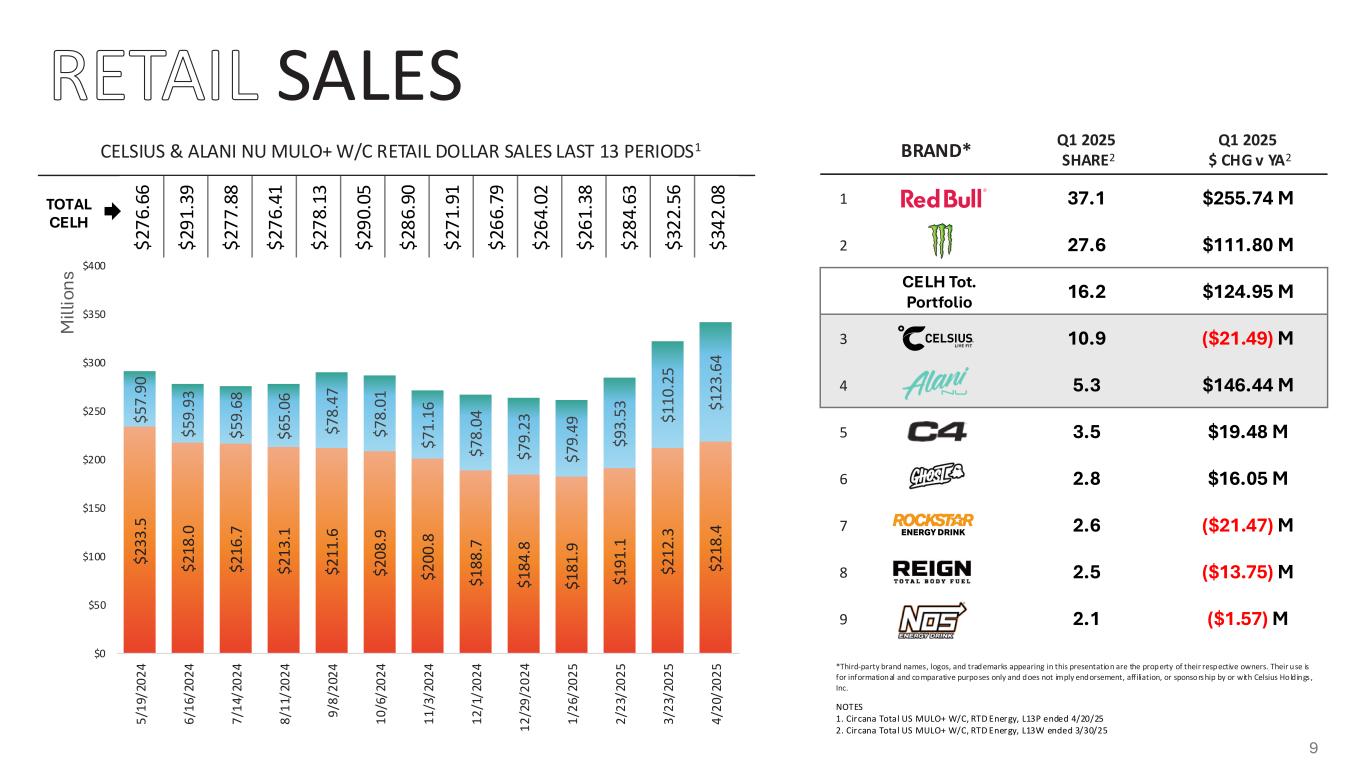 CELSIUS HOLDINGS IS GROWING THE ENERGY DRINK CATEGORY $0.14 $0.41 $1.01 $2.21 $2.71 $0.01 $0.14 $0.34 $0.51 $0.83 $0.00 $0.50 $1.00 $1.50 $2.00 $2.50 $3.00 $3.50 $4.00 2020 2021 2022 2023 2024 B il lio n s 4.3% 10% 25% 32% 30% 5% 8% 5% 20% 0.0% 10.0% 20.0% 30.0% 40.0% 50.0% 60.0% 70.0% 80.0% 90.0% 100.0% 2020 2021 2022 2023 2024 CELH RETAIL SALES ACROSS TRACKED CHANNELS1 (MULO+ W/C | BILLIONS) CELH CONTRIBUTION TO CATEGORY GROWTH BY YEAR2 (MULO+ W/C) NOTES: 1. Circana US MULO+ W/C, RTD Energy full years 2020-2024, ended 12/29/24 2. Circana US MULO+ W/C, RTD Energy full years 2020-2024, ended 12/29/24 8 $0.15 $0.55 $1.35 $2.72 $3.54 2020 2021 2022 2023 2024 TOTAL CELH 4.3% 15% 33% 37% 50%
