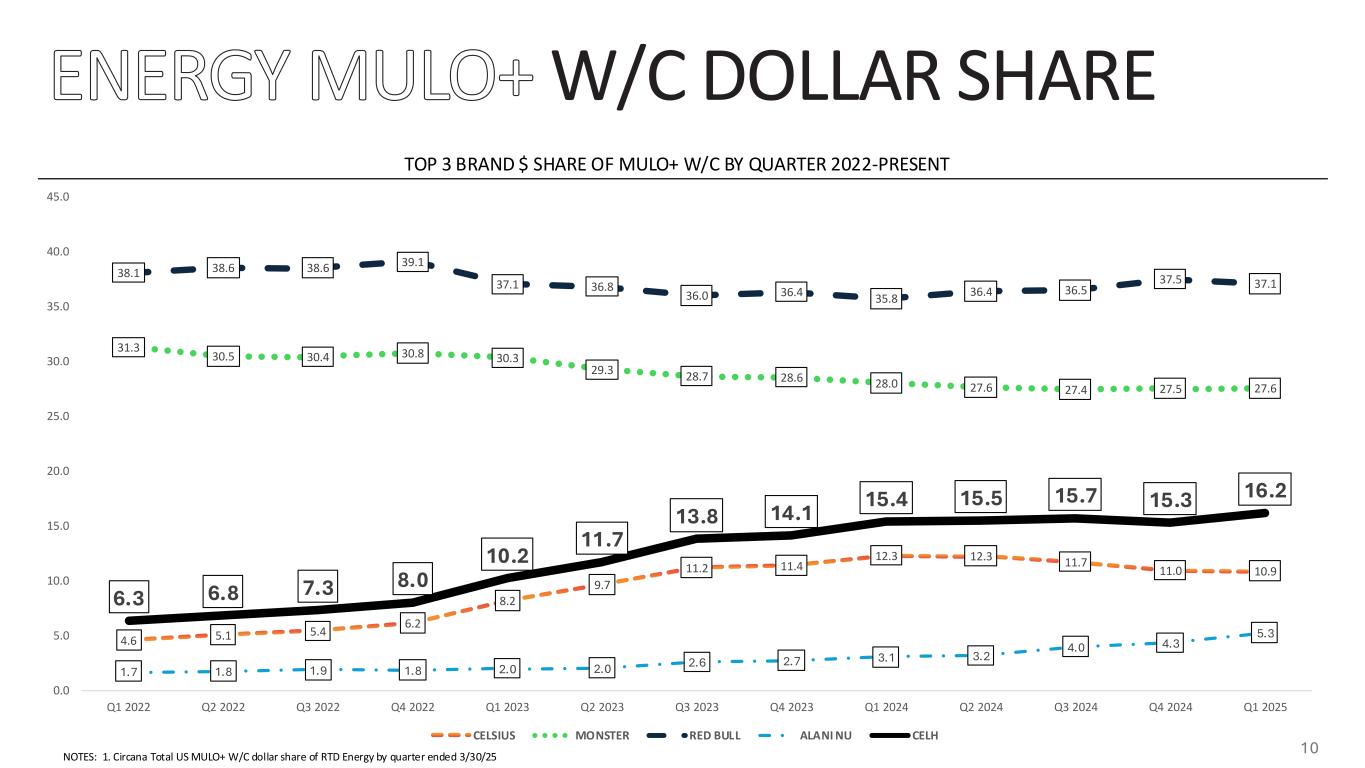 ENERGY MULO+ W/C DOLLAR SHARE NOTES: 1. Circana Total US MULO+ W/C dollar share of RTD Energy by quarter ended 3/30/25 4.6 5.1 5.4 6.2 8.2 9.7 11.2 11.4 12.3 12.3 11.7 11.0 10.9 31.3 30.5 30.4 30.8 30.3 29.3 28.7 28.6 28.0 27.6 27.4 27.5 27.6 38.1 38.6 38.6 39.1 37.1 36.8 36.0 36.4 35.8 36.4 36.5 37.5 37.1 1.7 1.8 1.9 1.8 2.0 2.0 2.6 2.7 3.1 3.2 4.0 4.3 5.3 6.3 6.8 7.3 8.0 10.2 11.7 13.8 14.1 15.4 15.5 15.7 15.3 16.2 0.0 5.0 10.0 15.0 20.0 25.0 30.0 35.0 40.0 45.0 Q1 2022 Q2 2022 Q3 2022 Q4 2022 Q1 2023 Q2 2023 Q3 2023 Q4 2023 Q1 2024 Q2 2024 Q3 2024 Q4 2024 Q1 2025 TOP 3 BRAND $ SHARE OF MULO+ W/C BY QUARTER 2022-PRESENT CELSIUS MONSTER RED BULL ALANI NU CELH 10