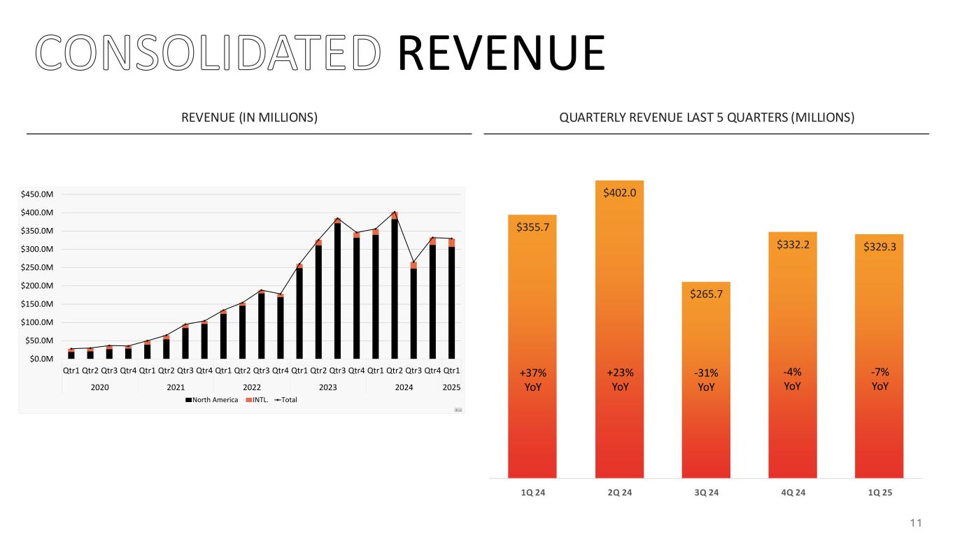 CONSOLIDATED REVENUE QUARTERLY REVENUE LAST 5 QUARTERS (MILLIONS) $355.7 $402.0 $265.7 $332.2 $329.3 1Q 24 2Q 24 3Q 24 4Q 24 1Q 25 -31% YoY +37% YoY -7% YoY REVENUE (IN MILLIONS) +23% YoY -4% YoY 11 $0.0M $50.0M $100.0M $150.0M $200.0M $250.0M $300.0M $350.0M $400.0M $450.0M Qtr1 Qtr2 Qtr3 Qtr4 Qtr1 Qtr2 Qtr3 Qtr4 Qtr1 Qtr2 Qtr3 Qtr4 Qtr1 Qtr2 Qtr3 Qtr4 Qtr1 Qtr2 Qtr3 Qtr4 Qtr1 2020 2021 2022 2023 2024 2025 North America INTL. Total