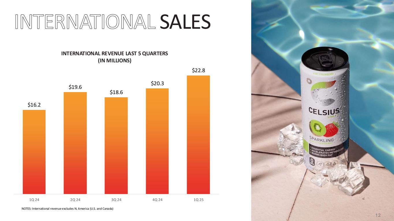 INTERNATIONAL SALES $16.2 $19.6 $18.6 $20.3 $22.8 1Q 24 2Q 24 3Q 24 4Q 24 1Q 25 NOTES: International revenue excludes N. America (U.S. and Canada) INTERNATIONAL REVENUE LAST 5 QUARTERS (IN MILLIONS) 12