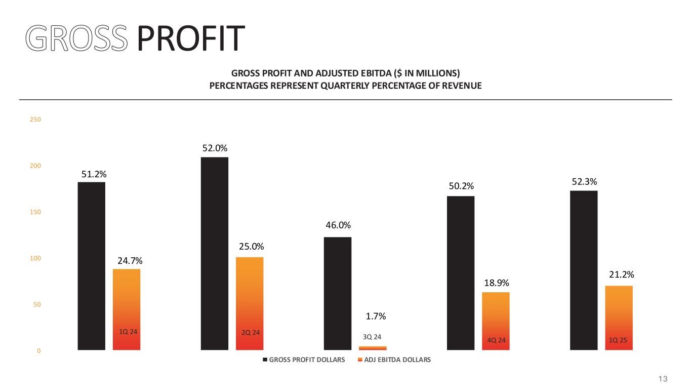 0 50 100 150 200 250 GROSS PROFIT DOLLARS ADJ EBITDA DOLLARS 1Q 24 2Q 24 3Q 24 4Q 24 25.0% 1Q 25 52.3% 21.2% GROSS PROFIT GROSS PROFIT AND ADJUSTED EBITDA ($ IN MILLIONS) PERCENTAGES REPRESENT QUARTERLY PERCENTAGE OF REVENUE 24.7% 52.0% 46.0% 1.7% 51.2% 50.2% 18.9% 13
