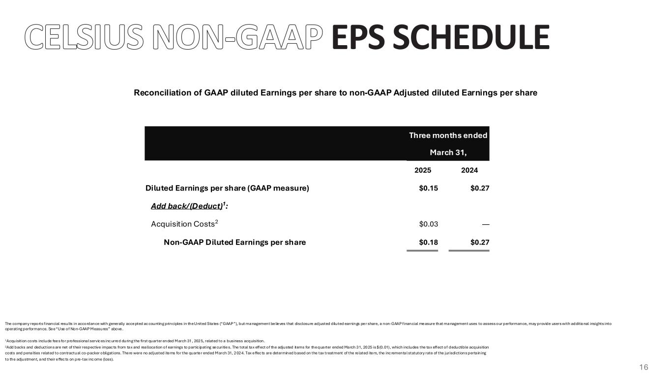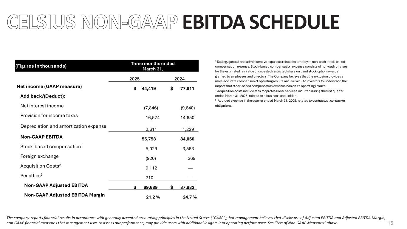 CELSIUS NON-GAAP EBITDA SCHEDULE The company reports financial results in accordance with generally accepted accounting principles in the United States (“GAAP”), but management believes that disclosure of Adjusted EBITDA and Adjusted EBITDA Margin, non-GAAP financial measures that management uses to assess our performance, may provide users with additional insights into operating performance. See “Use of Non-GAAP Measures” above. (Figures in thousands) Three months ended March 31, 2025 2024 Net income (GAAP measure) $ 44,419 $ 77,811 Add back/(Deduct): Net interest income (7,846) (9,640) Provision for income taxes 16,574 14,650 Depreciation and amortization expense 2,611 1,229 Non-GAAP EBITDA 55,758 84,050 Stock-based compensation1 5,029 3,563 Foreign exchange (920) 369 Acquisition Costs2 9,112 — Penalties3 710 — Non-GAAP Adjusted EBITDA $ 69,689 $ 87,982 Non-GAAP Adjusted EBITDA Margin 21.2 % 24.7 % 1 Selling, general and administrative expenses related to employee non-cash stock-based compensation expense. Stock-based compensation expense consists of non-cash charges for the estimated fair value of unvested restricted share unit and stock option awards granted to employees and directors. The Company believes that the exclusion provides a more accurate comparison of operating results and is useful to investors to understand the impact that stock-based compensation expense has on its operating results. 2 Acquisition costs include fees for professional services incurred during the first quarter ended March 31, 2025, related to a business acquisition. 3 Accrued expense in the quarter ended March 31, 2025, related to contractual co-packer obligations. 15