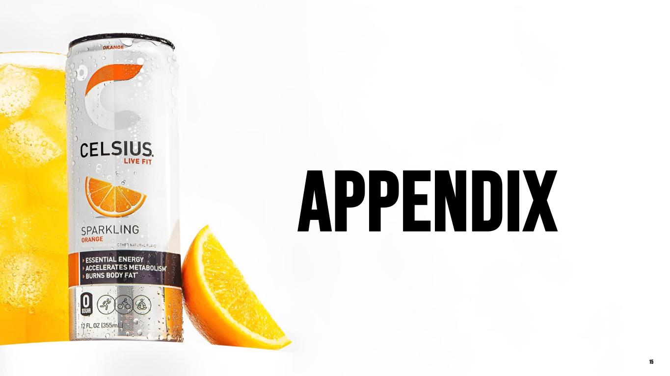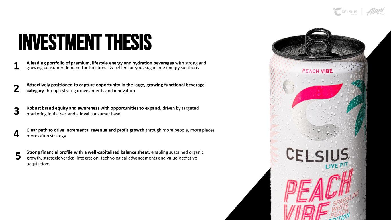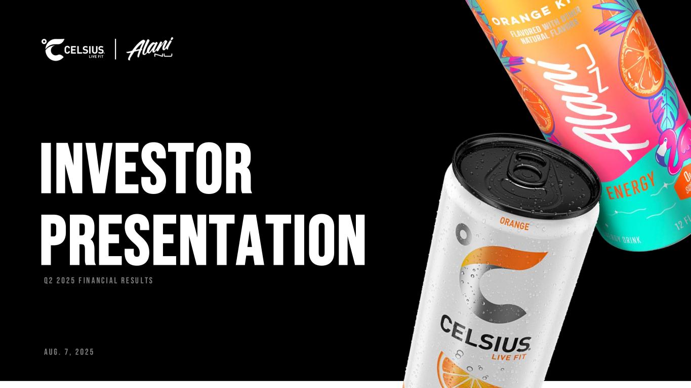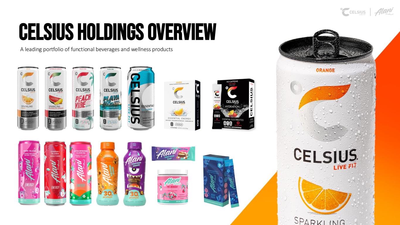 Safe harbor & Non-gaap measures Forward-Looking Statements This presentation contains statements by Celsius Holdings, Inc. (“Celsius Holdings”, “we”, “us”, “our” or the “Company”) that are not historical facts and are considered forward-looking statements within the meaning of the Private Securities Litigation Reform Act of 1995. These forward-looking statements may address, among other things, our prospects, plans, business strategy and expected financial and operational results. You can identify these statements by the use of words such as “anticipate,” “believe,” “could,” “estimate,” “expect,” “intend,” “may,” “should,” “will,” “would”, ”could”, ”project”, ”plan”, “potential”, ”designed”, “seek”, “target”, variations of these terms, the negatives of such terms and similar expressions. These statements are based on certain assumptions that we have made in light of our experience in the industry as well as our perceptions of historical trends, current conditions, expected future developments and other factors we believe are appropriate in these circumstances.These forward-looking statements are based on our current expectations and beliefs concerning future developments and their potential effect on us. You should not rely on forward-looking statements because our actual results may differ materially from those indicated by forward-looking statements as a result of a number of important factors. These factors include, but are not limited to: changes to our commercial agreements with PepsiCo, Inc.; management’s plans and objectives for international expansion and global operations; general economic and business conditions; our business strategy for expanding our presence in our industry; our expectations of revenue; operating costs and profitability; our expectations regarding our strategy and investments; our ability to successfully integrate businesses that we acquire, including Alani Nu; our ability to achieve the benefits that we expect to realize as a result of our acquisitions, including Alani Nu; the potential negative impact on our financial condition and results of operations if we fail to achieve the benefits that we expect to realize as a result of our business acquisitions, including Alani Nu; liabilities of the businesses that we acquire that are not known to us; our expectations regarding our business, including market opportunity, consumer demand and our competitive advantage; anticipated trends in our financial condition and results of operation; the impact of competition and technology change; existing and future regulations affecting our business; the Company’s ability to comply with the rules and regulations of the Securities and Exchange Commission (the “SEC”); and those other risks and uncertainties discussed in the reports we file with the SEC, such as our Annual Report on Form 10-K, Quarterly Reports on Form 10-Q and Current Reports on Form 8-K. Forward-looking statements speak only as of the date the statements were made. We do not undertake any obligation to update forward-looking information, except to the extent required by applicable law. Use of Non-GAAP Measures Celsius defines Adjusted EBITDA as net income before net interest (expense) income, income tax expense (benefit), and depreciation and amortization expense, further adjusted by excluding stock-based compensation expense, foreign exchange gains or losses, distributor termination fees, legal settlement costs, reorganization costs, acquisition costs, penalties, and inventory step-up adjustment. Adjusted EBITDA Margin is the ratio between the Company’s Adjusted EBITDA and net revenue, expressed as a percentage. Adjusted diluted earnings per share is GAAP diluted earnings per share net of add backs and deductions for distributor termination, legal settlement costs, reorganization costs, acquisitions costs, penalties, and inventory step-up adjustment. Adjusted EBITDA, Adjusted EBITDA Margin, and Adjusted diluted earnings per share are non-GAAP financial measures. Celsius uses Adjusted EBITDA, Adjusted EBITDA Margin, and Adjusted diluted earnings per share for operational and financial decision-making and believes these measures are useful in evaluating its performance because they eliminate certain items that management does not consider indicators of Celsius’ operating performance. Adjusted EBITDA, Adjusted EBITDA Margin, and Adjusted diluted earnings per share may also be used by many of Celsius’ investors, securities analysts, and other interested parties in evaluating its operational and financial performance across reporting periods. Celsius believes that the presentation of Adjusted EBITDA, Adjusted EBITDA Margin, and Adjusted diluted earnings per share, provides useful information to investors by allowing an understanding of measures that it uses internally for operational decision-making, budgeting and assessing operating performance. Adjusted EBITDA, Adjusted EBITDA Margin, and Adjusted diluted earnings per share are not recognized terms under GAAP and should not be considered as a substitute for net income or any other financial measure presented in accordance with GAAP. Non-GAAP financial measures have limitations as analytical tools and should not be considered in isolation or as substitutes for analysis of Celsius’ results as reported under GAAP. Celsius strongly encourages investors to review its financial statements and publicly filed reports in their entirety and not to rely on any single financial measure. Because non-GAAP financial measures are not standardized, Adjusted EBITDA, Adjusted EBITDA Margin, and Adjusted diluted earnings per share as defined by Celsius, may not be comparable to similarly titled measures reported by other companies. It therefore may not be possible to compare Celsius’ use of these non-GAAP financial measures with those used by other companies. Industry and Ma