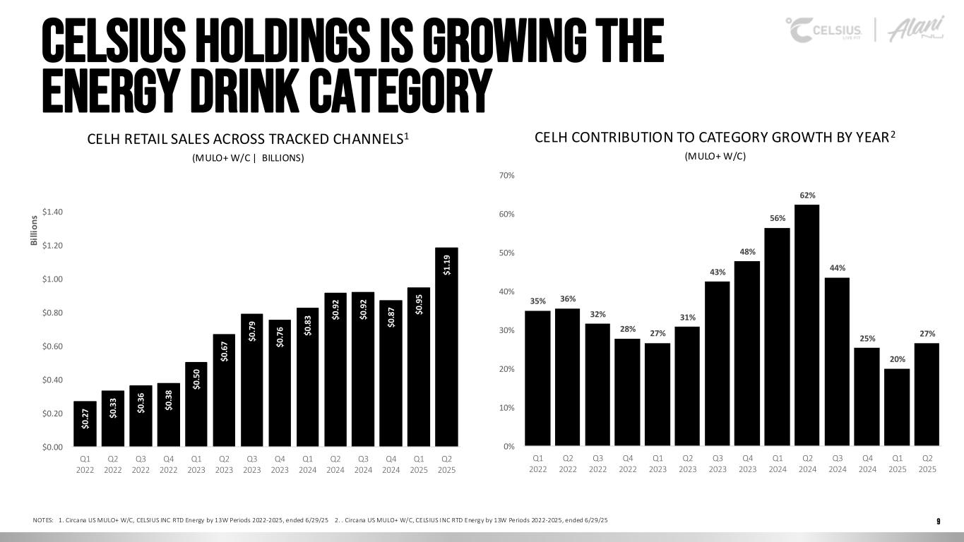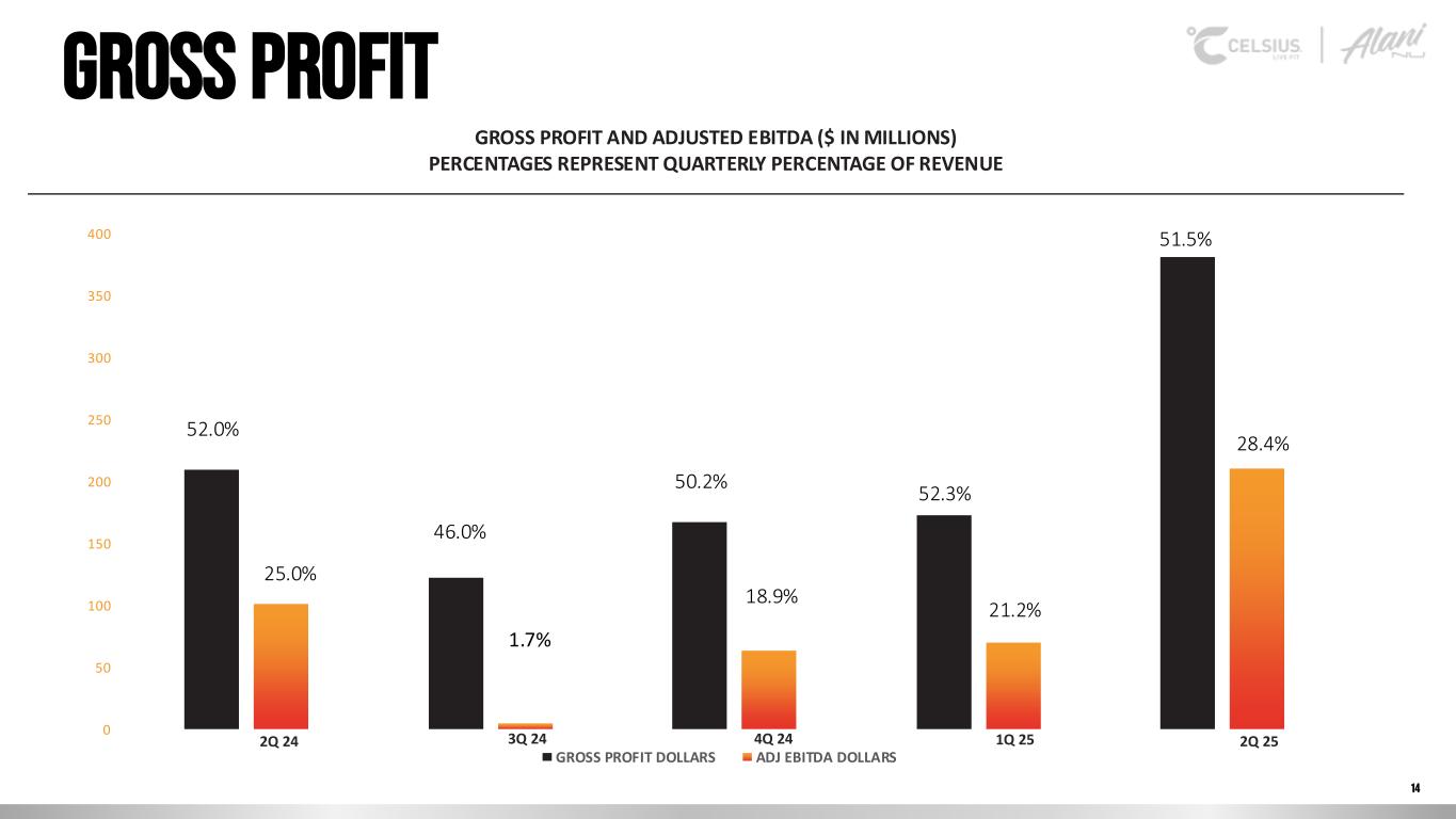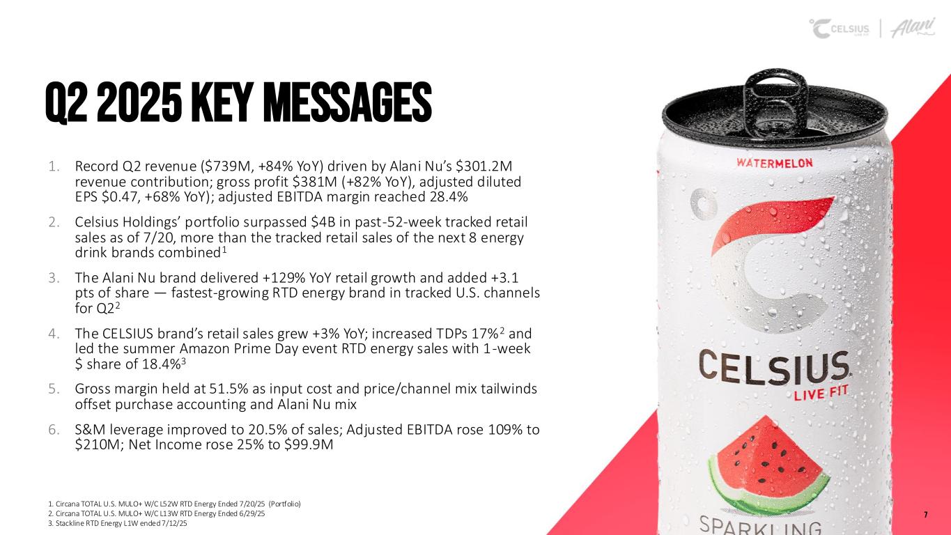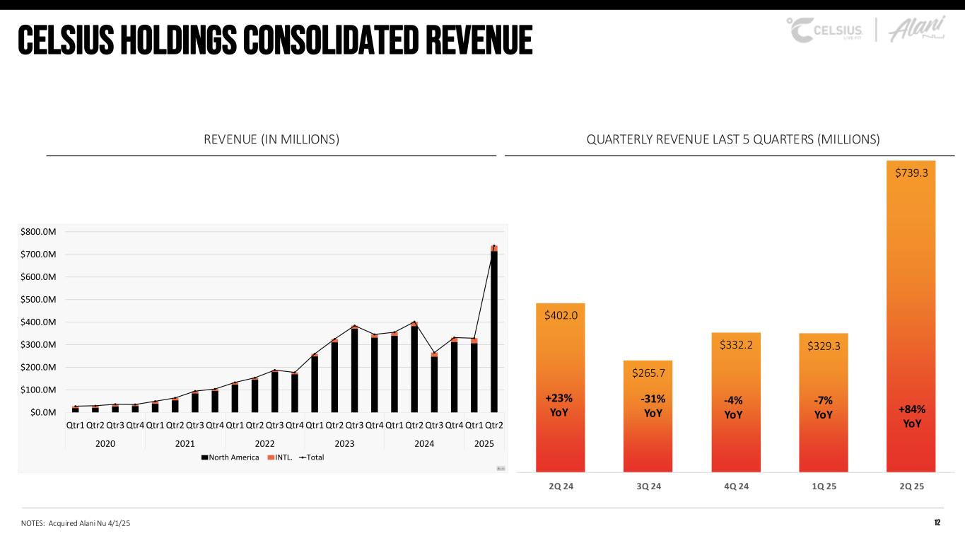 Safe harbor & Non-gaap measures Forward-Looking Statements This presentation contains statements by Celsius Holdings, Inc. (“Celsius Holdings”, “we”, “us”, “our” or the “Company”) that are not historical facts and are considered forward-looking statements within the meaning of the Private Securities Litigation Reform Act of 1995. These forward-looking statements may address, among other things, our prospects, plans, business strategy and expected financial and operational results. You can identify these statements by the use of words such as “anticipate,” “believe,” “could,” “estimate,” “expect,” “intend,” “may,” “should,” “will,” “would”, ”could”, ”project”, ”plan”, “potential”, ”designed”, “seek”, “target”, variations of these terms, the negatives of such terms and similar expressions. These statements are based on certain assumptions that we have made in light of our experience in the industry as well as our perceptions of historical trends, current conditions, expected future developments and other factors we believe are appropriate in these circumstances.These forward-looking statements are based on our current expectations and beliefs concerning future developments and their potential effect on us. You should not rely on forward-looking statements because our actual results may differ materially from those indicated by forward-looking statements as a result of a number of important factors. These factors include, but are not limited to: changes to our commercial agreements with PepsiCo, Inc.; management’s plans and objectives for international expansion and global operations; general economic and business conditions; our business strategy for expanding our presence in our industry; our expectations of revenue; operating costs and profitability; our expectations regarding our strategy and investments; our ability to successfully integrate businesses that we acquire, including Alani Nu; our ability to achieve the benefits that we expect to realize as a result of our acquisitions, including Alani Nu; the potential negative impact on our financial condition and results of operations if we fail to achieve the benefits that we expect to realize as a result of our business acquisitions, including Alani Nu; liabilities of the businesses that we acquire that are not known to us; our expectations regarding our business, including market opportunity, consumer demand and our competitive advantage; anticipated trends in our financial condition and results of operation; the impact of competition and technology change; existing and future regulations affecting our business; the Company’s ability to comply with the rules and regulations of the Securities and Exchange Commission (the “SEC”); and those other risks and uncertainties discussed in the reports we file with the SEC, such as our Annual Report on Form 10-K, Quarterly Reports on Form 10-Q and Current Reports on Form 8-K. Forward-looking statements speak only as of the date the statements were made. We do not undertake any obligation to update forward-looking information, except to the extent required by applicable law. Use of Non-GAAP Measures Celsius defines Adjusted EBITDA as net income before net interest (expense) income, income tax expense (benefit), and depreciation and amortization expense, further adjusted by excluding stock-based compensation expense, foreign exchange gains or losses, distributor termination fees, legal settlement costs, reorganization costs, acquisition costs, penalties, and inventory step-up adjustment. Adjusted EBITDA Margin is the ratio between the Company’s Adjusted EBITDA and net revenue, expressed as a percentage. Adjusted diluted earnings per share is GAAP diluted earnings per share net of add backs and deductions for distributor termination, legal settlement costs, reorganization costs, acquisitions costs, penalties, and inventory step-up adjustment. Adjusted EBITDA, Adjusted EBITDA Margin, and Adjusted diluted earnings per share are non-GAAP financial measures. Celsius uses Adjusted EBITDA, Adjusted EBITDA Margin, and Adjusted diluted earnings per share for operational and financial decision-making and believes these measures are useful in evaluating its performance because they eliminate certain items that management does not consider indicators of Celsius’ operating performance. Adjusted EBITDA, Adjusted EBITDA Margin, and Adjusted diluted earnings per share may also be used by many of Celsius’ investors, securities analysts, and other interested parties in evaluating its operational and financial performance across reporting periods. Celsius believes that the presentation of Adjusted EBITDA, Adjusted EBITDA Margin, and Adjusted diluted earnings per share, provides useful information to investors by allowing an understanding of measures that it uses internally for operational decision-making, budgeting and assessing operating performance. Adjusted EBITDA, Adjusted EBITDA Margin, and Adjusted diluted earnings per share are not recognized terms under GAAP and should not be considered as a substitute for net income or any other financial measure presented in accordance with GAAP. Non-GAAP financial measures have limitations as analytical tools and should not be considered in isolation or as substitutes for analysis of Celsius’ results as reported under GAAP. Celsius strongly encourages investors to review its financial statements and publicly filed reports in their entirety and not to rely on any single financial measure. Because non-GAAP financial measures are not standardized, Adjusted EBITDA, Adjusted EBITDA Margin, and Adjusted diluted earnings per share as defined by Celsius, may not be comparable to similarly titled measures reported by other companies. It therefore may not be possible to compare Celsius’ use of these non-GAAP financial measures with those used by other companies. Industry and Ma