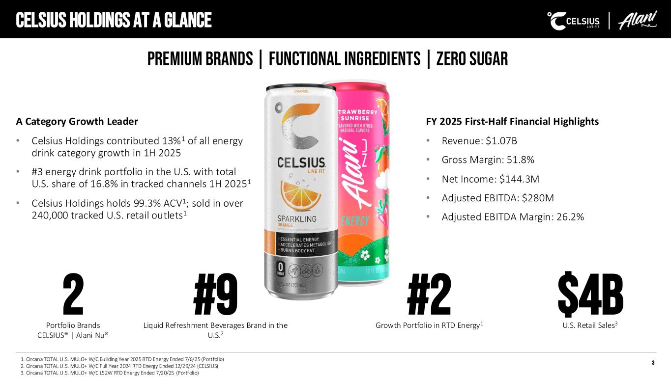Celsius HOLDINGS at a glance A Category Growth Leader • Celsius Holdings contributed 13%1 of all energy drink category growth in 1H 2025 • #3 energy drink portfolio in the U.S. with total U.S. share of 16.8% in tracked channels 1H 20251 • Celsius Holdings holds 99.3% ACV1; sold in over 240,000 tracked U.S. retail outlets1 3 FY 2025 First-Half Financial Highlights • Revenue: $1.07B • Gross Margin: 51.8% • Net Income: $144.3M • Adjusted EBITDA: $280M • Adjusted EBITDA Margin: 26.2% 2 Portfolio Brands CELSIUS® | Alani Nu® #9 Liquid Refreshment Beverages Brand in the U.S.2 #2 Growth Portfolio in RTD Energy1 $4B U.S. Retail Sales3 PREMIUM BRANDS | FUNCTIONAL INGREDIENTS | ZERO SUGAR 1. Circana TOTAL U.S. MULO+ W/C Building Year 2025 RTD Energy Ended 7/6/25 (Portfolio) 2. Circana TOTAL U.S. MULO+ W/C Full Year 2024 RTD Energy Ended 12/29/24 (CELSIUS) 3. Circana TOTAL U.S. MULO+ W/C L52W RTD Energy Ended 7/20/25 (Portfolio)