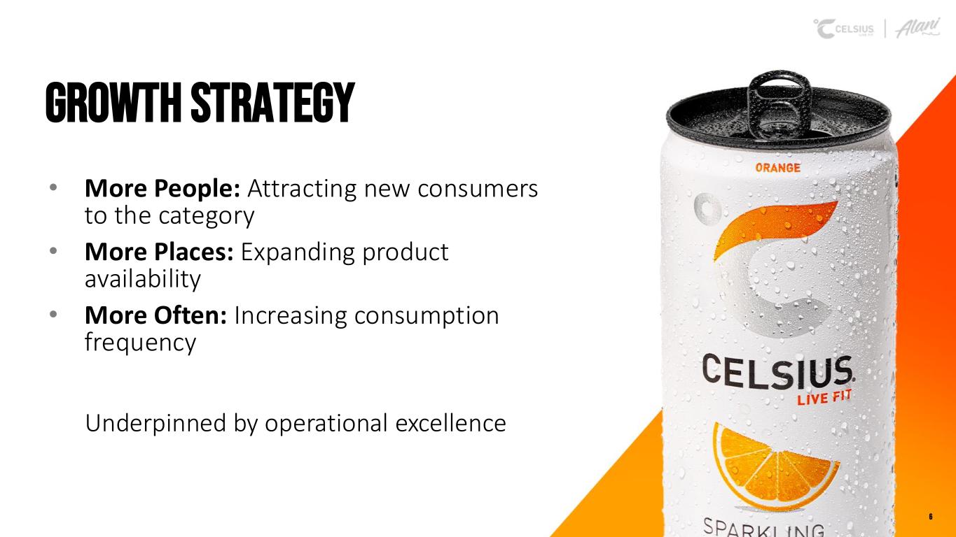 INVESTMENT THESIS A leading portfolio of premium, lifestyle energy and hydration beverages with strong and growing consumer demand for functional & better-for-you, sugar-free energy solutions1 2 3 4 5 Robust brand equity and awareness with opportunities to expand, driven by targeted marketing initiatives and a loyal consumer base Clear path to drive incremental revenue and profit growth through more people, more places, more often strategy Strong financial profile with a well-capitalized balance sheet, enabling sustained organic growth, strategic vertical integration, technological advancements and value-accretive acquisitions Attractively positioned to capture opportunity in the large, growing functional beverage category through strategic investments and innovation