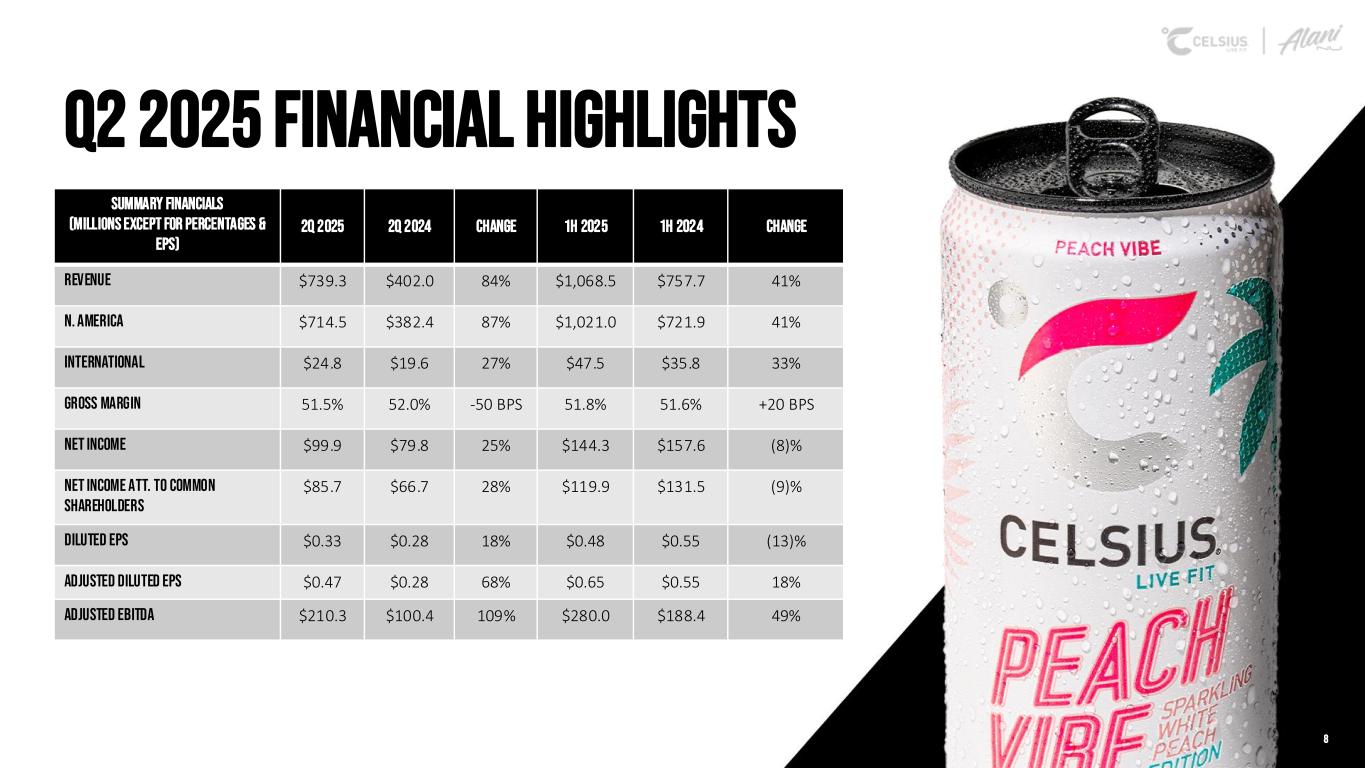 1. Record Q2 revenue ($739M, +84% YoY) driven by Alani Nu’s $301.2M revenue contribution; gross profit $381M (+82% YoY), adjusted diluted EPS $0.47, +68% YoY); adjusted EBITDA margin reached 28.4% 2. Celsius Holdings’ portfolio surpassed $4B in past-52-week tracked retail sales as of 7/20, more than the tracked retail sales of the next 8 energy drink brands combined1 3. The Alani Nu brand delivered +129% YoY retail growth and added +3.1 pts of share — fastest-growing RTD energy brand in tracked U.S. channels for Q22 4. The CELSIUS brand’s retail sales grew +3% YoY; increased TDPs 17%2 and led the summer Amazon Prime Day event RTD energy sales with 1-week $ share of 18.4%3 5. Gross margin held at 51.5% as input cost and price/channel mix tailwinds offset purchase accounting and Alani Nu mix 6. S&M leverage improved to 20.5% of sales; Adjusted EBITDA rose 109% to $210M; Net Income rose 25% to $99.9M Q2 2025 key messages 7 1. Circana TOTAL U.S. MULO+ W/C L52W RTD Energy Ended 7/20/25 (Portfolio) 2. Circana TOTAL U.S. MULO+ W/C L13W RTD Energy Ended 6/29/25 3. Stackline RTD Energy L1W ended 7/12/25