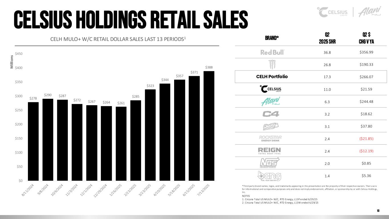 35% 36% 32% 28% 27% 31% 43% 48% 56% 62% 44% 25% 20% 27% 0% 10% 20% 30% 40% 50% 60% 70% Q1 2022 Q2 2022 Q3 2022 Q4 2022 Q1 2023 Q2 2023 Q3 2023 Q4 2023 Q1 2024 Q2 2024 Q3 2024 Q4 2024 Q1 2025 Q2 2025 9 Celsius holdings is growing the energy drink Category CELH RETAIL SALES ACROSS TRACKED CHANNELS1 (MULO+ W/C | BILLIONS) CELH CONTRIBUTION TO CATEGORY GROWTH BY YEAR2 (MULO+ W/C) NOTES: 1. Circana US MULO+ W/C, CELSIUS INC RTD Energy by 13W Periods 2022-2025, ended 6/29/25 2. . Circana US MULO+ W/C, CELSIUS INC RTD Energy by 13W Periods 2022-2025, ended 6/29/25 $ 0 .2 7 $0 .3 3 $0 .3 6 $0 .3 8 $0 .5 0 $0 .6 7 $0 .7 9 $ 0 .7 6 $0 .8 3 $0 .9 2 $0 .9 2 $0 .8 7 $ 0 .9 5 $1 .1 9 $0.00 $0.20 $0.40 $0.60 $0.80 $1.00 $1.20 $1.40 Q1 2022 Q2 2022 Q3 2022 Q4 2022 Q1 2023 Q2 2023 Q3 2023 Q4 2023 Q1 2024 Q2 2024 Q3 2024 Q4 2024 Q1 2025 Q2 2025 B il li o n s
