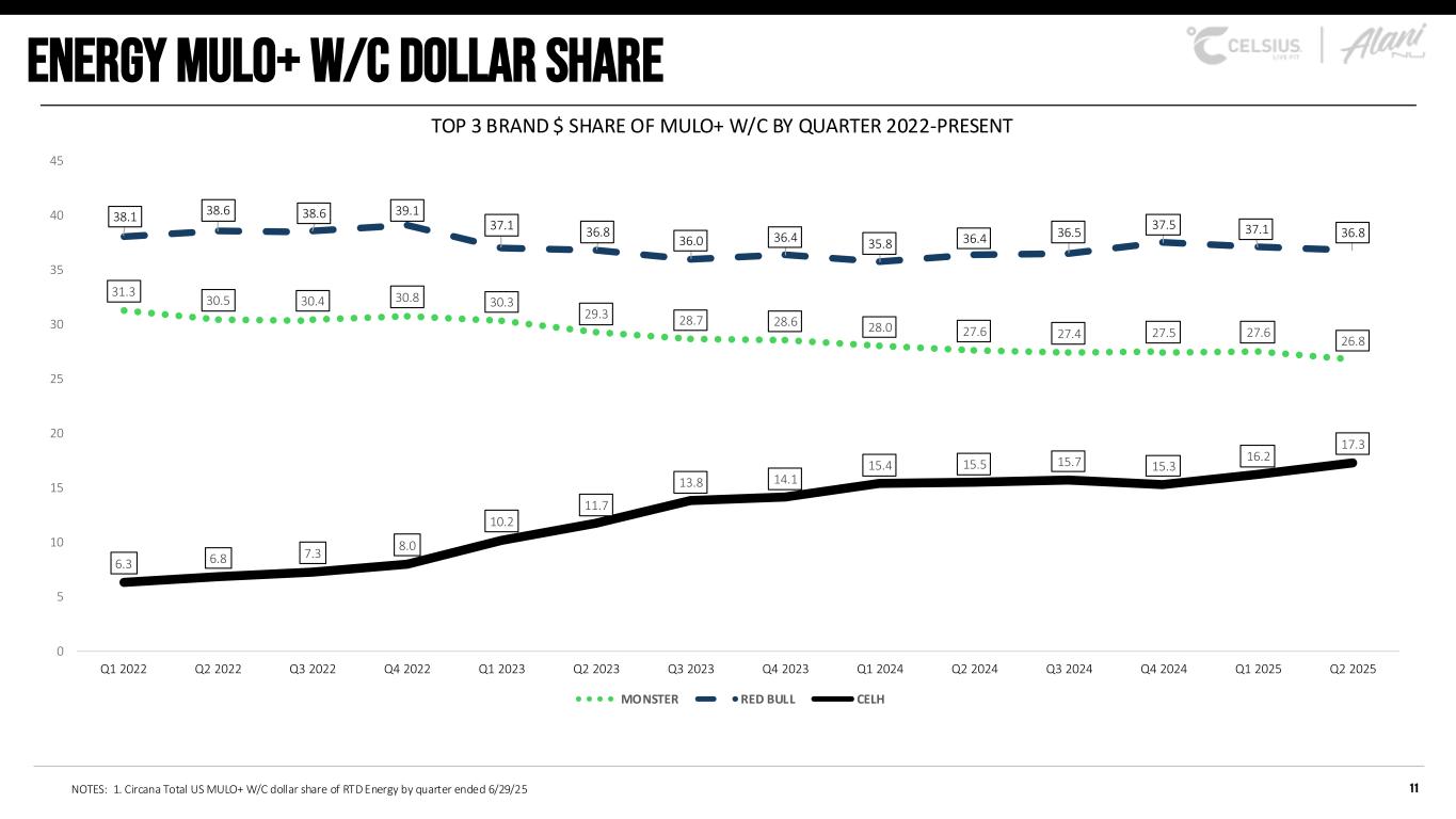 NOTES 1. Circana Total US MULO+ W/C, RTD Energy, L13P ended 6/29/25 2. Circana Total US MULO+ W/C, RTD Energy, L13W ended 6/29/25 BRAND* Q2 2025 SHR Q2 $ Chg v YA 36.8 $356.99 26.8 $190.33 CELH Portfolio 17.3 $266.07 11.0 $21.59 6.3 $244.48 3.2 $18.62 3.1 $37.80 2.4 ($21.85) 2.4 ($12.19) 2.0 $0.85 1.4 $5.36 CELSIUS HOLDINGS Retail sales *Third-party brand names, logos, and trademarks appearing in this presentation are the property of their respective owners. Their use is for informational and comparative purposes only and does not imply endorsement, affiliation, or sponsorship by or with Celsius Hold ings , Inc. CELH MULO+ W/C RETAIL DOLLAR SALES LAST 13 PERIODS1 $278 $290 $287 $272 $267 $264 $261 $285 $323 $344 $357 $371 $388 $0 $50 $100 $150 $200 $250 $300 $350 $400 $450 M ill io n s 10