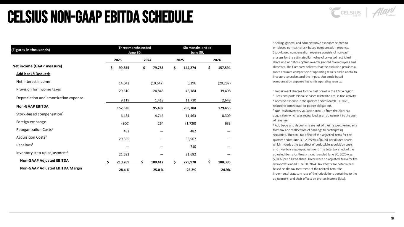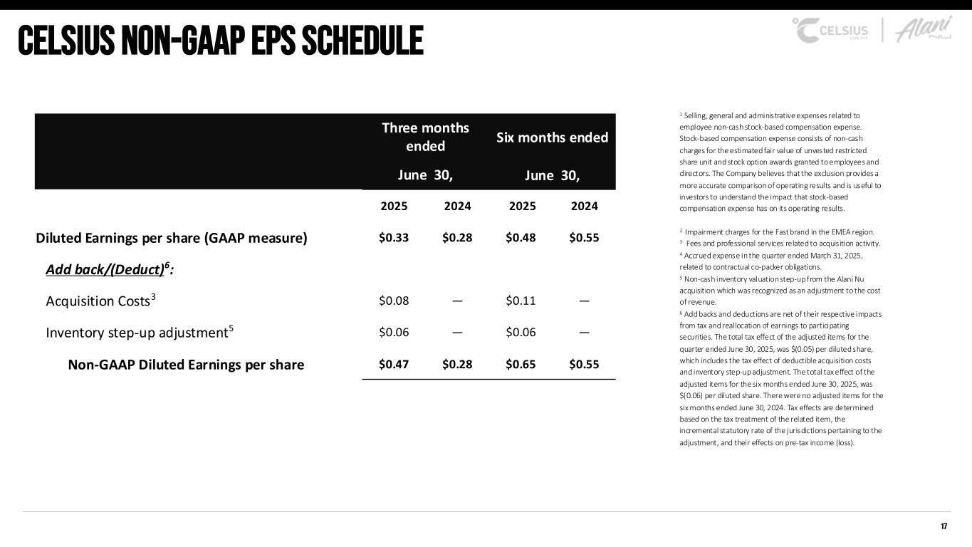 16 Celsius non-gaap ebitda schedule 1 Selling, general and administrative expenses related to employee non-cash stock-based compensation expense. Stock-based compensation expense consists of non-cash charges for the estimated fair value of unvested restricted share unit and stock option awards granted to employees and directors. The Company believes that the exclusion provides a more accurate comparison of operating results and is useful to investors to understand the impact that stock-based compensation expense has on its operating results. 2 Impairment charges for the Fast brand in the EMEA region. 3 Fees and professional services related to acquisition activity. 4 Accrued expense in the quarter ended March 31, 2025, related to contractual co-packer obligations. 5 Non-cash inventory valuation step-up from the Alani Nu acquisition which was recognized as an adjustment to the cost of revenue. 6 Add backs and deductions are net of their respective impacts from tax and reallocation of earnings to participating securities. The total tax effect of the adjusted items for the quarter ended June 30, 2025 was $(0.05) per diluted share, which includes the tax effect of deductible acquisition costs and inventory step-up adjustment. The total tax effect of the adjusted items for the six months ended June 30, 2025 was $(0.06) per diluted share. There were no adjusted items for the six months ended June 30, 2024. Tax effects are determined based on the tax treatment of the related item, the incremental statutory rate of the jurisdictions pertaining to the adjustment, and their effects on pre-tax income (loss). (Figures in thousands) Three months ended June 30, Six months ended June 30, 2025 2024 2025 2024 Net income (GAAP measure) $ 99,855 $ 79,783 $ 144,274 $ 157,594 Add back/(Deduct): Net interest income 14,042 (10,647) 6,196 (20,287) Provision for income taxes 29,610 24,848 46,184 39,498 Depreciation and amortization expense 9,119 1,418 11,730 2,648 Non-GAAP EBITDA 152,626 95,402 208,384 179,453 Stock-based compensation1 6,434 4,746 11,463 8,309 Foreign exchange (800) 264 (1,720) 633 Reorganization Costs2 482 — 482 — Acquisition Costs3 29,855 — 38,967 — Penalties4 — — 710 — Inventory step-up adjustment5 21,692 — 21,692 — Non-GAAP Adjusted EBITDA $ 210,289 $ 100,412 $ 279,978 $ 188,395 Non-GAAP Adjusted EBITDA Margin 28.4 % 25.0 % 26.2% 24.9%