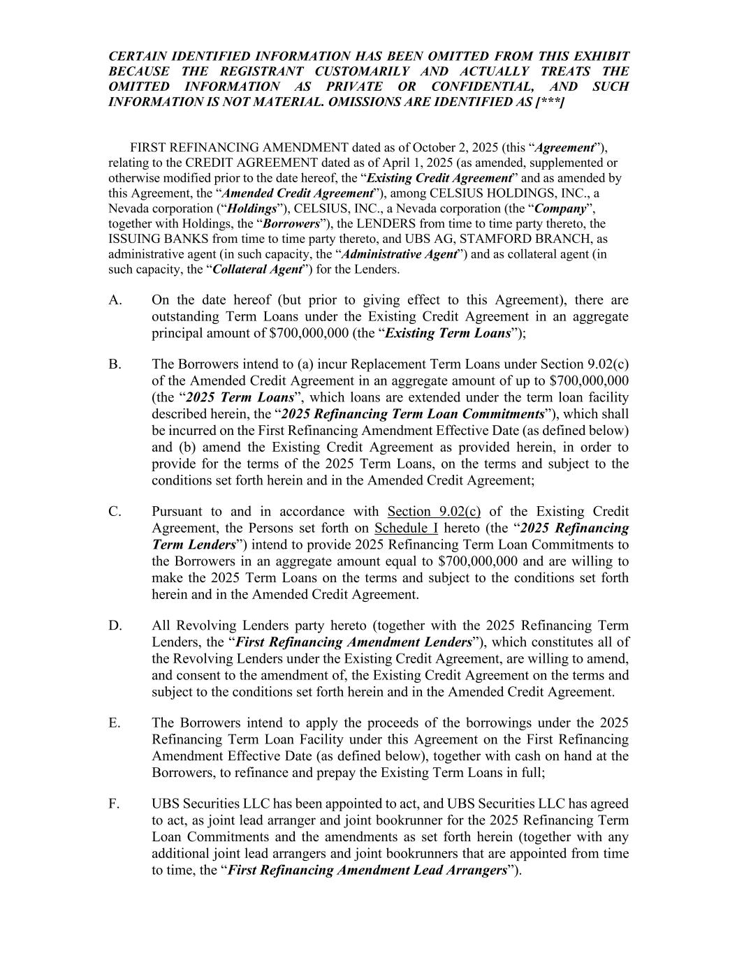 CERTAIN IDENTIFIED INFORMATION HAS BEEN OMITTED FROM THIS EXHIBIT BECAUSE THE REGISTRANT CUSTOMARILY AND ACTUALLY TREATS THE OMITTED INFORMATION AS PRIVATE OR CONFIDENTIAL, AND SUCH INFORMATION IS NOT MATERIAL. OMISSIONS ARE IDENTIFIED AS [***] FIRST REFINANCING AMENDMENT dated as of October 2, 2025 (this “Agreement”), relating to the CREDIT AGREEMENT dated as of April 1, 2025 (as amended, supplemented or otherwise modified prior to the date hereof, the “Existing Credit Agreement” and as amended by this Agreement, the “Amended Credit Agreement”), among CELSIUS HOLDINGS, INC., a Nevada corporation (“Holdings”), CELSIUS, INC., a Nevada corporation (the “Company”, together with Holdings, the “Borrowers”), the LENDERS from time to time party thereto, the ISSUING BANKS from time to time party thereto, and UBS AG, STAMFORD BRANCH, as administrative agent (in such capacity, the “Administrative Agent”) and as collateral agent (in such capacity, the “Collateral Agent”) for the Lenders. A. On the date hereof (but prior to giving effect to this Agreement), there are outstanding Term Loans under the Existing Credit Agreement in an aggregate principal amount of $700,000,000 (the “Existing Term Loans”); B. The Borrowers intend to (a) incur Replacement Term Loans under Section 9.02(c) of the Amended Credit Agreement in an aggregate amount of up to $700,000,000 (the “2025 Term Loans”, which loans are extended under the term loan facility described herein, the “2025 Refinancing Term Loan Commitments”), which shall be incurred on the First Refinancing Amendment Effective Date (as defined below) and (b) amend the Existing Credit Agreement as provided herein, in order to provide for the terms of the 2025 Term Loans, on the terms and subject to the conditions set forth herein and in the Amended Credit Agreement; C. Pursuant to and in accordance with Section 9.02(c) of the Existing Credit Agreement, the Persons set forth on Schedule I hereto (the “2025 Refinancing Term Lenders”) intend to provide 2025 Refinancing Term Loan Commitments to the Borrowers in an aggregate amount equal to $700,000,000 and are willing to make the 2025 Term Loans on the terms and subject to the conditions set forth herein and in the Amended Credit Agreement. D. All Revolving Lenders party hereto (together with the 2025 Refinancing Term Lenders, the “First Refinancing Amendment Lenders”), which constitutes all of the Revolving Lenders under the Existing Credit Agreement, are willing to amend, and consent to the amendment of, the Existing Credit Agreement on the terms and subject to the conditions set forth herein and in the Amended Credit Agreement. E. The Borrowers intend to apply the proceeds of the borrowings under the 2025 Refinancing Term Loan Facility under this Agreement on the First Refinancing Amendment Effective Date (as defined below), together with cash on hand at the Borrowers, to refinance and prepay the Existing Term Loans in full; F. UBS Securities LLC has been appointed to act, and UBS Securities LLC has agreed to act, as joint lead arranger and joint bookrunner for the 2025 Refinancing Term Loan Commitments and the amendments as set forth herein (together with any additional joint lead arrangers and joint bookrunners that are appointed from time to time, the “First Refinancing Amendment Lead Arrangers”).