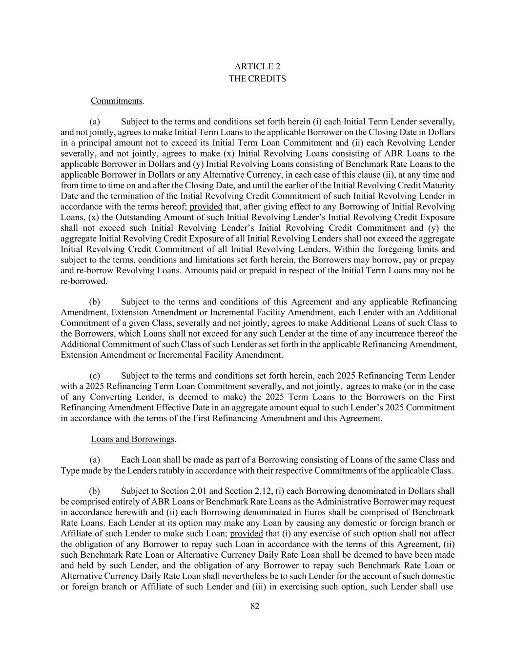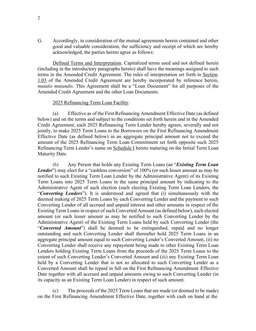 2 G. Accordingly, in consideration of the mutual agreements herein contained and other good and valuable consideration, the sufficiency and receipt of which are hereby acknowledged, the parties hereto agree as follows: Defined Terms and Interpretation. Capitalized terms used and not defined herein (including in the introductory paragraphs hereto) shall have the meanings assigned to such terms in the Amended Credit Agreement. The rules of interpretation set forth in Section 1.03 of the Amended Credit Agreement are hereby incorporated by reference herein, mutatis mutandis. This Agreement shall be a “Loan Document” for all purposes of the Amended Credit Agreement and the other Loan Documents. 2025 Refinancing Term Loan Facility. (a) Effective as of the First Refinancing Amendment Effective Date (as defined below) and on the terms and subject to the conditions set forth herein and in the Amended Credit Agreement, each 2025 Refinancing Term Lender hereby agrees, severally and not jointly, to make 2025 Term Loans to the Borrowers on the First Refinancing Amendment Effective Date (as defined below) in an aggregate principal amount not to exceed the amount of the 2025 Refinancing Term Loan Commitment set forth opposite such 2025 Refinancing Term Lender’s name on Schedule I hereto maturing on the Initial Term Loan Maturity Date. (b) Any Person that holds any Existing Term Loans (an “Existing Term Loan Lender”) may elect for a “cashless conversion” of 100% (or such lesser amount as may be notified to such Existing Term Loan Lender by the Administrative Agent) of its Existing Term Loans into 2025 Term Loans in the same principal amount by indicating to the Administrative Agent of such election (such electing Existing Term Loan Lenders, the “Converting Lenders”). It is understood and agreed that (i) simultaneously with the deemed making of 2025 Term Loans by each Converting Lender and the payment to such Converting Lender of all accrued and unpaid interest and other amounts in respect of the Existing Term Loans in respect of such Converted Amount (as defined below), such elected amount (or such lesser amount as may be notified to such Converting Lender by the Administrative Agent) of the Existing Term Loans held by such Converting Lender (the “Converted Amount”) shall be deemed to be extinguished, repaid and no longer outstanding and such Converting Lender shall thereafter hold 2025 Term Loans in an aggregate principal amount equal to such Converting Lender’s Converted Amount, (ii) no Converting Lender shall receive any repayment being made to other Existing Term Loan Lenders holding Existing Term Loans from the proceeds of the 2025 Term Loans to the extent of such Converting Lender’s Converted Amount and (iii) any Existing Term Loan held by a Converting Lender that is not so allocated to such Converting Lender as a Converted Amount shall be repaid in full on the First Refinancing Amendment Effective Date together with all accrued and unpaid amounts owing to such Converting Lender (in its capacity as an Existing Term Loan Lender) in respect of such amount. (c) The proceeds of the 2025 Term Loans that are made (or deemed to be made) on the First Refinancing Amendment Effective Date, together with cash on hand at the