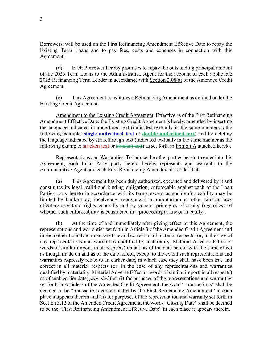 3 Borrowers, will be used on the First Refinancing Amendment Effective Date to repay the Existing Term Loans and to pay fees, costs and expenses in connection with this Agreement. (d) Each Borrower hereby promises to repay the outstanding principal amount of the 2025 Term Loans to the Administrative Agent for the account of each applicable 2025 Refinancing Term Lender in accordance with Section 2.08(a) of the Amended Credit Agreement. (e) This Agreement constitutes a Refinancing Amendment as defined under the Existing Credit Agreement. Amendment to the Existing Credit Agreement. Effective as of the First Refinancing Amendment Effective Date, the Existing Credit Agreement is hereby amended by inserting the language indicated in underlined text (indicated textually in the same manner as the following example: single-underlined text or double-underlined text) and by deleting the language indicated by strikethrough text (indicated textually in the same manner as the following example: stricken text or stricken text) as set forth in Exhibit A attached hereto. Representations and Warranties. To induce the other parties hereto to enter into this Agreement, each Loan Party party hereto hereby represents and warrants to the Administrative Agent and each First Refinancing Amendment Lender that: (a) This Agreement has been duly authorized, executed and delivered by it and constitutes its legal, valid and binding obligation, enforceable against each of the Loan Parties party hereto in accordance with its terms except as such enforceability may be limited by bankruptcy, insolvency, reorganization, moratorium or other similar laws affecting creditors’ rights generally and by general principles of equity (regardless of whether such enforceability is considered in a proceeding at law or in equity). (b) At the time of and immediately after giving effect to this Agreement, the representations and warranties set forth in Article 3 of the Amended Credit Agreement and in each other Loan Document are true and correct in all material respects (or, in the case of any representations and warranties qualified by materiality, Material Adverse Effect or words of similar import, in all respects) on and as of the date hereof with the same effect as though made on and as of the date hereof, except to the extent such representations and warranties expressly relate to an earlier date, in which case they shall have been true and correct in all material respects (or, in the case of any representations and warranties qualified by materiality, Material Adverse Effect or words of similar import, in all respects) as of such earlier date; provided that (i) for purposes of the representations and warranties set forth in Article 3 of the Amended Credit Agreement, the word “Transactions” shall be deemed to be “transactions contemplated by the First Refinancing Amendment” in each place it appears therein and (ii) for purposes of the representation and warranty set forth in Section 3.12 of the Amended Credit Agreement, the words “Closing Date” shall be deemed to be the “First Refinancing Amendment Effective Date” in each place it appears therein.