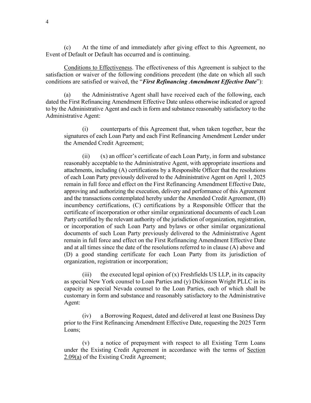 4 (c) At the time of and immediately after giving effect to this Agreement, no Event of Default or Default has occurred and is continuing. Conditions to Effectiveness. The effectiveness of this Agreement is subject to the satisfaction or waiver of the following conditions precedent (the date on which all such conditions are satisfied or waived, the “First Refinancing Amendment Effective Date”): (a) the Administrative Agent shall have received each of the following, each dated the First Refinancing Amendment Effective Date unless otherwise indicated or agreed to by the Administrative Agent and each in form and substance reasonably satisfactory to the Administrative Agent: (i) counterparts of this Agreement that, when taken together, bear the signatures of each Loan Party and each First Refinancing Amendment Lender under the Amended Credit Agreement; (ii) (x) an officer’s certificate of each Loan Party, in form and substance reasonably acceptable to the Administrative Agent, with appropriate insertions and attachments, including (A) certifications by a Responsible Officer that the resolutions of each Loan Party previously delivered to the Administrative Agent on April 1, 2025 remain in full force and effect on the First Refinancing Amendment Effective Date, approving and authorizing the execution, delivery and performance of this Agreement and the transactions contemplated hereby under the Amended Credit Agreement, (B) incumbency certifications, (C) certifications by a Responsible Officer that the certificate of incorporation or other similar organizational documents of each Loan Party certified by the relevant authority of the jurisdiction of organization, registration, or incorporation of such Loan Party and bylaws or other similar organizational documents of such Loan Party previously delivered to the Administrative Agent remain in full force and effect on the First Refinancing Amendment Effective Date and at all times since the date of the resolutions referred to in clause (A) above and (D) a good standing certificate for each Loan Party from its jurisdiction of organization, registration or incorporation; (iii) the executed legal opinion of (x) Freshfields US LLP, in its capacity as special New York counsel to Loan Parties and (y) Dickinson Wright PLLC in its capacity as special Nevada counsel to the Loan Parties, each of which shall be customary in form and substance and reasonably satisfactory to the Administrative Agent: (iv) a Borrowing Request, dated and delivered at least one Business Day prior to the First Refinancing Amendment Effective Date, requesting the 2025 Term Loans; (v) a notice of prepayment with respect to all Existing Term Loans under the Existing Credit Agreement in accordance with the terms of Section 2.09(a) of the Existing Credit Agreement;