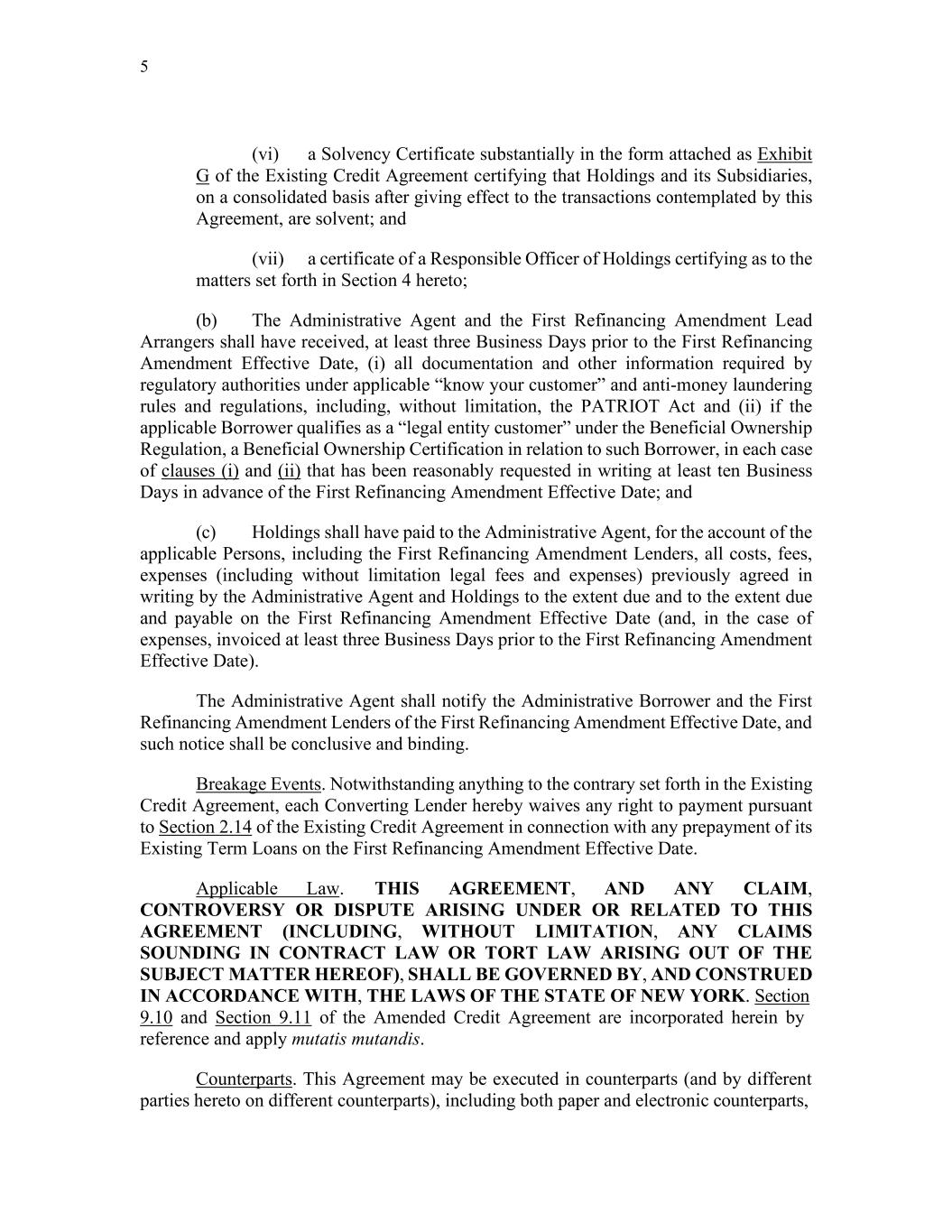 5 (vi) a Solvency Certificate substantially in the form attached as Exhibit G of the Existing Credit Agreement certifying that Holdings and its Subsidiaries, on a consolidated basis after giving effect to the transactions contemplated by this Agreement, are solvent; and (vii) a certificate of a Responsible Officer of Holdings certifying as to the matters set forth in Section 4 hereto; (b) The Administrative Agent and the First Refinancing Amendment Lead Arrangers shall have received, at least three Business Days prior to the First Refinancing Amendment Effective Date, (i) all documentation and other information required by regulatory authorities under applicable “know your customer” and anti-money laundering rules and regulations, including, without limitation, the PATRIOT Act and (ii) if the applicable Borrower qualifies as a “legal entity customer” under the Beneficial Ownership Regulation, a Beneficial Ownership Certification in relation to such Borrower, in each case of clauses (i) and (ii) that has been reasonably requested in writing at least ten Business Days in advance of the First Refinancing Amendment Effective Date; and (c) Holdings shall have paid to the Administrative Agent, for the account of the applicable Persons, including the First Refinancing Amendment Lenders, all costs, fees, expenses (including without limitation legal fees and expenses) previously agreed in writing by the Administrative Agent and Holdings to the extent due and to the extent due and payable on the First Refinancing Amendment Effective Date (and, in the case of expenses, invoiced at least three Business Days prior to the First Refinancing Amendment Effective Date). The Administrative Agent shall notify the Administrative Borrower and the First Refinancing Amendment Lenders of the First Refinancing Amendment Effective Date, and such notice shall be conclusive and binding. Breakage Events. Notwithstanding anything to the contrary set forth in the Existing Credit Agreement, each Converting Lender hereby waives any right to payment pursuant to Section 2.14 of the Existing Credit Agreement in connection with any prepayment of its Existing Term Loans on the First Refinancing Amendment Effective Date. Applicable Law. THIS AGREEMENT, AND ANY CLAIM, CONTROVERSY OR DISPUTE ARISING UNDER OR RELATED TO THIS AGREEMENT (INCLUDING, WITHOUT LIMITATION, ANY CLAIMS SOUNDING IN CONTRACT LAW OR TORT LAW ARISING OUT OF THE SUBJECT MATTER HEREOF), SHALL BE GOVERNED BY, AND CONSTRUED IN ACCORDANCE WITH, THE LAWS OF THE STATE OF NEW YORK. Section 9.10 and Section 9.11 of the Amended Credit Agreement are incorporated herein by reference and apply mutatis mutandis. Counterparts. This Agreement may be executed in counterparts (and by different parties hereto on different counterparts), including both paper and electronic counterparts,