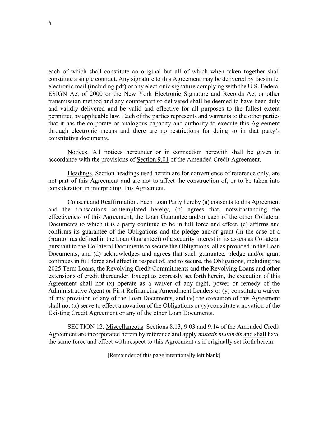 6 each of which shall constitute an original but all of which when taken together shall constitute a single contract. Any signature to this Agreement may be delivered by facsimile, electronic mail (including pdf) or any electronic signature complying with the U.S. Federal ESIGN Act of 2000 or the New York Electronic Signature and Records Act or other transmission method and any counterpart so delivered shall be deemed to have been duly and validly delivered and be valid and effective for all purposes to the fullest extent permitted by applicable law. Each of the parties represents and warrants to the other parties that it has the corporate or analogous capacity and authority to execute this Agreement through electronic means and there are no restrictions for doing so in that party’s constitutive documents. Notices. All notices hereunder or in connection herewith shall be given in accordance with the provisions of Section 9.01 of the Amended Credit Agreement. Headings. Section headings used herein are for convenience of reference only, are not part of this Agreement and are not to affect the construction of, or to be taken into consideration in interpreting, this Agreement. Consent and Reaffirmation. Each Loan Party hereby (a) consents to this Agreement and the transactions contemplated hereby, (b) agrees that, notwithstanding the effectiveness of this Agreement, the Loan Guarantee and/or each of the other Collateral Documents to which it is a party continue to be in full force and effect, (c) affirms and confirms its guarantee of the Obligations and the pledge and/or grant (in the case of a Grantor (as defined in the Loan Guarantee)) of a security interest in its assets as Collateral pursuant to the Collateral Documents to secure the Obligations, all as provided in the Loan Documents, and (d) acknowledges and agrees that such guarantee, pledge and/or grant continues in full force and effect in respect of, and to secure, the Obligations, including the 2025 Term Loans, the Revolving Credit Commitments and the Revolving Loans and other extensions of credit thereunder. Except as expressly set forth herein, the execution of this Agreement shall not (x) operate as a waiver of any right, power or remedy of the Administrative Agent or First Refinancing Amendment Lenders or (y) constitute a waiver of any provision of any of the Loan Documents, and (v) the execution of this Agreement shall not (x) serve to effect a novation of the Obligations or (y) constitute a novation of the Existing Credit Agreement or any of the other Loan Documents. SECTION 12. Miscellaneous. Sections 8.13, 9.03 and 9.14 of the Amended Credit Agreement are incorporated herein by reference and apply mutatis mutandis and shall have the same force and effect with respect to this Agreement as if originally set forth herein. [Remainder of this page intentionally left blank]