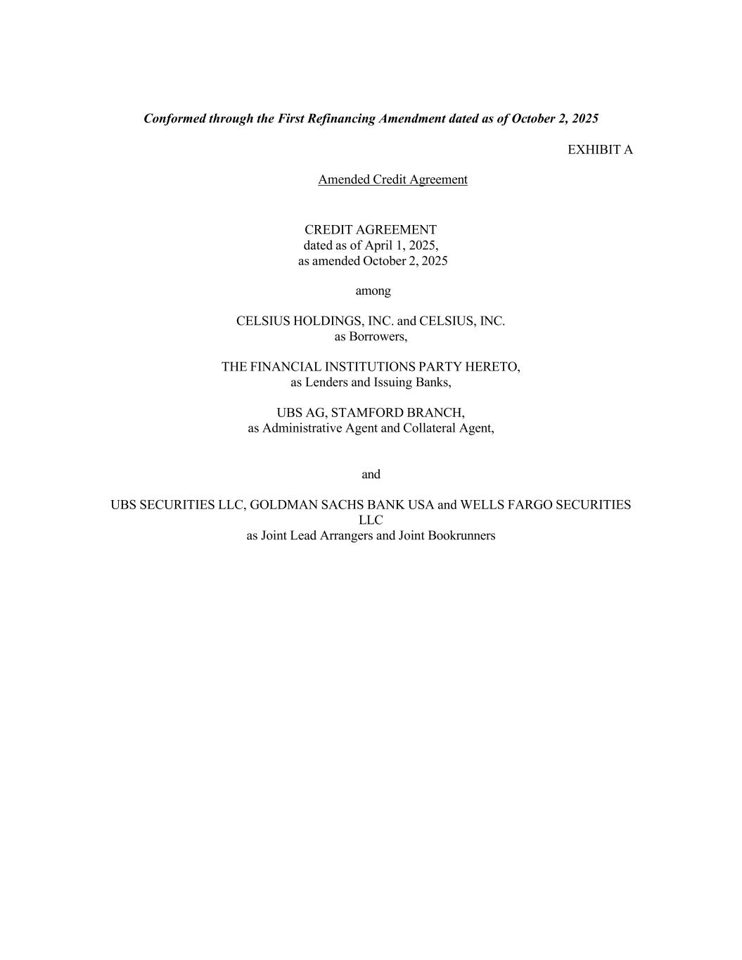 Conformed through the First Refinancing Amendment dated as of October 2, 2025 EXHIBIT A Amended Credit Agreement CREDIT AGREEMENT dated as of April 1, 2025, as amended October 2, 2025 among CELSIUS HOLDINGS, INC. and CELSIUS, INC. as Borrowers, THE FINANCIAL INSTITUTIONS PARTY HERETO, as Lenders and Issuing Banks, UBS AG, STAMFORD BRANCH, as Administrative Agent and Collateral Agent, and UBS SECURITIES LLC, GOLDMAN SACHS BANK USA and WELLS FARGO SECURITIES LLC as Joint Lead Arrangers and Joint Bookrunners