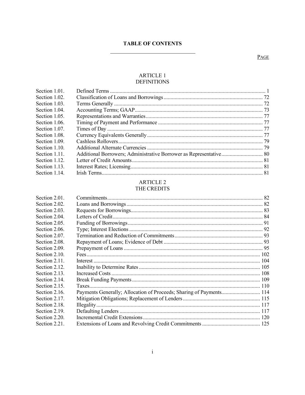 i TABLE OF CONTENTS PAGE ARTICLE 1 DEFINITIONS Section 1.01. Defined Terms ................................................................................................................. 1 Section 1.02. Classification of Loans and Borrowings ........................................................................ 72 Section 1.03. Terms Generally ............................................................................................................ 72 Section 1.04. Accounting Terms; GAAP ............................................................................................. 73 Section 1.05. Representations and Warranties ..................................................................................... 77 Section 1.06. Timing of Payment and Performance ............................................................................ 77 Section 1.07. Times of Day ................................................................................................................. 77 Section 1.08. Currency Equivalents Generally .................................................................................... 77 Section 1.09. Cashless Rollovers ......................................................................................................... 79 Section 1.10. Additional Alternate Currencies .................................................................................... 79 Section 1.11. Additional Borrowers; Administrative Borrower as Representative .............................. 80 Section 1.12. Letter of Credit Amounts ............................................................................................... 81 Section 1.13. Interest Rates; Licensing ................................................................................................ 81 Section 1.14. Irish Terms ..................................................................................................................... 81 ARTICLE 2 THE CREDITS Section 2.01. Commitments ................................................................................................................. 82 Section 2.02. Loans and Borrowings ................................................................................................... 82 Section 2.03. Requests for Borrowings................................................................................................ 83 Section 2.04. Letters of Credit ............................................................................................................. 84 Section 2.05. Funding of Borrowings .................................................................................................. 91 Section 2.06. Type; Interest Elections ................................................................................................. 92 Section 2.07. Termination and Reduction of Commitments ................................................................ 93 Section 2.08. Repayment of Loans; Evidence of Debt ........................................................................ 93 Section 2.09. Prepayment of Loans ..................................................................................................... 95 Section 2.10. Fees .............................................................................................................................. 102 Section 2.11. Interest ......................................................................................................................... 104 Section 2.12. Inability to Determine Rates ........................................................................................ 105 Section 2.13. Increased Costs ............................................................................................................ 108 Section 2.14. Break Funding Payments ............................................................................................. 109 Section 2.15. Taxes ............................................................................................................................ 110 Section 2.16. Payments Generally; Allocation of Proceeds; Sharing of Payments ............................ 114 Section 2.17. Mitigation Obligations; Replacement of Lenders ........................................................ 115 Section 2.18. Illegality ....................................................................................................................... 117 Section 2.19. Defaulting Lenders ...................................................................................................... 117 Section 2.20. Incremental Credit Extensions ..................................................................................... 120 Section 2.21. Extensions of Loans and Revolving Credit Commitments .......................................... 125