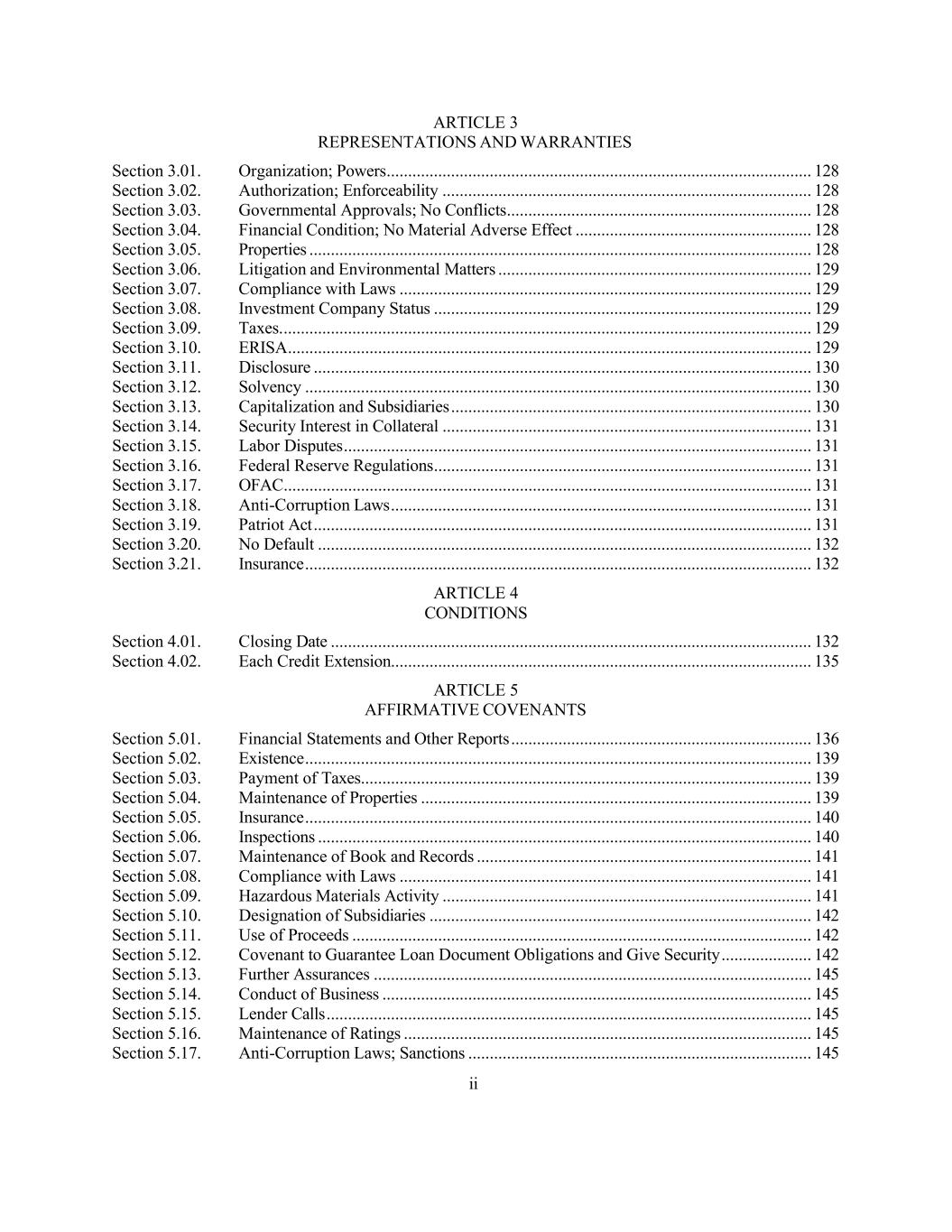 ii ARTICLE 3 REPRESENTATIONS AND WARRANTIES Section 3.01. Organization; Powers ................................................................................................... 128 Section 3.02. Authorization; Enforceability ...................................................................................... 128 Section 3.03. Governmental Approvals; No Conflicts ....................................................................... 128 Section 3.04. Financial Condition; No Material Adverse Effect ....................................................... 128 Section 3.05. Properties ..................................................................................................................... 128 Section 3.06. Litigation and Environmental Matters ......................................................................... 129 Section 3.07. Compliance with Laws ................................................................................................ 129 Section 3.08. Investment Company Status ........................................................................................ 129 Section 3.09. Taxes. ........................................................................................................................... 129 Section 3.10. ERISA .......................................................................................................................... 129 Section 3.11. Disclosure .................................................................................................................... 130 Section 3.12. Solvency ...................................................................................................................... 130 Section 3.13. Capitalization and Subsidiaries .................................................................................... 130 Section 3.14. Security Interest in Collateral ...................................................................................... 131 Section 3.15. Labor Disputes ............................................................................................................. 131 Section 3.16. Federal Reserve Regulations ........................................................................................ 131 Section 3.17. OFAC ........................................................................................................................... 131 Section 3.18. Anti-Corruption Laws .................................................................................................. 131 Section 3.19. Patriot Act .................................................................................................................... 131 Section 3.20. No Default ................................................................................................................... 132 Section 3.21. Insurance ...................................................................................................................... 132 ARTICLE 4 CONDITIONS Section 4.01. Closing Date ................................................................................................................ 132 Section 4.02. Each Credit Extension.................................................................................................. 135 ARTICLE 5 AFFIRMATIVE COVENANTS Section 5.01. Financial Statements and Other Reports ...................................................................... 136 Section 5.02. Existence ...................................................................................................................... 139 Section 5.03. Payment of Taxes ......................................................................................................... 139 Section 5.04. Maintenance of Properties ........................................................................................... 139 Section 5.05. Insurance ...................................................................................................................... 140 Section 5.06. Inspections ................................................................................................................... 140 Section 5.07. Maintenance of Book and Records .............................................................................. 141 Section 5.08. Compliance with Laws ................................................................................................ 141 Section 5.09. Hazardous Materials Activity ...................................................................................... 141 Section 5.10. Designation of Subsidiaries ......................................................................................... 142 Section 5.11. Use of Proceeds ........................................................................................................... 142 Section 5.12. Covenant to Guarantee Loan Document Obligations and Give Security ..................... 142 Section 5.13. Further Assurances ...................................................................................................... 145 Section 5.14. Conduct of Business .................................................................................................... 145 Section 5.15. Lender Calls ................................................................................................................. 145 Section 5.16. Maintenance of Ratings ............................................................................................... 145 Section 5.17. Anti-Corruption Laws; Sanctions ................................................................................ 145