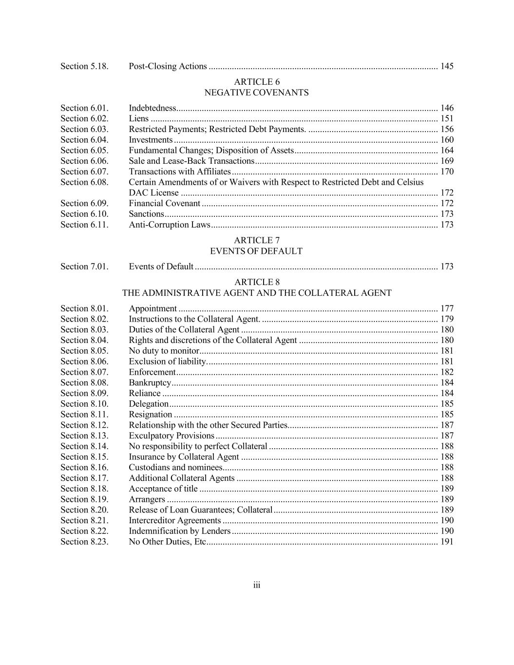 iii Section 5.18. Post-Closing Actions ................................................................................................... 145 ARTICLE 6 NEGATIVE COVENANTS Section 6.01. Indebtedness ................................................................................................................. 146 Section 6.02. Liens ............................................................................................................................ 151 Section 6.03. Restricted Payments; Restricted Debt Payments. ........................................................ 156 Section 6.04. Investments .................................................................................................................. 160 Section 6.05. Fundamental Changes; Disposition of Assets .............................................................. 164 Section 6.06. Sale and Lease-Back Transactions ............................................................................... 169 Section 6.07. Transactions with Affiliates ......................................................................................... 170 Section 6.08. Certain Amendments of or Waivers with Respect to Restricted Debt and Celsius DAC License ............................................................................................................... 172 Section 6.09. Financial Covenant ...................................................................................................... 172 Section 6.10. Sanctions ...................................................................................................................... 173 Section 6.11. Anti-Corruption Laws .................................................................................................. 173 ARTICLE 7 EVENTS OF DEFAULT Section 7.01. Events of Default ......................................................................................................... 173 ARTICLE 8 THE ADMINISTRATIVE AGENT AND THE COLLATERAL AGENT Section 8.01. Appointment ................................................................................................................ 177 Section 8.02. Instructions to the Collateral Agent. ............................................................................ 179 Section 8.03. Duties of the Collateral Agent ..................................................................................... 180 Section 8.04. Rights and discretions of the Collateral Agent ............................................................ 180 Section 8.05. No duty to monitor ....................................................................................................... 181 Section 8.06. Exclusion of liability. ................................................................................................... 181 Section 8.07. Enforcement ................................................................................................................. 182 Section 8.08. Bankruptcy ................................................................................................................... 184 Section 8.09. Reliance ....................................................................................................................... 184 Section 8.10. Delegation .................................................................................................................... 185 Section 8.11. Resignation .................................................................................................................. 185 Section 8.12. Relationship with the other Secured Parties ................................................................. 187 Section 8.13. Exculpatory Provisions ................................................................................................ 187 Section 8.14. No responsibility to perfect Collateral ......................................................................... 188 Section 8.15. Insurance by Collateral Agent ..................................................................................... 188 Section 8.16. Custodians and nominees ............................................................................................. 188 Section 8.17. Additional Collateral Agents ....................................................................................... 188 Section 8.18. Acceptance of title ....................................................................................................... 189 Section 8.19. Arrangers ..................................................................................................................... 189 Section 8.20. Release of Loan Guarantees; Collateral ....................................................................... 189 Section 8.21. Intercreditor Agreements ............................................................................................. 190 Section 8.22. Indemnification by Lenders ......................................................................................... 190 Section 8.23. No Other Duties, Etc .................................................................................................... 191