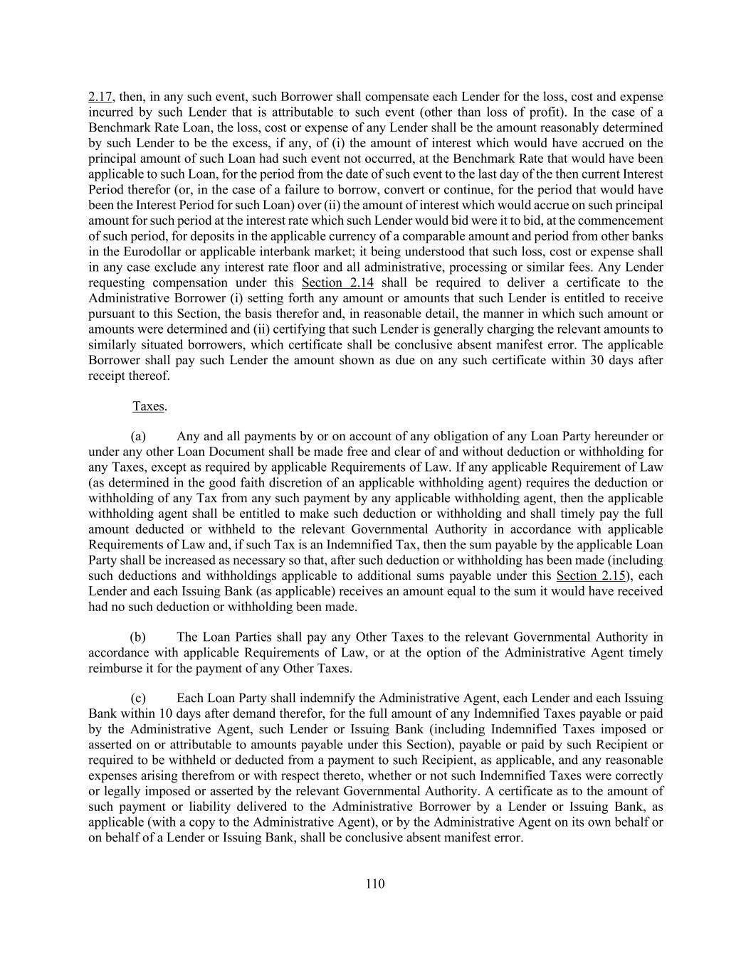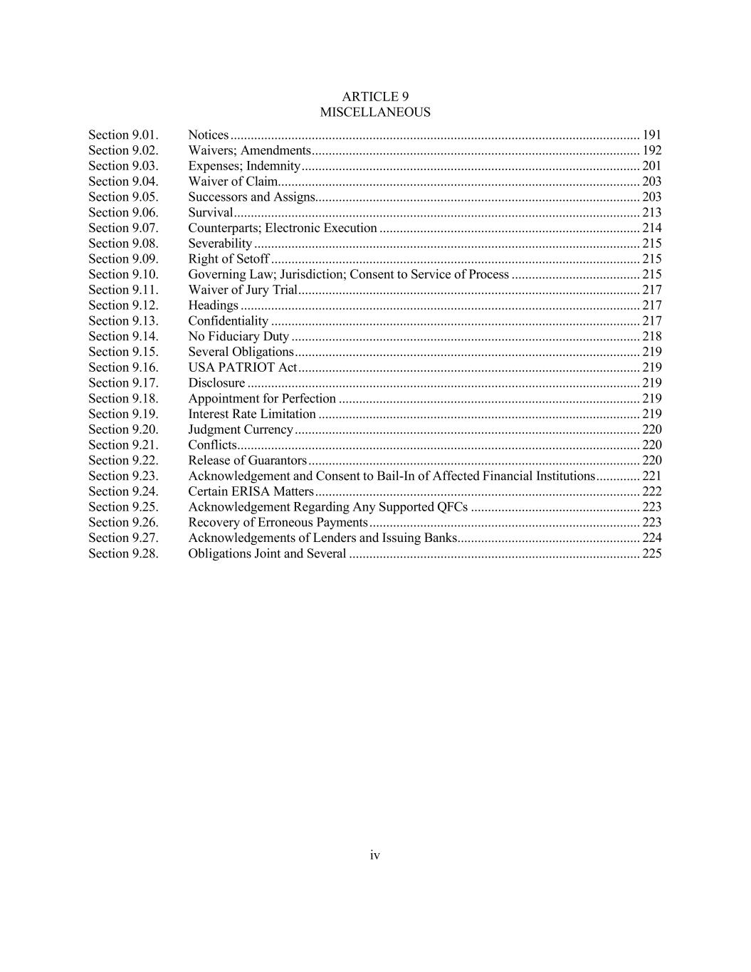 iv ARTICLE 9 MISCELLANEOUS Section 9.01. Notices ......................................................................................................................... 191 Section 9.02. Waivers; Amendments ................................................................................................. 192 Section 9.03. Expenses; Indemnity .................................................................................................... 201 Section 9.04. Waiver of Claim ........................................................................................................... 203 Section 9.05. Successors and Assigns................................................................................................ 203 Section 9.06. Survival ........................................................................................................................ 213 Section 9.07. Counterparts; Electronic Execution ............................................................................. 214 Section 9.08. Severability .................................................................................................................. 215 Section 9.09. Right of Setoff ............................................................................................................. 215 Section 9.10. Governing Law; Jurisdiction; Consent to Service of Process ...................................... 215 Section 9.11. Waiver of Jury Trial ..................................................................................................... 217 Section 9.12. Headings ...................................................................................................................... 217 Section 9.13. Confidentiality ............................................................................................................. 217 Section 9.14. No Fiduciary Duty ....................................................................................................... 218 Section 9.15. Several Obligations ...................................................................................................... 219 Section 9.16. USA PATRIOT Act ..................................................................................................... 219 Section 9.17. Disclosure .................................................................................................................... 219 Section 9.18. Appointment for Perfection ......................................................................................... 219 Section 9.19. Interest Rate Limitation ............................................................................................... 219 Section 9.20. Judgment Currency ...................................................................................................... 220 Section 9.21. Conflicts ....................................................................................................................... 220 Section 9.22. Release of Guarantors .................................................................................................. 220 Section 9.23. Acknowledgement and Consent to Bail-In of Affected Financial Institutions ............. 221 Section 9.24. Certain ERISA Matters ................................................................................................ 222 Section 9.25. Acknowledgement Regarding Any Supported QFCs .................................................. 223 Section 9.26. Recovery of Erroneous Payments ................................................................................ 223 Section 9.27. Acknowledgements of Lenders and Issuing Banks ...................................................... 224 Section 9.28. Obligations Joint and Several ...................................................................................... 225
