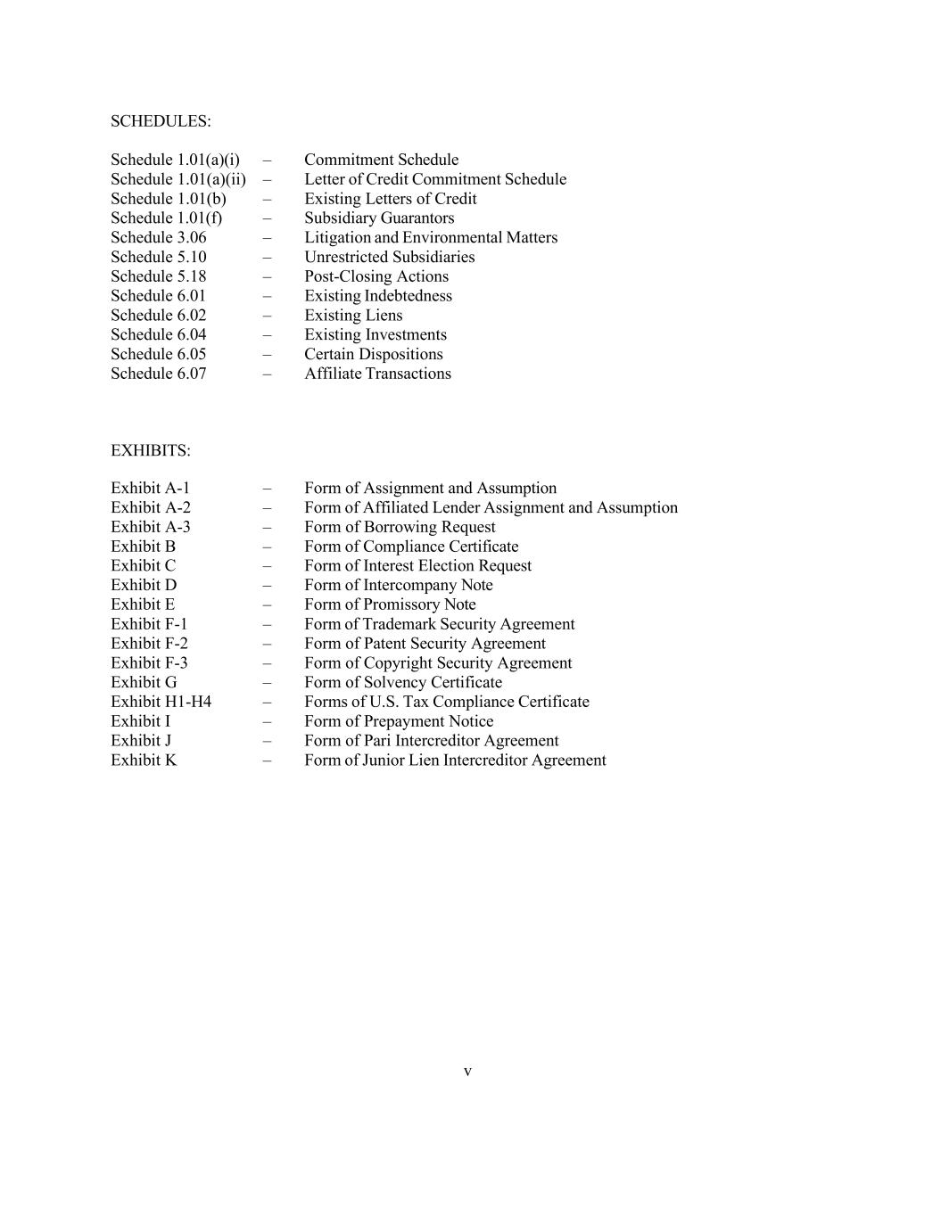 v SCHEDULES: Schedule 1.01(a)(i) – Commitment Schedule Schedule 1.01(a)(ii) – Letter of Credit Commitment Schedule Schedule 1.01(b) – Existing Letters of Credit Schedule 1.01(f) – Subsidiary Guarantors Schedule 3.06 – Litigation and Environmental Matters Schedule 5.10 – Unrestricted Subsidiaries Schedule 5.18 – Post-Closing Actions Schedule 6.01 – Existing Indebtedness Schedule 6.02 – Existing Liens Schedule 6.04 – Existing Investments Schedule 6.05 – Certain Dispositions Schedule 6.07 – Affiliate Transactions EXHIBITS: Exhibit A-1 – Form of Assignment and Assumption Exhibit A-2 – Form of Affiliated Lender Assignment and Assumption Exhibit A-3 – Form of Borrowing Request Exhibit B – Form of Compliance Certificate Exhibit C – Form of Interest Election Request Exhibit D – Form of Intercompany Note Exhibit E – Form of Promissory Note Exhibit F-1 – Form of Trademark Security Agreement Exhibit F-2 – Form of Patent Security Agreement Exhibit F-3 – Form of Copyright Security Agreement Exhibit G – Form of Solvency Certificate Exhibit H1-H4 – Forms of U.S. Tax Compliance Certificate Exhibit I – Form of Prepayment Notice Exhibit J – Form of Pari Intercreditor Agreement Exhibit K – Form of Junior Lien Intercreditor Agreement