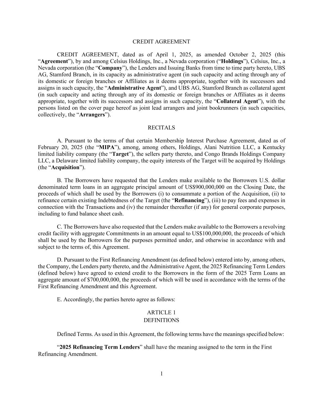 CREDIT AGREEMENT CREDIT AGREEMENT, dated as of April 1, 2025, as amended October 2, 2025 (this “Agreement”), by and among Celsius Holdings, Inc., a Nevada corporation (“Holdings”), Celsius, Inc., a Nevada corporation (the “Company”), the Lenders and Issuing Banks from time to time party hereto, UBS AG, Stamford Branch, in its capacity as administrative agent (in such capacity and acting through any of its domestic or foreign branches or Affiliates as it deems appropriate, together with its successors and assigns in such capacity, the “Administrative Agent”), and UBS AG, Stamford Branch as collateral agent (in such capacity and acting through any of its domestic or foreign branches or Affiliates as it deems appropriate, together with its successors and assigns in such capacity, the “Collateral Agent”), with the persons listed on the cover page hereof as joint lead arrangers and joint bookrunners (in such capacities, collectively, the “Arrangers”). RECITALS A. Pursuant to the terms of that certain Membership Interest Purchase Agreement, dated as of February 20, 2025 (the “MIPA”), among, among others, Holdings, Alani Nutrition LLC, a Kentucky limited liability company (the “Target”), the sellers party thereto, and Congo Brands Holdings Company LLC, a Delaware limited liability company, the equity interests of the Target will be acquired by Holdings (the “Acquisition”). B. The Borrowers have requested that the Lenders make available to the Borrowers U.S. dollar denominated term loans in an aggregate principal amount of US$900,000,000 on the Closing Date, the proceeds of which shall be used by the Borrowers (i) to consummate a portion of the Acquisition, (ii) to refinance certain existing Indebtedness of the Target (the “Refinancing”), (iii) to pay fees and expenses in connection with the Transactions and (iv) the remainder thereafter (if any) for general corporate purposes, including to fund balance sheet cash. C. The Borrowers have also requested that the Lenders make available to the Borrowers a revolving credit facility with aggregate Commitments in an amount equal to US$100,000,000, the proceeds of which shall be used by the Borrowers for the purposes permitted under, and otherwise in accordance with and subject to the terms of, this Agreement. D. Pursuant to the First Refinancing Amendment (as defined below) entered into by, among others, the Company, the Lenders party thereto, and the Administrative Agent, the 2025 Refinancing Term Lenders (defined below) have agreed to extend credit to the Borrowers in the form of the 2025 Term Loans an aggregate amount of $700,000,000, the proceeds of which will be used in accordance with the terms of the First Refinancing Amendment and this Agreement. E. Accordingly, the parties hereto agree as follows: ARTICLE 1 DEFINITIONS Defined Terms. As used in this Agreement, the following terms have the meanings specified below: “2025 Refinancing Term Lenders” shall have the meaning assigned to the term in the First Refinancing Amendment. 1
