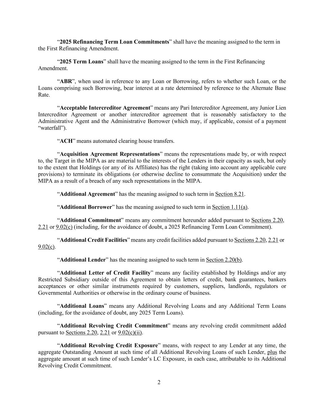 2 “2025 Refinancing Term Loan Commitments” shall have the meaning assigned to the term in the First Refinancing Amendment. “2025 Term Loans” shall have the meaning assigned to the term in the First Refinancing Amendment. “ABR”, when used in reference to any Loan or Borrowing, refers to whether such Loan, or the Loans comprising such Borrowing, bear interest at a rate determined by reference to the Alternate Base Rate. “Acceptable Intercreditor Agreement” means any Pari Intercreditor Agreement, any Junior Lien Intercreditor Agreement or another intercreditor agreement that is reasonably satisfactory to the Administrative Agent and the Administrative Borrower (which may, if applicable, consist of a payment “waterfall”). “ACH” means automated clearing house transfers. “Acquisition Agreement Representations” means the representations made by, or with respect to, the Target in the MIPA as are material to the interests of the Lenders in their capacity as such, but only to the extent that Holdings (or any of its Affiliates) has the right (taking into account any applicable cure provisions) to terminate its obligations (or otherwise decline to consummate the Acquisition) under the MIPA as a result of a breach of any such representations in the MIPA. “Additional Agreement” has the meaning assigned to such term in Section 8.21. “Additional Borrower” has the meaning assigned to such term in Section 1.11(a). “Additional Commitment” means any commitment hereunder added pursuant to Sections 2.20, 2.21 or 9.02(c) (including, for the avoidance of doubt, a 2025 Refinancing Term Loan Commitment). “Additional Credit Facilities” means any credit facilities added pursuant to Sections 2.20, 2.21 or 9.02(c). “Additional Lender” has the meaning assigned to such term in Section 2.20(b). “Additional Letter of Credit Facility” means any facility established by Holdings and/or any Restricted Subsidiary outside of this Agreement to obtain letters of credit, bank guarantees, bankers acceptances or other similar instruments required by customers, suppliers, landlords, regulators or Governmental Authorities or otherwise in the ordinary course of business. “Additional Loans” means any Additional Revolving Loans and any Additional Term Loans (including, for the avoidance of doubt, any 2025 Term Loans). “Additional Revolving Credit Commitment” means any revolving credit commitment added pursuant to Sections 2.20, 2.21 or 9.02(c)(ii). “Additional Revolving Credit Exposure” means, with respect to any Lender at any time, the aggregate Outstanding Amount at such time of all Additional Revolving Loans of such Lender, plus the aggregate amount at such time of such Lender’s LC Exposure, in each case, attributable to its Additional Revolving Credit Commitment.