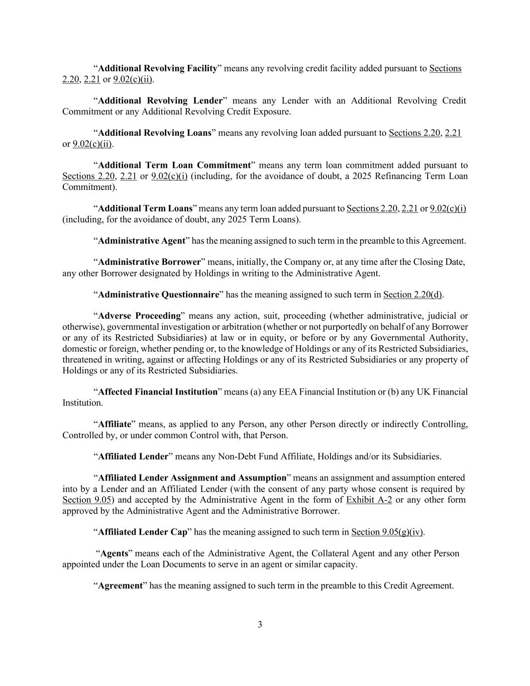 3 “Additional Revolving Facility” means any revolving credit facility added pursuant to Sections 2.20, 2.21 or 9.02(c)(ii). “Additional Revolving Lender” means any Lender with an Additional Revolving Credit Commitment or any Additional Revolving Credit Exposure. “Additional Revolving Loans” means any revolving loan added pursuant to Sections 2.20, 2.21 or 9.02(c)(ii). “Additional Term Loan Commitment” means any term loan commitment added pursuant to Sections 2.20, 2.21 or 9.02(c)(i) (including, for the avoidance of doubt, a 2025 Refinancing Term Loan Commitment). “Additional Term Loans” means any term loan added pursuant to Sections 2.20, 2.21 or 9.02(c)(i) (including, for the avoidance of doubt, any 2025 Term Loans). “Administrative Agent” has the meaning assigned to such term in the preamble to this Agreement. “Administrative Borrower” means, initially, the Company or, at any time after the Closing Date, any other Borrower designated by Holdings in writing to the Administrative Agent. “Administrative Questionnaire” has the meaning assigned to such term in Section 2.20(d). “Adverse Proceeding” means any action, suit, proceeding (whether administrative, judicial or otherwise), governmental investigation or arbitration (whether or not purportedly on behalf of any Borrower or any of its Restricted Subsidiaries) at law or in equity, or before or by any Governmental Authority, domestic or foreign, whether pending or, to the knowledge of Holdings or any of its Restricted Subsidiaries, threatened in writing, against or affecting Holdings or any of its Restricted Subsidiaries or any property of Holdings or any of its Restricted Subsidiaries. “Affected Financial Institution” means (a) any EEA Financial Institution or (b) any UK Financial Institution. “Affiliate” means, as applied to any Person, any other Person directly or indirectly Controlling, Controlled by, or under common Control with, that Person. “Affiliated Lender” means any Non-Debt Fund Affiliate, Holdings and/or its Subsidiaries. “Affiliated Lender Assignment and Assumption” means an assignment and assumption entered into by a Lender and an Affiliated Lender (with the consent of any party whose consent is required by Section 9.05) and accepted by the Administrative Agent in the form of Exhibit A-2 or any other form approved by the Administrative Agent and the Administrative Borrower. “Affiliated Lender Cap” has the meaning assigned to such term in Section 9.05(g)(iv). “Agents” means each of the Administrative Agent, the Collateral Agent and any other Person appointed under the Loan Documents to serve in an agent or similar capacity. “Agreement” has the meaning assigned to such term in the preamble to this Credit Agreement.