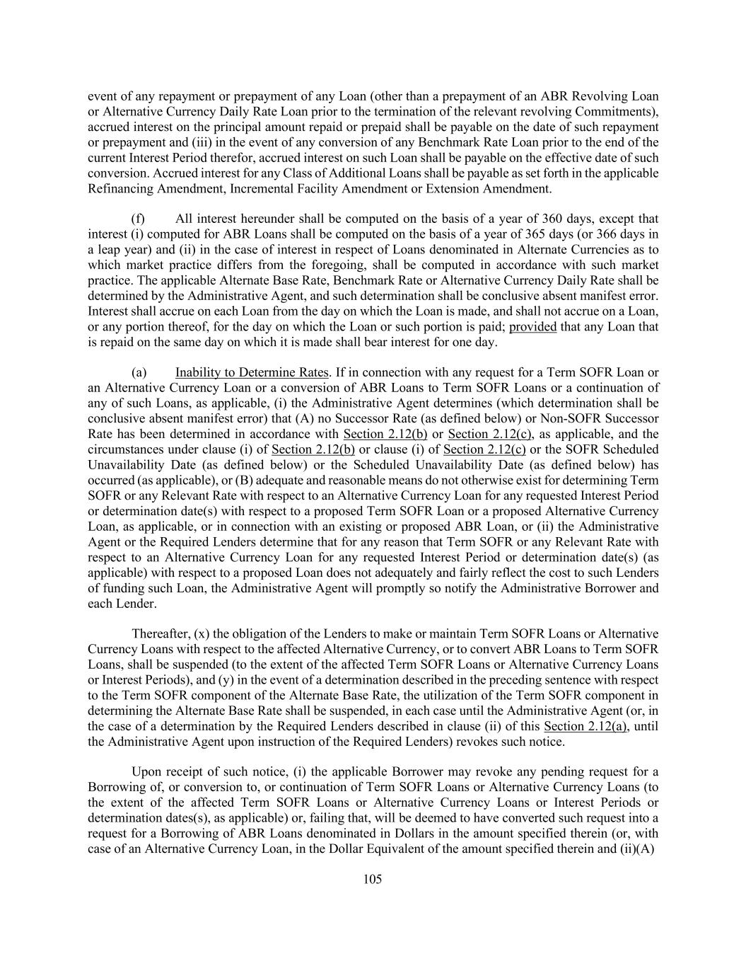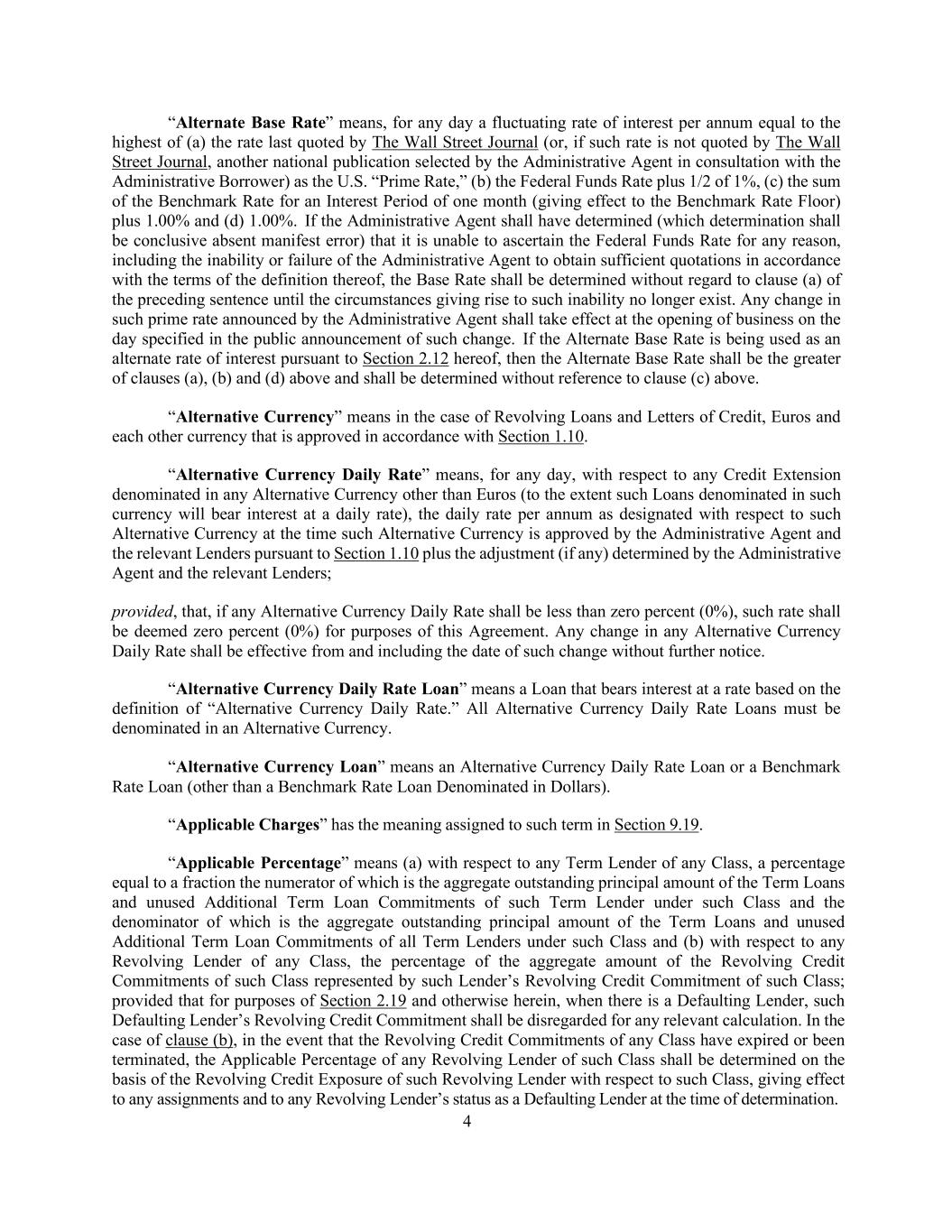 4 “Alternate Base Rate” means, for any day a fluctuating rate of interest per annum equal to the highest of (a) the rate last quoted by The Wall Street Journal (or, if such rate is not quoted by The Wall Street Journal, another national publication selected by the Administrative Agent in consultation with the Administrative Borrower) as the U.S. “Prime Rate,” (b) the Federal Funds Rate plus 1/2 of 1%, (c) the sum of the Benchmark Rate for an Interest Period of one month (giving effect to the Benchmark Rate Floor) plus 1.00% and (d) 1.00%. If the Administrative Agent shall have determined (which determination shall be conclusive absent manifest error) that it is unable to ascertain the Federal Funds Rate for any reason, including the inability or failure of the Administrative Agent to obtain sufficient quotations in accordance with the terms of the definition thereof, the Base Rate shall be determined without regard to clause (a) of the preceding sentence until the circumstances giving rise to such inability no longer exist. Any change in such prime rate announced by the Administrative Agent shall take effect at the opening of business on the day specified in the public announcement of such change. If the Alternate Base Rate is being used as an alternate rate of interest pursuant to Section 2.12 hereof, then the Alternate Base Rate shall be the greater of clauses (a), (b) and (d) above and shall be determined without reference to clause (c) above. “Alternative Currency” means in the case of Revolving Loans and Letters of Credit, Euros and each other currency that is approved in accordance with Section 1.10. “Alternative Currency Daily Rate” means, for any day, with respect to any Credit Extension denominated in any Alternative Currency other than Euros (to the extent such Loans denominated in such currency will bear interest at a daily rate), the daily rate per annum as designated with respect to such Alternative Currency at the time such Alternative Currency is approved by the Administrative Agent and the relevant Lenders pursuant to Section 1.10 plus the adjustment (if any) determined by the Administrative Agent and the relevant Lenders; provided, that, if any Alternative Currency Daily Rate shall be less than zero percent (0%), such rate shall be deemed zero percent (0%) for purposes of this Agreement. Any change in any Alternative Currency Daily Rate shall be effective from and including the date of such change without further notice. “Alternative Currency Daily Rate Loan” means a Loan that bears interest at a rate based on the definition of “Alternative Currency Daily Rate.” All Alternative Currency Daily Rate Loans must be denominated in an Alternative Currency. “Alternative Currency Loan” means an Alternative Currency Daily Rate Loan or a Benchmark Rate Loan (other than a Benchmark Rate Loan Denominated in Dollars). “Applicable Charges” has the meaning assigned to such term in Section 9.19. “Applicable Percentage” means (a) with respect to any Term Lender of any Class, a percentage equal to a fraction the numerator of which is the aggregate outstanding principal amount of the Term Loans and unused Additional Term Loan Commitments of such Term Lender under such Class and the denominator of which is the aggregate outstanding principal amount of the Term Loans and unused Additional Term Loan Commitments of all Term Lenders under such Class and (b) with respect to any Revolving Lender of any Class, the percentage of the aggregate amount of the Revolving Credit Commitments of such Class represented by such Lender’s Revolving Credit Commitment of such Class; provided that for purposes of Section 2.19 and otherwise herein, when there is a Defaulting Lender, such Defaulting Lender’s Revolving Credit Commitment shall be disregarded for any relevant calculation. In the case of clause (b), in the event that the Revolving Credit Commitments of any Class have expired or been terminated, the Applicable Percentage of any Revolving Lender of such Class shall be determined on the basis of the Revolving Credit Exposure of such Revolving Lender with respect to such Class, giving effect to any assignments and to any Revolving Lender’s status as a Defaulting Lender at the time of determination.