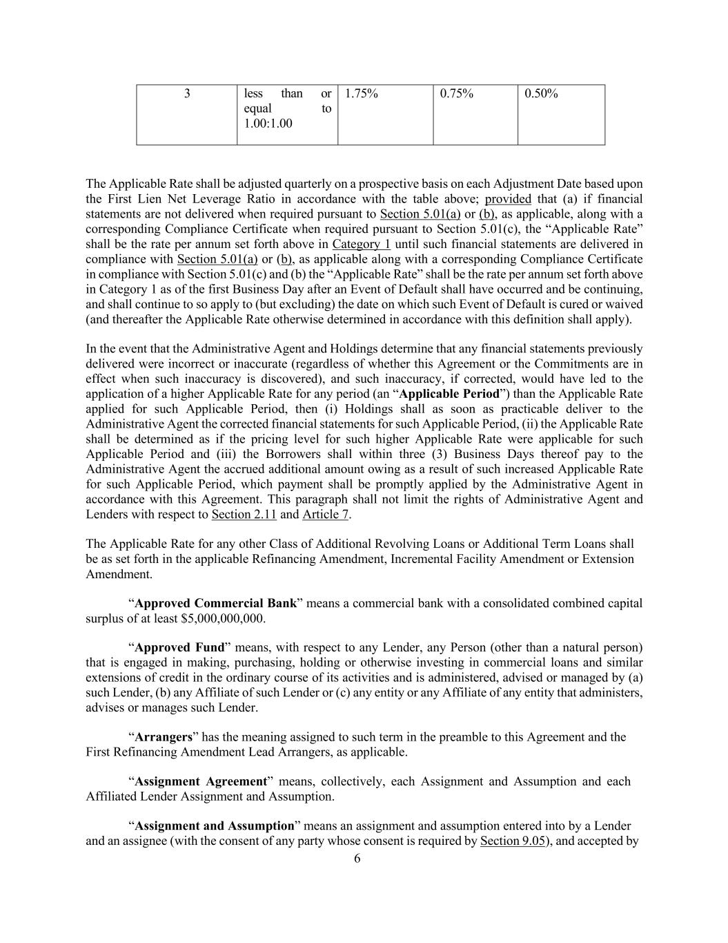 6 3 less than or equal to 1.00:1.00 1.75% 0.75% 0.50% The Applicable Rate shall be adjusted quarterly on a prospective basis on each Adjustment Date based upon the First Lien Net Leverage Ratio in accordance with the table above; provided that (a) if financial statements are not delivered when required pursuant to Section 5.01(a) or (b), as applicable, along with a corresponding Compliance Certificate when required pursuant to Section 5.01(c), the “Applicable Rate” shall be the rate per annum set forth above in Category 1 until such financial statements are delivered in compliance with Section 5.01(a) or (b), as applicable along with a corresponding Compliance Certificate in compliance with Section 5.01(c) and (b) the “Applicable Rate” shall be the rate per annum set forth above in Category 1 as of the first Business Day after an Event of Default shall have occurred and be continuing, and shall continue to so apply to (but excluding) the date on which such Event of Default is cured or waived (and thereafter the Applicable Rate otherwise determined in accordance with this definition shall apply). In the event that the Administrative Agent and Holdings determine that any financial statements previously delivered were incorrect or inaccurate (regardless of whether this Agreement or the Commitments are in effect when such inaccuracy is discovered), and such inaccuracy, if corrected, would have led to the application of a higher Applicable Rate for any period (an “Applicable Period”) than the Applicable Rate applied for such Applicable Period, then (i) Holdings shall as soon as practicable deliver to the Administrative Agent the corrected financial statements for such Applicable Period, (ii) the Applicable Rate shall be determined as if the pricing level for such higher Applicable Rate were applicable for such Applicable Period and (iii) the Borrowers shall within three (3) Business Days thereof pay to the Administrative Agent the accrued additional amount owing as a result of such increased Applicable Rate for such Applicable Period, which payment shall be promptly applied by the Administrative Agent in accordance with this Agreement. This paragraph shall not limit the rights of Administrative Agent and Lenders with respect to Section 2.11 and Article 7. The Applicable Rate for any other Class of Additional Revolving Loans or Additional Term Loans shall be as set forth in the applicable Refinancing Amendment, Incremental Facility Amendment or Extension Amendment. “Approved Commercial Bank” means a commercial bank with a consolidated combined capital surplus of at least $5,000,000,000. “Approved Fund” means, with respect to any Lender, any Person (other than a natural person) that is engaged in making, purchasing, holding or otherwise investing in commercial loans and similar extensions of credit in the ordinary course of its activities and is administered, advised or managed by (a) such Lender, (b) any Affiliate of such Lender or (c) any entity or any Affiliate of any entity that administers, advises or manages such Lender. “Arrangers” has the meaning assigned to such term in the preamble to this Agreement and the First Refinancing Amendment Lead Arrangers, as applicable. “Assignment Agreement” means, collectively, each Assignment and Assumption and each Affiliated Lender Assignment and Assumption. “Assignment and Assumption” means an assignment and assumption entered into by a Lender and an assignee (with the consent of any party whose consent is required by Section 9.05), and accepted by