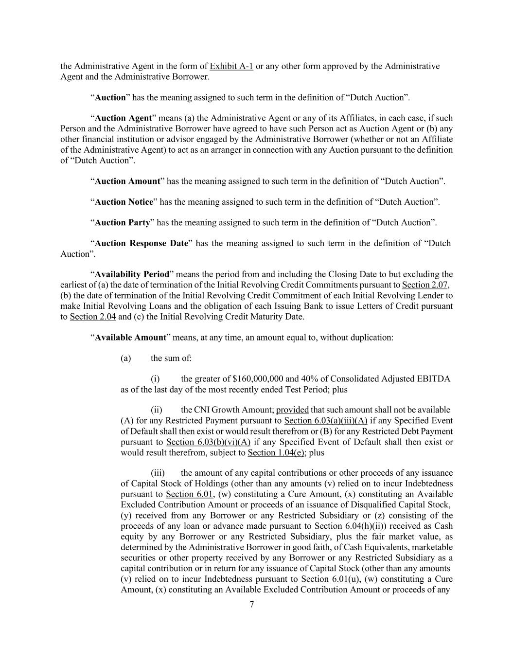 7 the Administrative Agent in the form of Exhibit A-1 or any other form approved by the Administrative Agent and the Administrative Borrower. “Auction” has the meaning assigned to such term in the definition of “Dutch Auction”. “Auction Agent” means (a) the Administrative Agent or any of its Affiliates, in each case, if such Person and the Administrative Borrower have agreed to have such Person act as Auction Agent or (b) any other financial institution or advisor engaged by the Administrative Borrower (whether or not an Affiliate of the Administrative Agent) to act as an arranger in connection with any Auction pursuant to the definition of “Dutch Auction”. “Auction Amount” has the meaning assigned to such term in the definition of “Dutch Auction”. “Auction Notice” has the meaning assigned to such term in the definition of “Dutch Auction”. “Auction Party” has the meaning assigned to such term in the definition of “Dutch Auction”. “Auction Response Date” has the meaning assigned to such term in the definition of “Dutch Auction”. “Availability Period” means the period from and including the Closing Date to but excluding the earliest of (a) the date of termination of the Initial Revolving Credit Commitments pursuant to Section 2.07, (b) the date of termination of the Initial Revolving Credit Commitment of each Initial Revolving Lender to make Initial Revolving Loans and the obligation of each Issuing Bank to issue Letters of Credit pursuant to Section 2.04 and (c) the Initial Revolving Credit Maturity Date. “Available Amount” means, at any time, an amount equal to, without duplication: (a) the sum of: (i) the greater of $160,000,000 and 40% of Consolidated Adjusted EBITDA as of the last day of the most recently ended Test Period; plus (ii) the CNI Growth Amount; provided that such amount shall not be available (A) for any Restricted Payment pursuant to Section 6.03(a)(iii)(A) if any Specified Event of Default shall then exist or would result therefrom or (B) for any Restricted Debt Payment pursuant to Section 6.03(b)(vi)(A) if any Specified Event of Default shall then exist or would result therefrom, subject to Section 1.04(e); plus (iii) the amount of any capital contributions or other proceeds of any issuance of Capital Stock of Holdings (other than any amounts (v) relied on to incur Indebtedness pursuant to Section 6.01, (w) constituting a Cure Amount, (x) constituting an Available Excluded Contribution Amount or proceeds of an issuance of Disqualified Capital Stock, (y) received from any Borrower or any Restricted Subsidiary or (z) consisting of the proceeds of any loan or advance made pursuant to Section 6.04(h)(ii)) received as Cash equity by any Borrower or any Restricted Subsidiary, plus the fair market value, as determined by the Administrative Borrower in good faith, of Cash Equivalents, marketable securities or other property received by any Borrower or any Restricted Subsidiary as a capital contribution or in return for any issuance of Capital Stock (other than any amounts (v) relied on to incur Indebtedness pursuant to Section 6.01(u), (w) constituting a Cure Amount, (x) constituting an Available Excluded Contribution Amount or proceeds of any