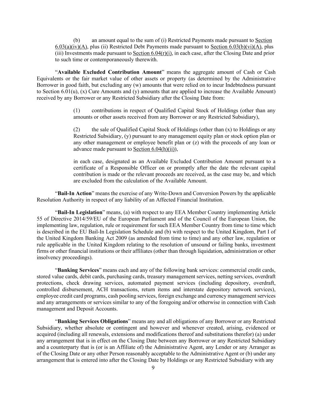 9 (b) an amount equal to the sum of (i) Restricted Payments made pursuant to Section 6.03(a)(iv)(A), plus (ii) Restricted Debt Payments made pursuant to Section 6.03(b)(vi)(A), plus (iii) Investments made pursuant to Section 6.04(r)(i), in each case, after the Closing Date and prior to such time or contemporaneously therewith. “Available Excluded Contribution Amount” means the aggregate amount of Cash or Cash Equivalents or the fair market value of other assets or property (as determined by the Administrative Borrower in good faith, but excluding any (w) amounts that were relied on to incur Indebtedness pursuant to Section 6.01(u), (x) Cure Amounts and (y) amounts that are applied to increase the Available Amount) received by any Borrower or any Restricted Subsidiary after the Closing Date from: (1) contributions in respect of Qualified Capital Stock of Holdings (other than any amounts or other assets received from any Borrower or any Restricted Subsidiary), (2) the sale of Qualified Capital Stock of Holdings (other than (x) to Holdings or any Restricted Subsidiary, (y) pursuant to any management equity plan or stock option plan or any other management or employee benefit plan or (z) with the proceeds of any loan or advance made pursuant to Section 6.04(h)(ii)), in each case, designated as an Available Excluded Contribution Amount pursuant to a certificate of a Responsible Officer on or promptly after the date the relevant capital contribution is made or the relevant proceeds are received, as the case may be, and which are excluded from the calculation of the Available Amount. “Bail-In Action” means the exercise of any Write-Down and Conversion Powers by the applicable Resolution Authority in respect of any liability of an Affected Financial Institution. “Bail-In Legislation” means, (a) with respect to any EEA Member Country implementing Article 55 of Directive 2014/59/EU of the European Parliament and of the Council of the European Union, the implementing law, regulation, rule or requirement for such EEA Member Country from time to time which is described in the EU Bail-In Legislation Schedule and (b) with respect to the United Kingdom, Part I of the United Kingdom Banking Act 2009 (as amended from time to time) and any other law, regulation or rule applicable in the United Kingdom relating to the resolution of unsound or failing banks, investment firms or other financial institutions or their affiliates (other than through liquidation, administration or other insolvency proceedings). “Banking Services” means each and any of the following bank services: commercial credit cards, stored value cards, debit cards, purchasing cards, treasury management services, netting services, overdraft protections, check drawing services, automated payment services (including depository, overdraft, controlled disbursement, ACH transactions, return items and interstate depository network services), employee credit card programs, cash pooling services, foreign exchange and currency management services and any arrangements or services similar to any of the foregoing and/or otherwise in connection with Cash management and Deposit Accounts. “Banking Services Obligations” means any and all obligations of any Borrower or any Restricted Subsidiary, whether absolute or contingent and however and whenever created, arising, evidenced or acquired (including all renewals, extensions and modifications thereof and substitutions therefor) (a) under any arrangement that is in effect on the Closing Date between any Borrower or any Restricted Subsidiary and a counterparty that is (or is an Affiliate of) the Administrative Agent, any Lender or any Arranger as of the Closing Date or any other Person reasonably acceptable to the Administrative Agent or (b) under any arrangement that is entered into after the Closing Date by Holdings or any Restricted Subsidiary with any