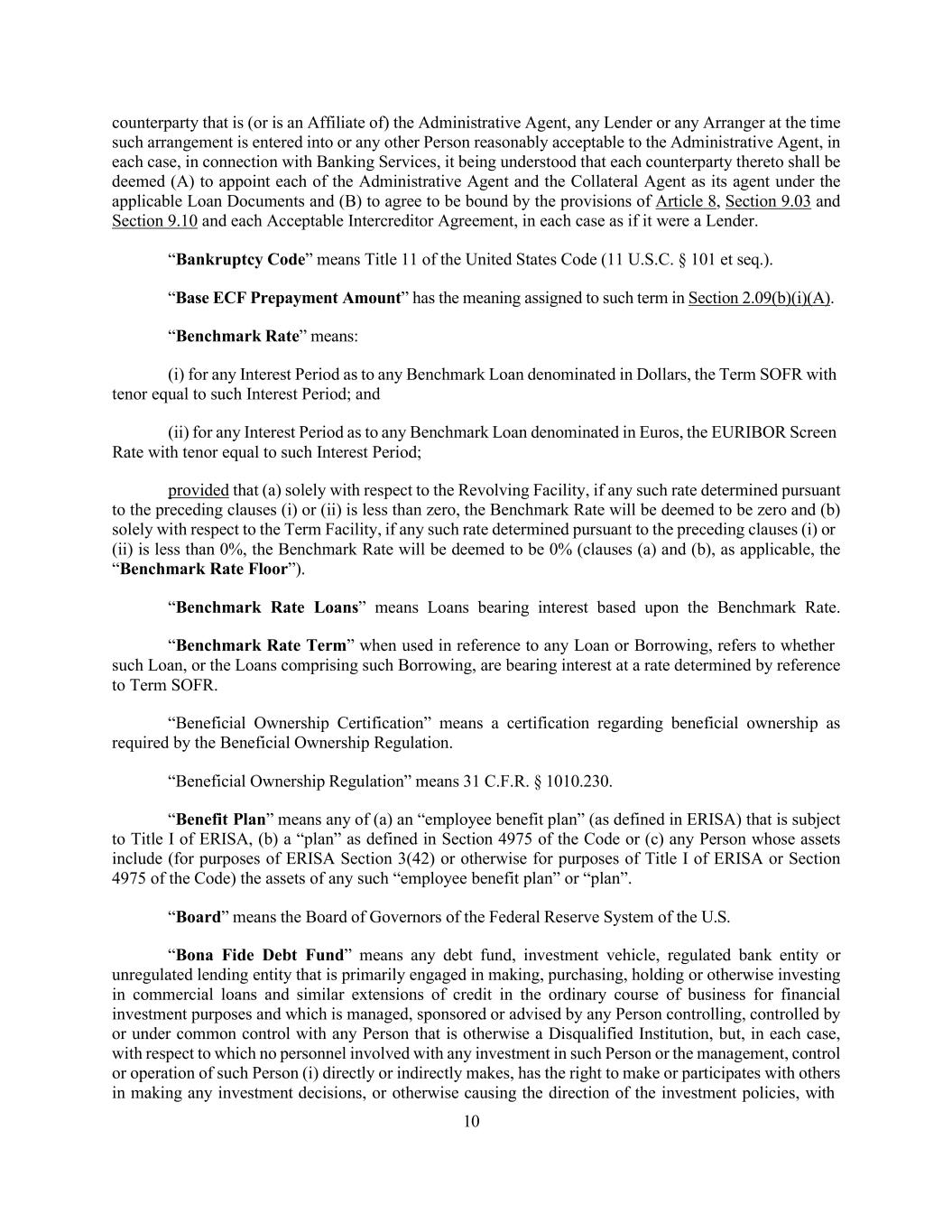 10 counterparty that is (or is an Affiliate of) the Administrative Agent, any Lender or any Arranger at the time such arrangement is entered into or any other Person reasonably acceptable to the Administrative Agent, in each case, in connection with Banking Services, it being understood that each counterparty thereto shall be deemed (A) to appoint each of the Administrative Agent and the Collateral Agent as its agent under the applicable Loan Documents and (B) to agree to be bound by the provisions of Article 8, Section 9.03 and Section 9.10 and each Acceptable Intercreditor Agreement, in each case as if it were a Lender. “Bankruptcy Code” means Title 11 of the United States Code (11 U.S.C. § 101 et seq.). “Base ECF Prepayment Amount” has the meaning assigned to such term in Section 2.09(b)(i)(A). “Benchmark Rate” means: (i) for any Interest Period as to any Benchmark Loan denominated in Dollars, the Term SOFR with tenor equal to such Interest Period; and (ii) for any Interest Period as to any Benchmark Loan denominated in Euros, the EURIBOR Screen Rate with tenor equal to such Interest Period; provided that (a) solely with respect to the Revolving Facility, if any such rate determined pursuant to the preceding clauses (i) or (ii) is less than zero, the Benchmark Rate will be deemed to be zero and (b) solely with respect to the Term Facility, if any such rate determined pursuant to the preceding clauses (i) or (ii) is less than 0%, the Benchmark Rate will be deemed to be 0% (clauses (a) and (b), as applicable, the “Benchmark Rate Floor”). “Benchmark Rate Loans” means Loans bearing interest based upon the Benchmark Rate. “Benchmark Rate Term” when used in reference to any Loan or Borrowing, refers to whether such Loan, or the Loans comprising such Borrowing, are bearing interest at a rate determined by reference to Term SOFR. “Beneficial Ownership Certification” means a certification regarding beneficial ownership as required by the Beneficial Ownership Regulation. “Beneficial Ownership Regulation” means 31 C.F.R. § 1010.230. “Benefit Plan” means any of (a) an “employee benefit plan” (as defined in ERISA) that is subject to Title I of ERISA, (b) a “plan” as defined in Section 4975 of the Code or (c) any Person whose assets include (for purposes of ERISA Section 3(42) or otherwise for purposes of Title I of ERISA or Section 4975 of the Code) the assets of any such “employee benefit plan” or “plan”. “Board” means the Board of Governors of the Federal Reserve System of the U.S. “Bona Fide Debt Fund” means any debt fund, investment vehicle, regulated bank entity or unregulated lending entity that is primarily engaged in making, purchasing, holding or otherwise investing in commercial loans and similar extensions of credit in the ordinary course of business for financial investment purposes and which is managed, sponsored or advised by any Person controlling, controlled by or under common control with any Person that is otherwise a Disqualified Institution, but, in each case, with respect to which no personnel involved with any investment in such Person or the management, control or operation of such Person (i) directly or indirectly makes, has the right to make or participates with others in making any investment decisions, or otherwise causing the direction of the investment policies, with