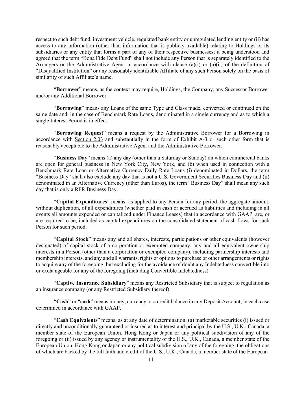 11 respect to such debt fund, investment vehicle, regulated bank entity or unregulated lending entity or (ii) has access to any information (other than information that is publicly available) relating to Holdings or its subsidiaries or any entity that forms a part of any of their respective businesses; it being understood and agreed that the term “Bona Fide Debt Fund” shall not include any Person that is separately identified to the Arrangers or the Administrative Agent in accordance with clause (a)(i) or (a)(ii) of the definition of “Disqualified Institution” or any reasonably identifiable Affiliate of any such Person solely on the basis of similarity of such Affiliate’s name. “Borrower” means, as the context may require, Holdings, the Company, any Successor Borrower and/or any Additional Borrower. “Borrowing” means any Loans of the same Type and Class made, converted or continued on the same date and, in the case of Benchmark Rate Loans, denominated in a single currency and as to which a single Interest Period is in effect. “Borrowing Request” means a request by the Administrative Borrower for a Borrowing in accordance with Section 2.03 and substantially in the form of Exhibit A-3 or such other form that is reasonably acceptable to the Administrative Agent and the Administrative Borrower. “Business Day” means (a) any day (other than a Saturday or Sunday) on which commercial banks are open for general business in New York City, New York, and (b) when used in connection with a Benchmark Rate Loan or Alternative Currency Daily Rate Loans (i) denominated in Dollars, the term “Business Day” shall also exclude any day that is not a U.S. Government Securities Business Day and (ii) denominated in an Alternative Currency (other than Euros), the term “Business Day” shall mean any such day that is only a RFR Business Day. “Capital Expenditures” means, as applied to any Person for any period, the aggregate amount, without duplication, of all expenditures (whether paid in cash or accrued as liabilities and including in all events all amounts expended or capitalized under Finance Leases) that in accordance with GAAP, are, or are required to be, included as capital expenditures on the consolidated statement of cash flows for such Person for such period. “Capital Stock” means any and all shares, interests, participations or other equivalents (however designated) of capital stock of a corporation or exempted company, any and all equivalent ownership interests in a Person (other than a corporation or exempted company), including partnership interests and membership interests, and any and all warrants, rights or options to purchase or other arrangements or rights to acquire any of the foregoing, but excluding for the avoidance of doubt any Indebtedness convertible into or exchangeable for any of the foregoing (including Convertible Indebtedness). “Captive Insurance Subsidiary” means any Restricted Subsidiary that is subject to regulation as an insurance company (or any Restricted Subsidiary thereof). “Cash” or “cash” means money, currency or a credit balance in any Deposit Account, in each case determined in accordance with GAAP. “Cash Equivalents” means, as at any date of determination, (a) marketable securities (i) issued or directly and unconditionally guaranteed or insured as to interest and principal by the U.S., U.K., Canada, a member state of the European Union, Hong Kong or Japan or any political subdivision of any of the foregoing or (ii) issued by any agency or instrumentality of the U.S., U.K., Canada, a member state of the European Union, Hong Kong or Japan or any political subdivision of any of the foregoing, the obligations of which are backed by the full faith and credit of the U.S., U.K., Canada, a member state of the European