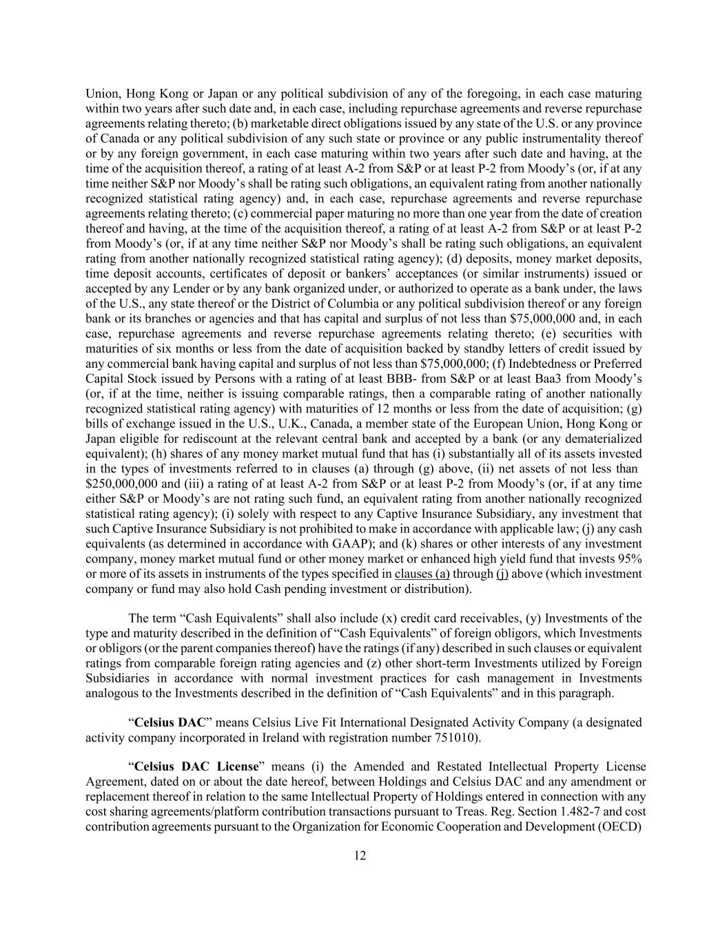 12 Union, Hong Kong or Japan or any political subdivision of any of the foregoing, in each case maturing within two years after such date and, in each case, including repurchase agreements and reverse repurchase agreements relating thereto; (b) marketable direct obligations issued by any state of the U.S. or any province of Canada or any political subdivision of any such state or province or any public instrumentality thereof or by any foreign government, in each case maturing within two years after such date and having, at the time of the acquisition thereof, a rating of at least A-2 from S&P or at least P-2 from Moody’s (or, if at any time neither S&P nor Moody’s shall be rating such obligations, an equivalent rating from another nationally recognized statistical rating agency) and, in each case, repurchase agreements and reverse repurchase agreements relating thereto; (c) commercial paper maturing no more than one year from the date of creation thereof and having, at the time of the acquisition thereof, a rating of at least A-2 from S&P or at least P-2 from Moody’s (or, if at any time neither S&P nor Moody’s shall be rating such obligations, an equivalent rating from another nationally recognized statistical rating agency); (d) deposits, money market deposits, time deposit accounts, certificates of deposit or bankers’ acceptances (or similar instruments) issued or accepted by any Lender or by any bank organized under, or authorized to operate as a bank under, the laws of the U.S., any state thereof or the District of Columbia or any political subdivision thereof or any foreign bank or its branches or agencies and that has capital and surplus of not less than $75,000,000 and, in each case, repurchase agreements and reverse repurchase agreements relating thereto; (e) securities with maturities of six months or less from the date of acquisition backed by standby letters of credit issued by any commercial bank having capital and surplus of not less than $75,000,000; (f) Indebtedness or Preferred Capital Stock issued by Persons with a rating of at least BBB- from S&P or at least Baa3 from Moody’s (or, if at the time, neither is issuing comparable ratings, then a comparable rating of another nationally recognized statistical rating agency) with maturities of 12 months or less from the date of acquisition; (g) bills of exchange issued in the U.S., U.K., Canada, a member state of the European Union, Hong Kong or Japan eligible for rediscount at the relevant central bank and accepted by a bank (or any dematerialized equivalent); (h) shares of any money market mutual fund that has (i) substantially all of its assets invested in the types of investments referred to in clauses (a) through (g) above, (ii) net assets of not less than $250,000,000 and (iii) a rating of at least A-2 from S&P or at least P-2 from Moody’s (or, if at any time either S&P or Moody’s are not rating such fund, an equivalent rating from another nationally recognized statistical rating agency); (i) solely with respect to any Captive Insurance Subsidiary, any investment that such Captive Insurance Subsidiary is not prohibited to make in accordance with applicable law; (j) any cash equivalents (as determined in accordance with GAAP); and (k) shares or other interests of any investment company, money market mutual fund or other money market or enhanced high yield fund that invests 95% or more of its assets in instruments of the types specified in clauses (a) through (j) above (which investment company or fund may also hold Cash pending investment or distribution). The term “Cash Equivalents” shall also include (x) credit card receivables, (y) Investments of the type and maturity described in the definition of “Cash Equivalents” of foreign obligors, which Investments or obligors (or the parent companies thereof) have the ratings (if any) described in such clauses or equivalent ratings from comparable foreign rating agencies and (z) other short-term Investments utilized by Foreign Subsidiaries in accordance with normal investment practices for cash management in Investments analogous to the Investments described in the definition of “Cash Equivalents” and in this paragraph. “Celsius DAC” means Celsius Live Fit International Designated Activity Company (a designated activity company incorporated in Ireland with registration number 751010). “Celsius DAC License” means (i) the Amended and Restated Intellectual Property License Agreement, dated on or about the date hereof, between Holdings and Celsius DAC and any amendment or replacement thereof in relation to the same Intellectual Property of Holdings entered in connection with any cost sharing agreements/platform contribution transactions pursuant to Treas. Reg. Section 1.482-7 and cost contribution agreements pursuant to the Organization for Economic Cooperation and Development (OECD)