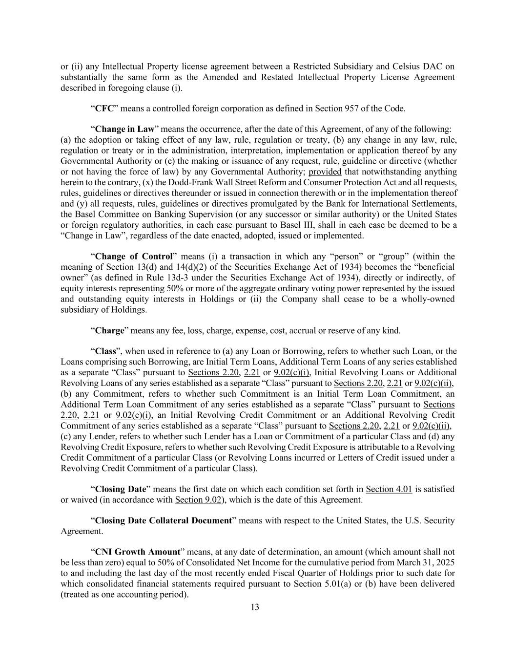 13 or (ii) any Intellectual Property license agreement between a Restricted Subsidiary and Celsius DAC on substantially the same form as the Amended and Restated Intellectual Property License Agreement described in foregoing clause (i). “CFC” means a controlled foreign corporation as defined in Section 957 of the Code. “Change in Law” means the occurrence, after the date of this Agreement, of any of the following: (a) the adoption or taking effect of any law, rule, regulation or treaty, (b) any change in any law, rule, regulation or treaty or in the administration, interpretation, implementation or application thereof by any Governmental Authority or (c) the making or issuance of any request, rule, guideline or directive (whether or not having the force of law) by any Governmental Authority; provided that notwithstanding anything herein to the contrary, (x) the Dodd-Frank Wall Street Reform and Consumer Protection Act and all requests, rules, guidelines or directives thereunder or issued in connection therewith or in the implementation thereof and (y) all requests, rules, guidelines or directives promulgated by the Bank for International Settlements, the Basel Committee on Banking Supervision (or any successor or similar authority) or the United States or foreign regulatory authorities, in each case pursuant to Basel III, shall in each case be deemed to be a “Change in Law”, regardless of the date enacted, adopted, issued or implemented. “Change of Control” means (i) a transaction in which any “person” or “group” (within the meaning of Section 13(d) and 14(d)(2) of the Securities Exchange Act of 1934) becomes the “beneficial owner” (as defined in Rule 13d-3 under the Securities Exchange Act of 1934), directly or indirectly, of equity interests representing 50% or more of the aggregate ordinary voting power represented by the issued and outstanding equity interests in Holdings or (ii) the Company shall cease to be a wholly-owned subsidiary of Holdings. “Charge” means any fee, loss, charge, expense, cost, accrual or reserve of any kind. “Class”, when used in reference to (a) any Loan or Borrowing, refers to whether such Loan, or the Loans comprising such Borrowing, are Initial Term Loans, Additional Term Loans of any series established as a separate “Class” pursuant to Sections 2.20, 2.21 or 9.02(c)(i), Initial Revolving Loans or Additional Revolving Loans of any series established as a separate “Class” pursuant to Sections 2.20, 2.21 or 9.02(c)(ii), (b) any Commitment, refers to whether such Commitment is an Initial Term Loan Commitment, an Additional Term Loan Commitment of any series established as a separate “Class” pursuant to Sections 2.20, 2.21 or 9.02(c)(i), an Initial Revolving Credit Commitment or an Additional Revolving Credit Commitment of any series established as a separate “Class” pursuant to Sections 2.20, 2.21 or 9.02(c)(ii), (c) any Lender, refers to whether such Lender has a Loan or Commitment of a particular Class and (d) any Revolving Credit Exposure, refers to whether such Revolving Credit Exposure is attributable to a Revolving Credit Commitment of a particular Class (or Revolving Loans incurred or Letters of Credit issued under a Revolving Credit Commitment of a particular Class). “Closing Date” means the first date on which each condition set forth in Section 4.01 is satisfied or waived (in accordance with Section 9.02), which is the date of this Agreement. “Closing Date Collateral Document” means with respect to the United States, the U.S. Security Agreement. “CNI Growth Amount” means, at any date of determination, an amount (which amount shall not be less than zero) equal to 50% of Consolidated Net Income for the cumulative period from March 31, 2025 to and including the last day of the most recently ended Fiscal Quarter of Holdings prior to such date for which consolidated financial statements required pursuant to Section 5.01(a) or (b) have been delivered (treated as one accounting period).