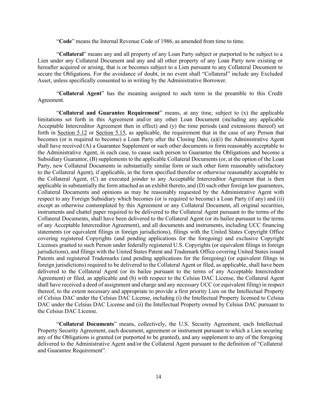 14 “Code” means the Internal Revenue Code of 1986, as amended from time to time. “Collateral” means any and all property of any Loan Party subject or purported to be subject to a Lien under any Collateral Document and any and all other property of any Loan Party now existing or hereafter acquired or arising, that is or becomes subject to a Lien pursuant to any Collateral Document to secure the Obligations. For the avoidance of doubt, in no event shall “Collateral” include any Excluded Asset, unless specifically consented to in writing by the Administrative Borrower. “Collateral Agent” has the meaning assigned to such term in the preamble to this Credit Agreement. “Collateral and Guarantee Requirement” means, at any time, subject to (x) the applicable limitations set forth in this Agreement and/or any other Loan Document (including any applicable Acceptable Intercreditor Agreement then in effect) and (y) the time periods (and extensions thereof) set forth in Section 5.12 or Section 5.15, as applicable, the requirement that in the case of any Person that becomes (or is required to become) a Loan Party after the Closing Date, (a)(i) the Administrative Agent shall have received (A) a Guarantee Supplement or such other documents in form reasonably acceptable to the Administrative Agent, in each case, to cause such person to Guarantee the Obligations and become a Subsidiary Guarantor, (B) supplements to the applicable Collateral Documents (or, at the option of the Loan Party, new Collateral Documents in substantially similar form or such other form reasonably satisfactory to the Collateral Agent), if applicable, in the form specified therefor or otherwise reasonably acceptable to the Collateral Agent, (C) an executed joinder to any Acceptable Intercreditor Agreement that is then applicable in substantially the form attached as an exhibit thereto, and (D) such other foreign law guarantees, Collateral Documents and opinions as may be reasonably requested by the Administrative Agent with respect to any Foreign Subsidiary which becomes (or is required to become) a Loan Party (if any) and (ii) except as otherwise contemplated by this Agreement or any Collateral Document, all original securities, instruments and chattel paper required to be delivered to the Collateral Agent pursuant to the terms of the Collateral Documents, shall have been delivered to the Collateral Agent (or its bailee pursuant to the terms of any Acceptable Intercreditor Agreement), and all documents and instruments, including UCC financing statements (or equivalent filings in foreign jurisdictions), filings with the United States Copyright Office covering registered Copyrights (and pending applications for the foregoing) and exclusive Copyright Licenses granted to such Person under federally registered U.S. Copyrights (or equivalent filings in foreign jurisdictions), and filings with the United States Patent and Trademark Office covering United States issued Patents and registered Trademarks (and pending applications for the foregoing) (or equivalent filings in foreign jurisdictions) required to be delivered to the Collateral Agent or filed, as applicable, shall have been delivered to the Collateral Agent (or its bailee pursuant to the terms of any Acceptable Intercreditor Agreement) or filed, as applicable and (b) with respect to the Celsius DAC License, the Collateral Agent shall have received a deed of assignment and charge and any necessary UCC (or equivalent filing) in respect thereof, to the extent necessary and appropriate to provide a first priority Lien on the Intellectual Property of Celsius DAC under the Celsius DAC License, including (i) the Intellectual Property licensed to Celsius DAC under the Celsius DAC License and (ii) the Intellectual Property owned by Celsius DAC pursuant to the Celsius DAC License. “Collateral Documents” means, collectively, the U.S. Security Agreement, each Intellectual Property Security Agreement, each document, agreement or instrument pursuant to which a Lien securing any of the Obligations is granted (or purported to be granted), and any supplement to any of the foregoing delivered to the Administrative Agent and/or the Collateral Agent pursuant to the definition of “Collateral and Guarantee Requirement”.
