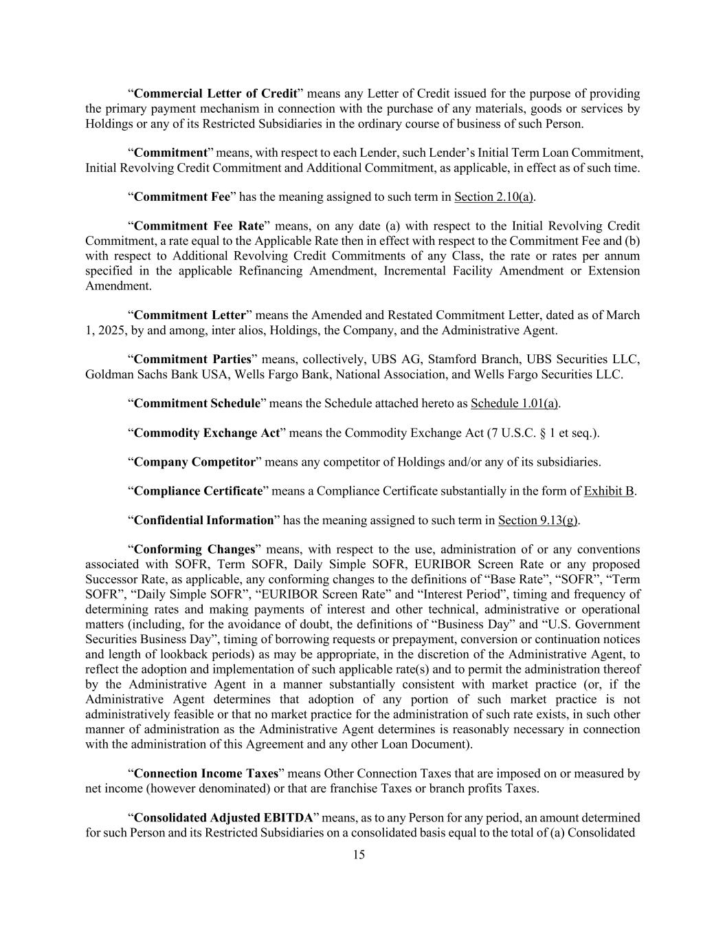 15 “Commercial Letter of Credit” means any Letter of Credit issued for the purpose of providing the primary payment mechanism in connection with the purchase of any materials, goods or services by Holdings or any of its Restricted Subsidiaries in the ordinary course of business of such Person. “Commitment” means, with respect to each Lender, such Lender’s Initial Term Loan Commitment, Initial Revolving Credit Commitment and Additional Commitment, as applicable, in effect as of such time. “Commitment Fee” has the meaning assigned to such term in Section 2.10(a). “Commitment Fee Rate” means, on any date (a) with respect to the Initial Revolving Credit Commitment, a rate equal to the Applicable Rate then in effect with respect to the Commitment Fee and (b) with respect to Additional Revolving Credit Commitments of any Class, the rate or rates per annum specified in the applicable Refinancing Amendment, Incremental Facility Amendment or Extension Amendment. “Commitment Letter” means the Amended and Restated Commitment Letter, dated as of March 1, 2025, by and among, inter alios, Holdings, the Company, and the Administrative Agent. “Commitment Parties” means, collectively, UBS AG, Stamford Branch, UBS Securities LLC, Goldman Sachs Bank USA, Wells Fargo Bank, National Association, and Wells Fargo Securities LLC. “Commitment Schedule” means the Schedule attached hereto as Schedule 1.01(a). “Commodity Exchange Act” means the Commodity Exchange Act (7 U.S.C. § 1 et seq.). “Company Competitor” means any competitor of Holdings and/or any of its subsidiaries. “Compliance Certificate” means a Compliance Certificate substantially in the form of Exhibit B. “Confidential Information” has the meaning assigned to such term in Section 9.13(g). “Conforming Changes” means, with respect to the use, administration of or any conventions associated with SOFR, Term SOFR, Daily Simple SOFR, EURIBOR Screen Rate or any proposed Successor Rate, as applicable, any conforming changes to the definitions of “Base Rate”, “SOFR”, “Term SOFR”, “Daily Simple SOFR”, “EURIBOR Screen Rate” and “Interest Period”, timing and frequency of determining rates and making payments of interest and other technical, administrative or operational matters (including, for the avoidance of doubt, the definitions of “Business Day” and “U.S. Government Securities Business Day”, timing of borrowing requests or prepayment, conversion or continuation notices and length of lookback periods) as may be appropriate, in the discretion of the Administrative Agent, to reflect the adoption and implementation of such applicable rate(s) and to permit the administration thereof by the Administrative Agent in a manner substantially consistent with market practice (or, if the Administrative Agent determines that adoption of any portion of such market practice is not administratively feasible or that no market practice for the administration of such rate exists, in such other manner of administration as the Administrative Agent determines is reasonably necessary in connection with the administration of this Agreement and any other Loan Document). “Connection Income Taxes” means Other Connection Taxes that are imposed on or measured by net income (however denominated) or that are franchise Taxes or branch profits Taxes. “Consolidated Adjusted EBITDA” means, as to any Person for any period, an amount determined for such Person and its Restricted Subsidiaries on a consolidated basis equal to the total of (a) Consolidated
