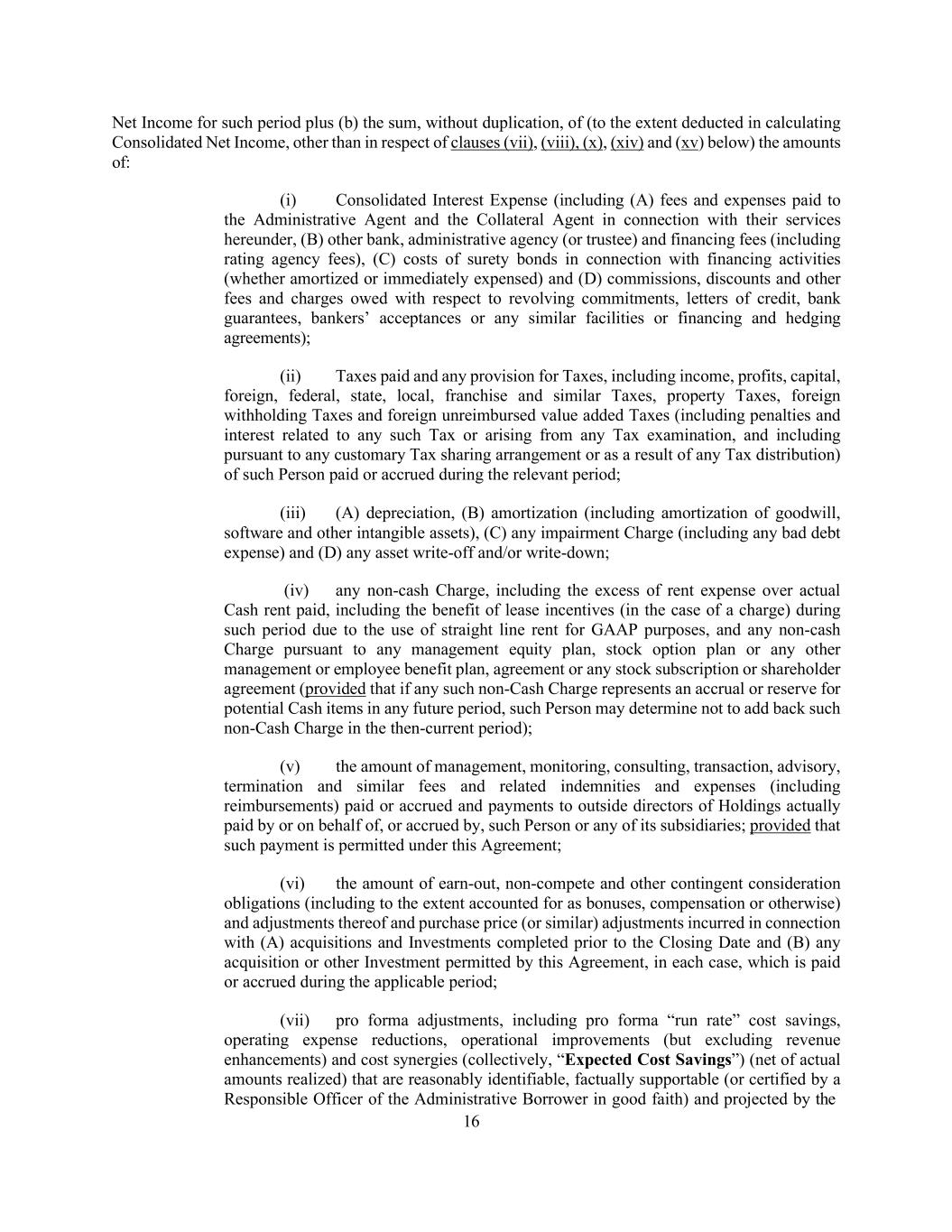 16 Net Income for such period plus (b) the sum, without duplication, of (to the extent deducted in calculating Consolidated Net Income, other than in respect of clauses (vii), (viii), (x), (xiv) and (xv) below) the amounts of: (i) Consolidated Interest Expense (including (A) fees and expenses paid to the Administrative Agent and the Collateral Agent in connection with their services hereunder, (B) other bank, administrative agency (or trustee) and financing fees (including rating agency fees), (C) costs of surety bonds in connection with financing activities (whether amortized or immediately expensed) and (D) commissions, discounts and other fees and charges owed with respect to revolving commitments, letters of credit, bank guarantees, bankers’ acceptances or any similar facilities or financing and hedging agreements); (ii) Taxes paid and any provision for Taxes, including income, profits, capital, foreign, federal, state, local, franchise and similar Taxes, property Taxes, foreign withholding Taxes and foreign unreimbursed value added Taxes (including penalties and interest related to any such Tax or arising from any Tax examination, and including pursuant to any customary Tax sharing arrangement or as a result of any Tax distribution) of such Person paid or accrued during the relevant period; (iii) (A) depreciation, (B) amortization (including amortization of goodwill, software and other intangible assets), (C) any impairment Charge (including any bad debt expense) and (D) any asset write-off and/or write-down; (iv) any non-cash Charge, including the excess of rent expense over actual Cash rent paid, including the benefit of lease incentives (in the case of a charge) during such period due to the use of straight line rent for GAAP purposes, and any non-cash Charge pursuant to any management equity plan, stock option plan or any other management or employee benefit plan, agreement or any stock subscription or shareholder agreement (provided that if any such non-Cash Charge represents an accrual or reserve for potential Cash items in any future period, such Person may determine not to add back such non-Cash Charge in the then-current period); (v) the amount of management, monitoring, consulting, transaction, advisory, termination and similar fees and related indemnities and expenses (including reimbursements) paid or accrued and payments to outside directors of Holdings actually paid by or on behalf of, or accrued by, such Person or any of its subsidiaries; provided that such payment is permitted under this Agreement; (vi) the amount of earn-out, non-compete and other contingent consideration obligations (including to the extent accounted for as bonuses, compensation or otherwise) and adjustments thereof and purchase price (or similar) adjustments incurred in connection with (A) acquisitions and Investments completed prior to the Closing Date and (B) any acquisition or other Investment permitted by this Agreement, in each case, which is paid or accrued during the applicable period; (vii) pro forma adjustments, including pro forma “run rate” cost savings, operating expense reductions, operational improvements (but excluding revenue enhancements) and cost synergies (collectively, “Expected Cost Savings”) (net of actual amounts realized) that are reasonably identifiable, factually supportable (or certified by a Responsible Officer of the Administrative Borrower in good faith) and projected by the