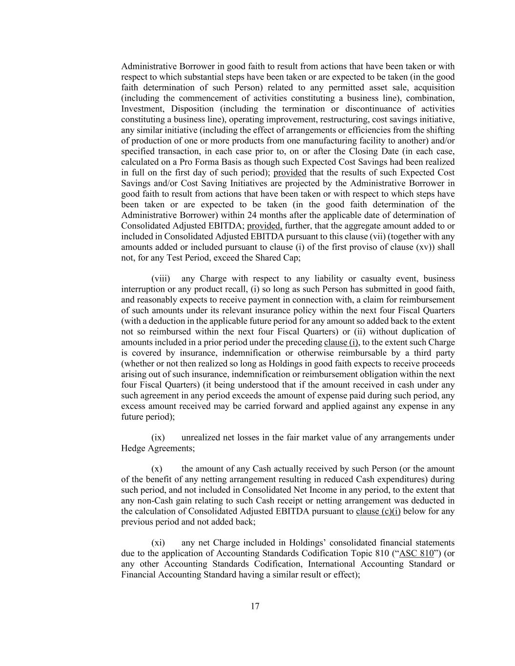 17 Administrative Borrower in good faith to result from actions that have been taken or with respect to which substantial steps have been taken or are expected to be taken (in the good faith determination of such Person) related to any permitted asset sale, acquisition (including the commencement of activities constituting a business line), combination, Investment, Disposition (including the termination or discontinuance of activities constituting a business line), operating improvement, restructuring, cost savings initiative, any similar initiative (including the effect of arrangements or efficiencies from the shifting of production of one or more products from one manufacturing facility to another) and/or specified transaction, in each case prior to, on or after the Closing Date (in each case, calculated on a Pro Forma Basis as though such Expected Cost Savings had been realized in full on the first day of such period); provided that the results of such Expected Cost Savings and/or Cost Saving Initiatives are projected by the Administrative Borrower in good faith to result from actions that have been taken or with respect to which steps have been taken or are expected to be taken (in the good faith determination of the Administrative Borrower) within 24 months after the applicable date of determination of Consolidated Adjusted EBITDA; provided, further, that the aggregate amount added to or included in Consolidated Adjusted EBITDA pursuant to this clause (vii) (together with any amounts added or included pursuant to clause (i) of the first proviso of clause (xv)) shall not, for any Test Period, exceed the Shared Cap; (viii) any Charge with respect to any liability or casualty event, business interruption or any product recall, (i) so long as such Person has submitted in good faith, and reasonably expects to receive payment in connection with, a claim for reimbursement of such amounts under its relevant insurance policy within the next four Fiscal Quarters (with a deduction in the applicable future period for any amount so added back to the extent not so reimbursed within the next four Fiscal Quarters) or (ii) without duplication of amounts included in a prior period under the preceding clause (i), to the extent such Charge is covered by insurance, indemnification or otherwise reimbursable by a third party (whether or not then realized so long as Holdings in good faith expects to receive proceeds arising out of such insurance, indemnification or reimbursement obligation within the next four Fiscal Quarters) (it being understood that if the amount received in cash under any such agreement in any period exceeds the amount of expense paid during such period, any excess amount received may be carried forward and applied against any expense in any future period); (ix) unrealized net losses in the fair market value of any arrangements under Hedge Agreements; (x) the amount of any Cash actually received by such Person (or the amount of the benefit of any netting arrangement resulting in reduced Cash expenditures) during such period, and not included in Consolidated Net Income in any period, to the extent that any non-Cash gain relating to such Cash receipt or netting arrangement was deducted in the calculation of Consolidated Adjusted EBITDA pursuant to clause (c)(i) below for any previous period and not added back; (xi) any net Charge included in Holdings’ consolidated financial statements due to the application of Accounting Standards Codification Topic 810 (“ASC 810”) (or any other Accounting Standards Codification, International Accounting Standard or Financial Accounting Standard having a similar result or effect);