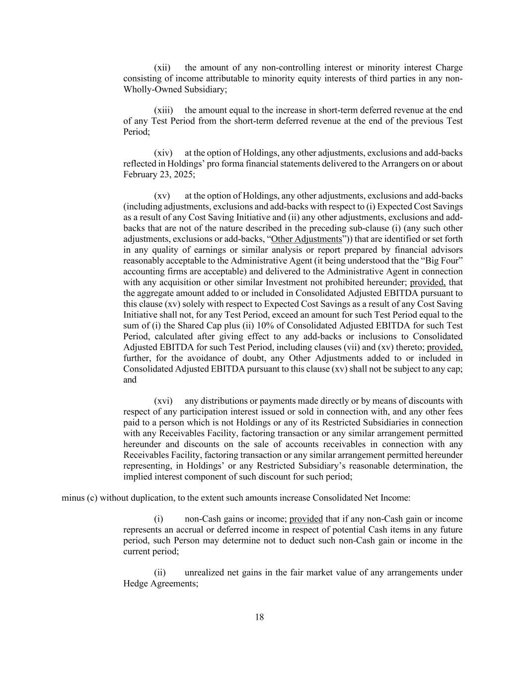 18 (xii) the amount of any non-controlling interest or minority interest Charge consisting of income attributable to minority equity interests of third parties in any non- Wholly-Owned Subsidiary; (xiii) the amount equal to the increase in short-term deferred revenue at the end of any Test Period from the short-term deferred revenue at the end of the previous Test Period; (xiv) at the option of Holdings, any other adjustments, exclusions and add-backs reflected in Holdings’ pro forma financial statements delivered to the Arrangers on or about February 23, 2025; (xv) at the option of Holdings, any other adjustments, exclusions and add-backs (including adjustments, exclusions and add-backs with respect to (i) Expected Cost Savings as a result of any Cost Saving Initiative and (ii) any other adjustments, exclusions and add- backs that are not of the nature described in the preceding sub-clause (i) (any such other adjustments, exclusions or add-backs, “Other Adjustments”)) that are identified or set forth in any quality of earnings or similar analysis or report prepared by financial advisors reasonably acceptable to the Administrative Agent (it being understood that the “Big Four” accounting firms are acceptable) and delivered to the Administrative Agent in connection with any acquisition or other similar Investment not prohibited hereunder; provided, that the aggregate amount added to or included in Consolidated Adjusted EBITDA pursuant to this clause (xv) solely with respect to Expected Cost Savings as a result of any Cost Saving Initiative shall not, for any Test Period, exceed an amount for such Test Period equal to the sum of (i) the Shared Cap plus (ii) 10% of Consolidated Adjusted EBITDA for such Test Period, calculated after giving effect to any add-backs or inclusions to Consolidated Adjusted EBITDA for such Test Period, including clauses (vii) and (xv) thereto; provided, further, for the avoidance of doubt, any Other Adjustments added to or included in Consolidated Adjusted EBITDA pursuant to this clause (xv) shall not be subject to any cap; and (xvi) any distributions or payments made directly or by means of discounts with respect of any participation interest issued or sold in connection with, and any other fees paid to a person which is not Holdings or any of its Restricted Subsidiaries in connection with any Receivables Facility, factoring transaction or any similar arrangement permitted hereunder and discounts on the sale of accounts receivables in connection with any Receivables Facility, factoring transaction or any similar arrangement permitted hereunder representing, in Holdings’ or any Restricted Subsidiary’s reasonable determination, the implied interest component of such discount for such period; minus (c) without duplication, to the extent such amounts increase Consolidated Net Income: (i) non-Cash gains or income; provided that if any non-Cash gain or income represents an accrual or deferred income in respect of potential Cash items in any future period, such Person may determine not to deduct such non-Cash gain or income in the current period; (ii) unrealized net gains in the fair market value of any arrangements under Hedge Agreements;