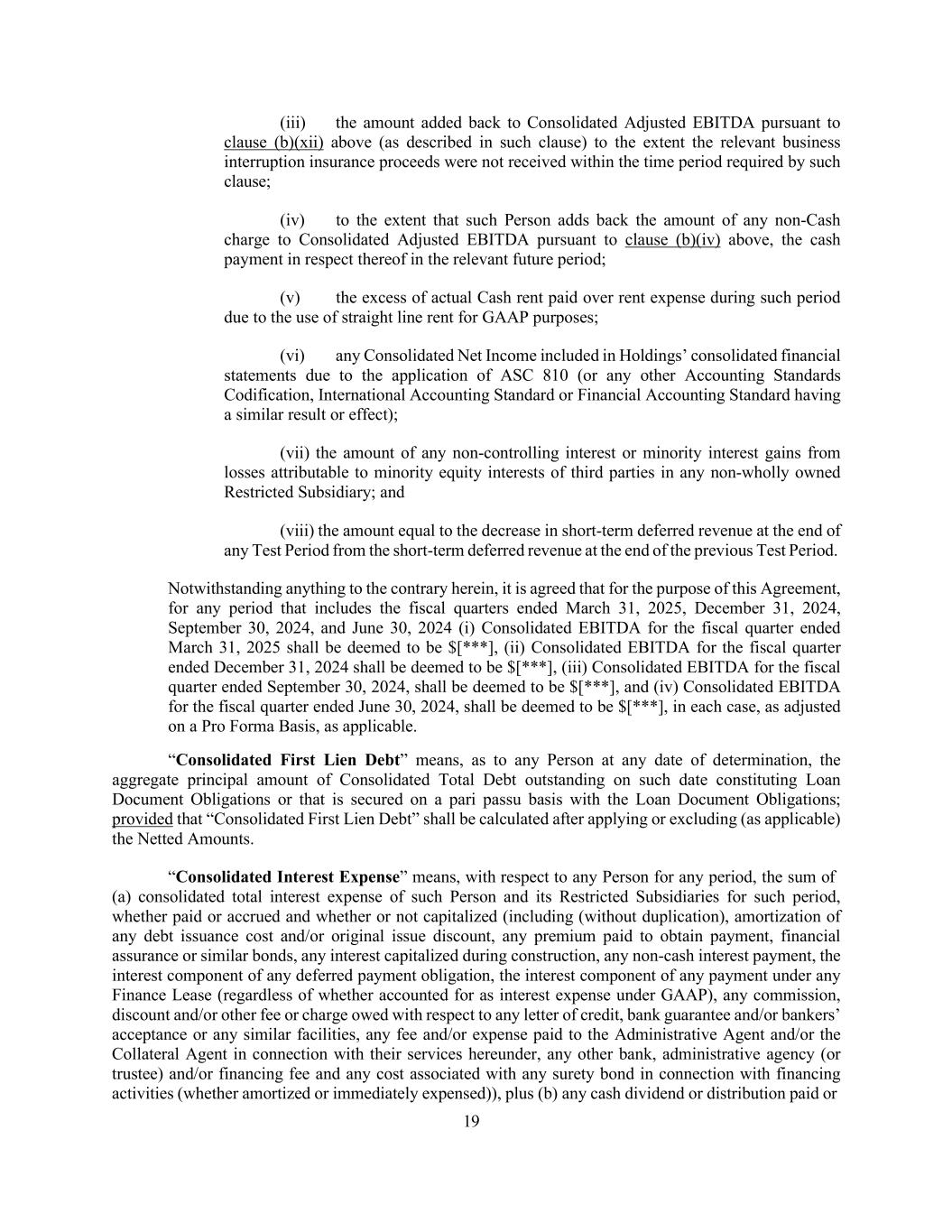 19 (iii) the amount added back to Consolidated Adjusted EBITDA pursuant to clause (b)(xii) above (as described in such clause) to the extent the relevant business interruption insurance proceeds were not received within the time period required by such clause; (iv) to the extent that such Person adds back the amount of any non-Cash charge to Consolidated Adjusted EBITDA pursuant to clause (b)(iv) above, the cash payment in respect thereof in the relevant future period; (v) the excess of actual Cash rent paid over rent expense during such period due to the use of straight line rent for GAAP purposes; (vi) any Consolidated Net Income included in Holdings’ consolidated financial statements due to the application of ASC 810 (or any other Accounting Standards Codification, International Accounting Standard or Financial Accounting Standard having a similar result or effect); (vii) the amount of any non-controlling interest or minority interest gains from losses attributable to minority equity interests of third parties in any non-wholly owned Restricted Subsidiary; and (viii) the amount equal to the decrease in short-term deferred revenue at the end of any Test Period from the short-term deferred revenue at the end of the previous Test Period. Notwithstanding anything to the contrary herein, it is agreed that for the purpose of this Agreement, for any period that includes the fiscal quarters ended March 31, 2025, December 31, 2024, September 30, 2024, and June 30, 2024 (i) Consolidated EBITDA for the fiscal quarter ended March 31, 2025 shall be deemed to be $[***], (ii) Consolidated EBITDA for the fiscal quarter ended December 31, 2024 shall be deemed to be $[***], (iii) Consolidated EBITDA for the fiscal quarter ended September 30, 2024, shall be deemed to be $[***], and (iv) Consolidated EBITDA for the fiscal quarter ended June 30, 2024, shall be deemed to be $[***], in each case, as adjusted on a Pro Forma Basis, as applicable. “Consolidated First Lien Debt” means, as to any Person at any date of determination, the aggregate principal amount of Consolidated Total Debt outstanding on such date constituting Loan Document Obligations or that is secured on a pari passu basis with the Loan Document Obligations; provided that “Consolidated First Lien Debt” shall be calculated after applying or excluding (as applicable) the Netted Amounts. “Consolidated Interest Expense” means, with respect to any Person for any period, the sum of (a) consolidated total interest expense of such Person and its Restricted Subsidiaries for such period, whether paid or accrued and whether or not capitalized (including (without duplication), amortization of any debt issuance cost and/or original issue discount, any premium paid to obtain payment, financial assurance or similar bonds, any interest capitalized during construction, any non-cash interest payment, the interest component of any deferred payment obligation, the interest component of any payment under any Finance Lease (regardless of whether accounted for as interest expense under GAAP), any commission, discount and/or other fee or charge owed with respect to any letter of credit, bank guarantee and/or bankers’ acceptance or any similar facilities, any fee and/or expense paid to the Administrative Agent and/or the Collateral Agent in connection with their services hereunder, any other bank, administrative agency (or trustee) and/or financing fee and any cost associated with any surety bond in connection with financing activities (whether amortized or immediately expensed)), plus (b) any cash dividend or distribution paid or