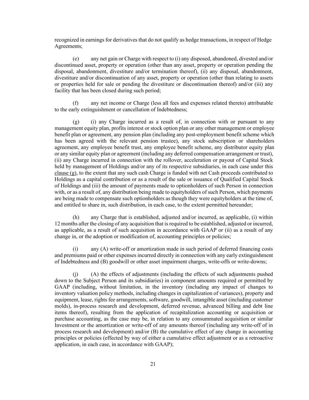 21 recognized in earnings for derivatives that do not qualify as hedge transactions, in respect of Hedge Agreements; (e) any net gain or Charge with respect to (i) any disposed, abandoned, divested and/or discontinued asset, property or operation (other than any asset, property or operation pending the disposal, abandonment, divestiture and/or termination thereof), (ii) any disposal, abandonment, divestiture and/or discontinuation of any asset, property or operation (other than relating to assets or properties held for sale or pending the divestiture or discontinuation thereof) and/or (iii) any facility that has been closed during such period; (f) any net income or Charge (less all fees and expenses related thereto) attributable to the early extinguishment or cancellation of Indebtedness; (g) (i) any Charge incurred as a result of, in connection with or pursuant to any management equity plan, profits interest or stock option plan or any other management or employee benefit plan or agreement, any pension plan (including any post-employment benefit scheme which has been agreed with the relevant pension trustee), any stock subscription or shareholders agreement, any employee benefit trust, any employee benefit scheme, any distributor equity plan or any similar equity plan or agreement (including any deferred compensation arrangement or trust), (ii) any Charge incurred in connection with the rollover, acceleration or payout of Capital Stock held by management of Holdings and/or any of its respective subsidiaries, in each case under this clause (g), to the extent that any such cash Charge is funded with net Cash proceeds contributed to Holdings as a capital contribution or as a result of the sale or issuance of Qualified Capital Stock of Holdings and (iii) the amount of payments made to optionholders of such Person in connection with, or as a result of, any distribution being made to equityholders of such Person, which payments are being made to compensate such optionholders as though they were equityholders at the time of, and entitled to share in, such distribution, in each case, to the extent permitted hereunder; (h) any Charge that is established, adjusted and/or incurred, as applicable, (i) within 12 months after the closing of any acquisition that is required to be established, adjusted or incurred, as applicable, as a result of such acquisition in accordance with GAAP or (ii) as a result of any change in, or the adoption or modification of, accounting principles or policies; (i) any (A) write-off or amortization made in such period of deferred financing costs and premiums paid or other expenses incurred directly in connection with any early extinguishment of Indebtedness and (B) goodwill or other asset impairment charges, write-offs or write-downs; (j) (A) the effects of adjustments (including the effects of such adjustments pushed down to the Subject Person and its subsidiaries) in component amounts required or permitted by GAAP (including, without limitation, in the inventory (including any impact of changes to inventory valuation policy methods, including changes in capitalization of variances), property and equipment, lease, rights fee arrangements, software, goodwill, intangible asset (including customer molds), in-process research and development, deferred revenue, advanced billing and debt line items thereof), resulting from the application of recapitalization accounting or acquisition or purchase accounting, as the case may be, in relation to any consummated acquisition or similar Investment or the amortization or write-off of any amounts thereof (including any write-off of in process research and development) and/or (B) the cumulative effect of any change in accounting principles or policies (effected by way of either a cumulative effect adjustment or as a retroactive application, in each case, in accordance with GAAP);